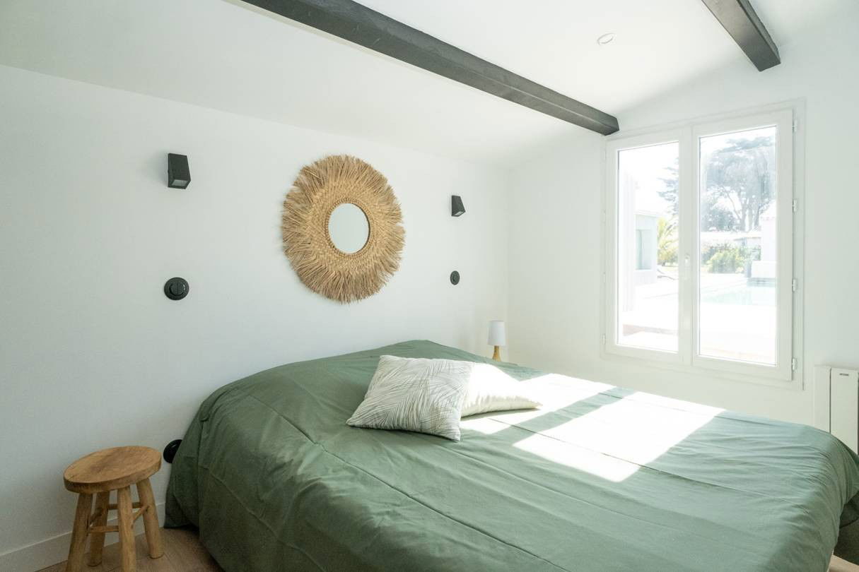 * Chambre 1 : Suite parentale donnant sur la piscine, lit 160cm, avec salle de bains privée et WC ensuite