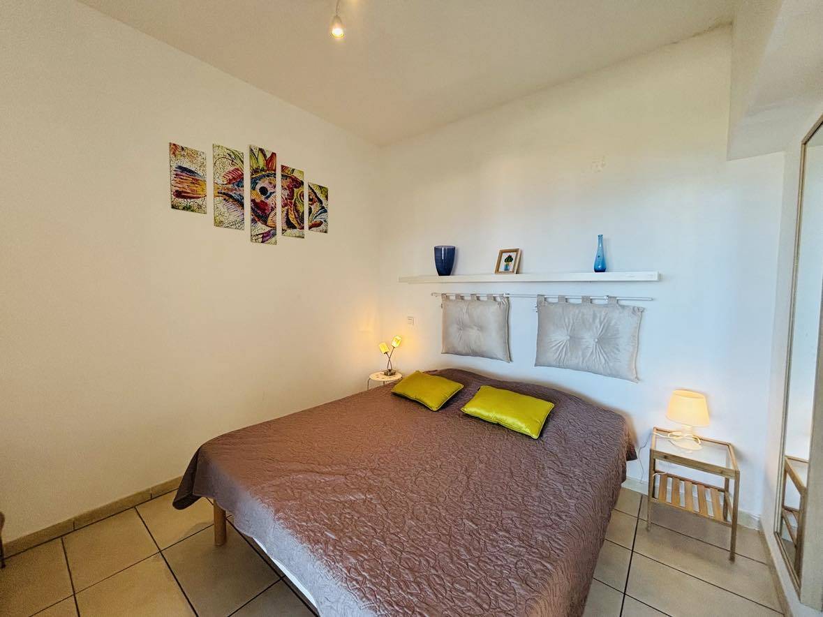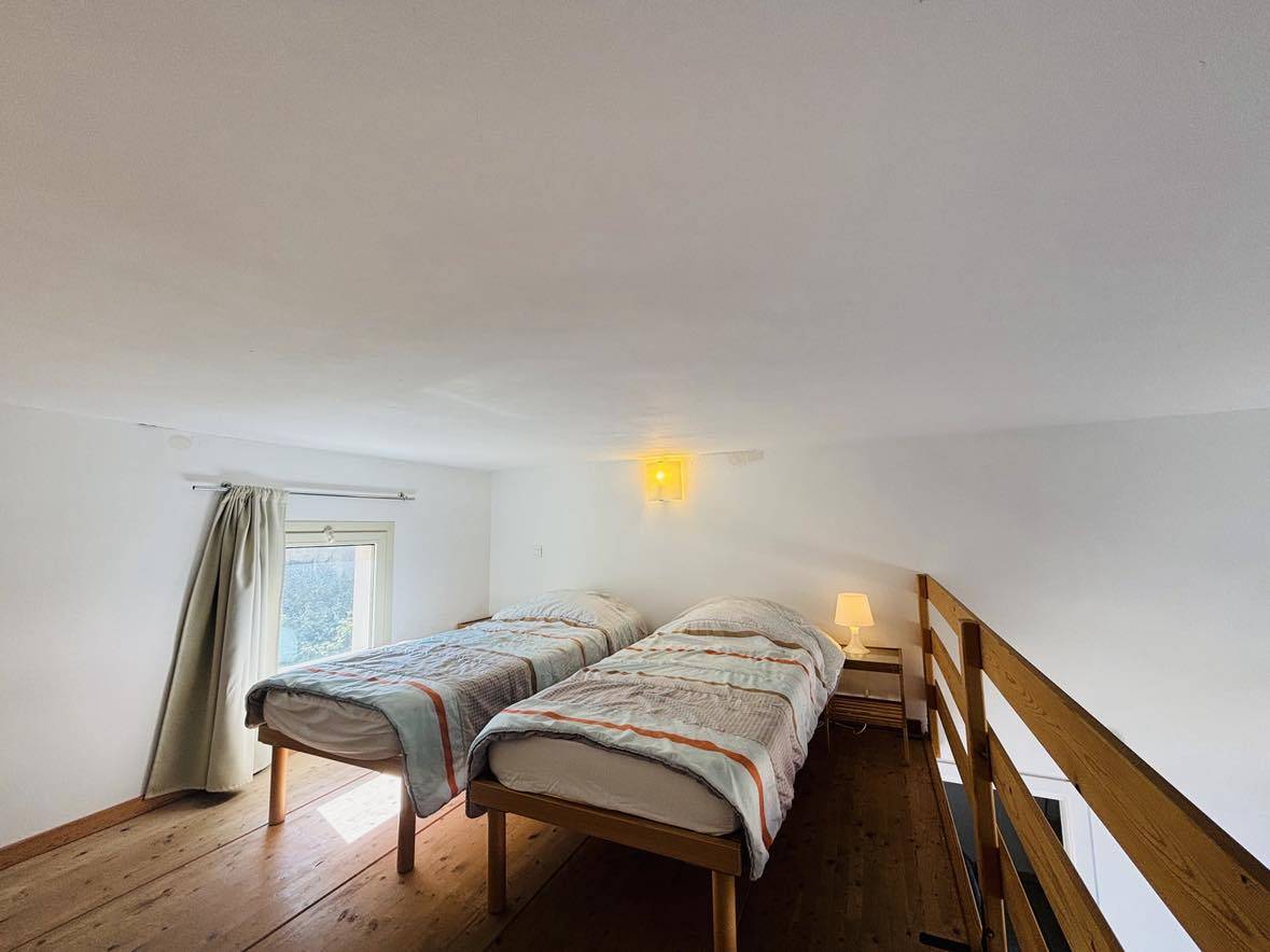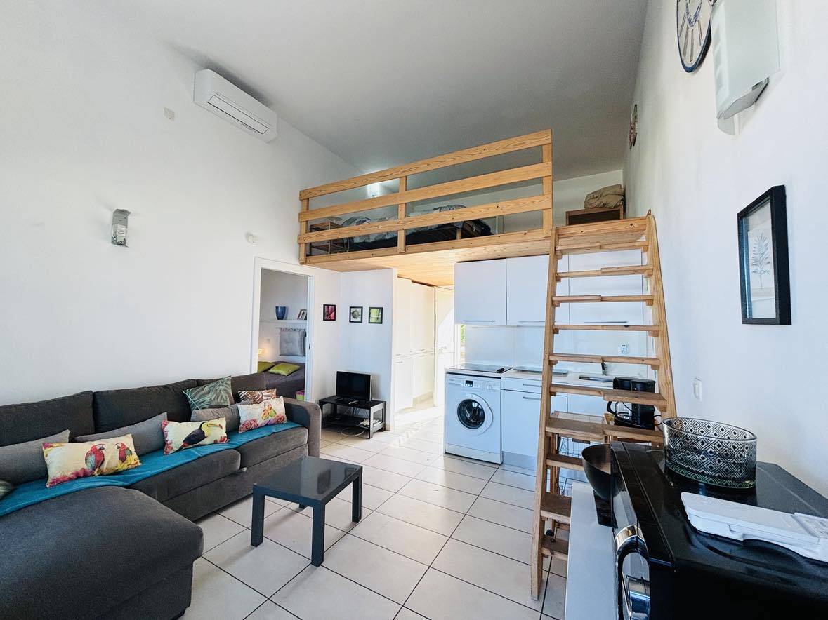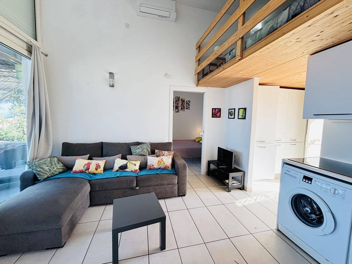 L' appartement, au rez-de-chaussée est composé d'une cuisine équipée, d'un salon, d'une salle d'eau avec WC, d'une chambre avec un lit double, d'une mezzanine avec deux lits simples.