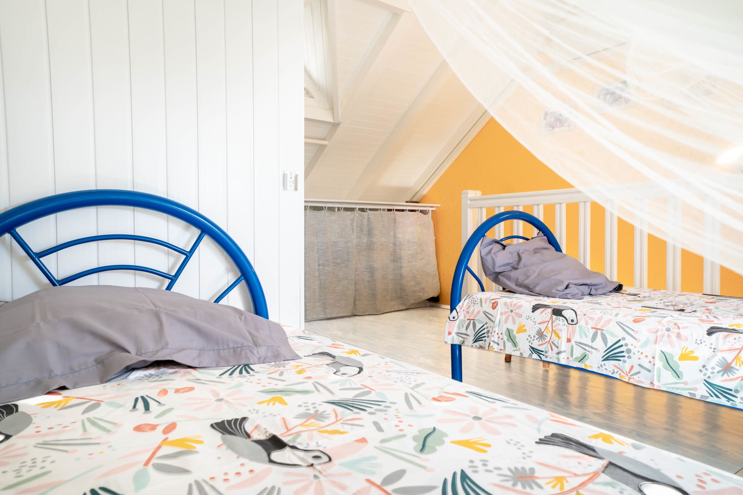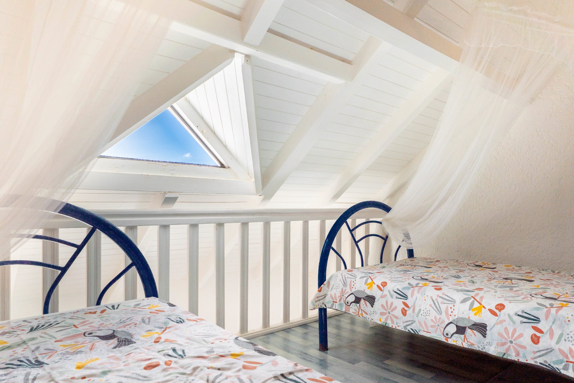 Cuisine équipée , 1 chambre climatisée vue sur jardin , et 1 chambre ventilée avec mezzanine.