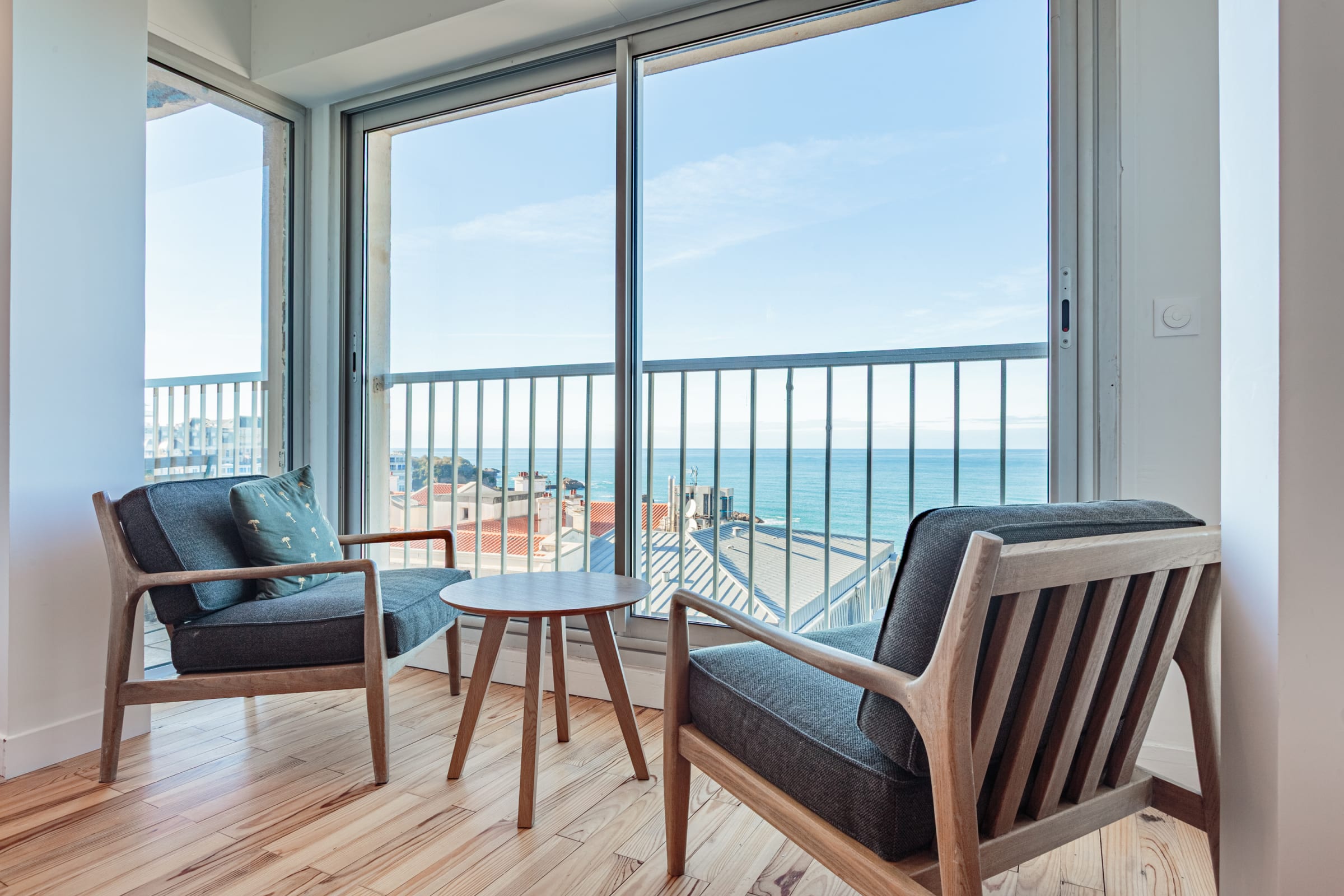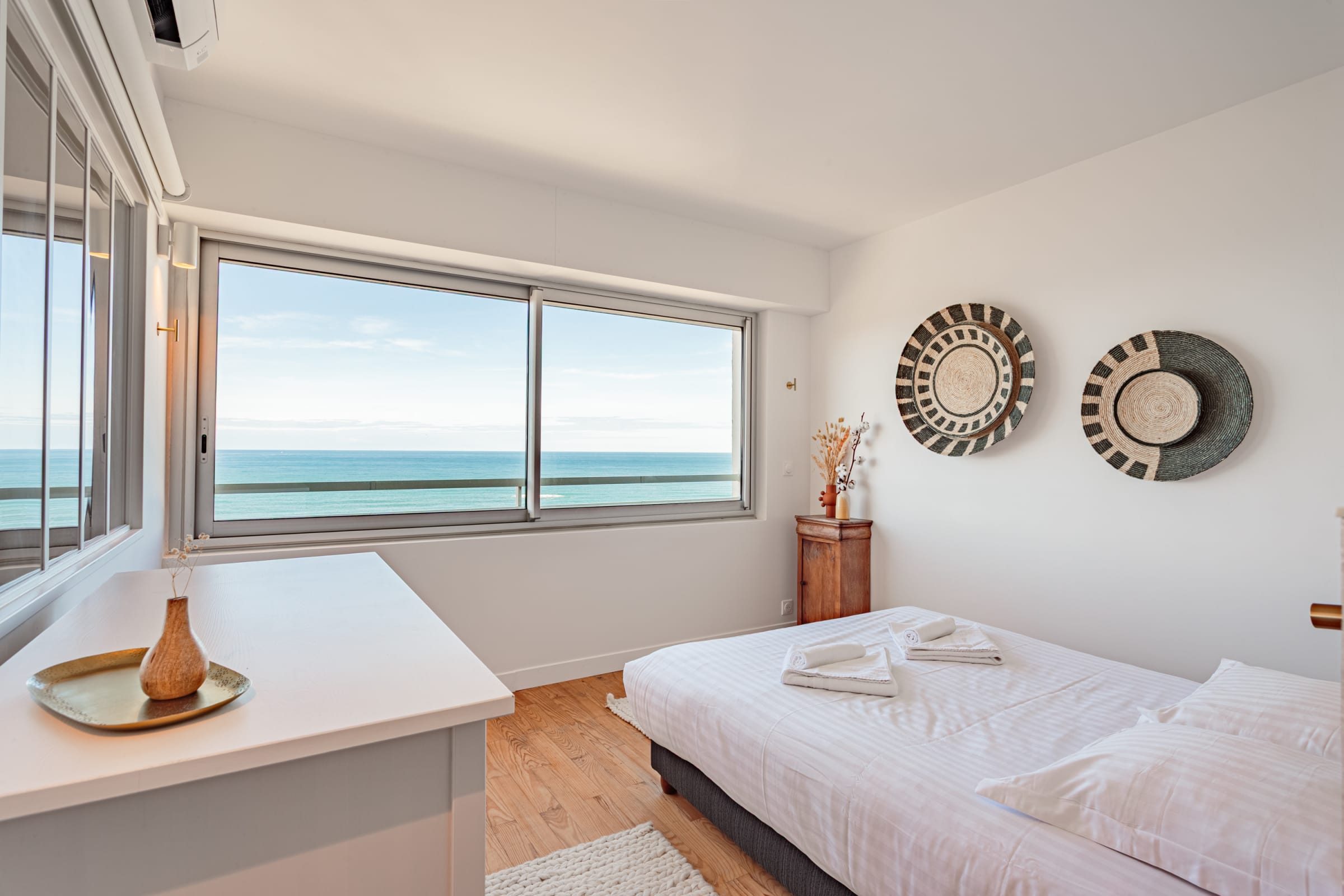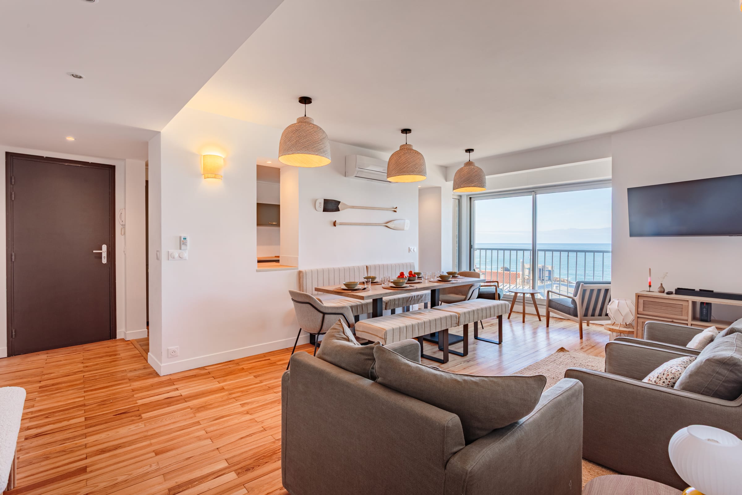- un espace de vie ouvert et lumineux comprenant un salon et une salle à manger donnant sur un balcon, avec vue sur mer depuis la grande baie vitrée,