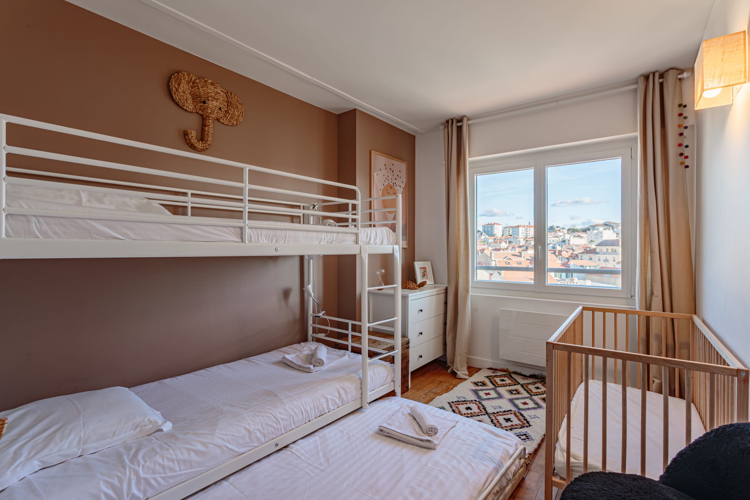 - une chambre avec un lit superposé (2 couchages simples) et un lit simple tiroir,