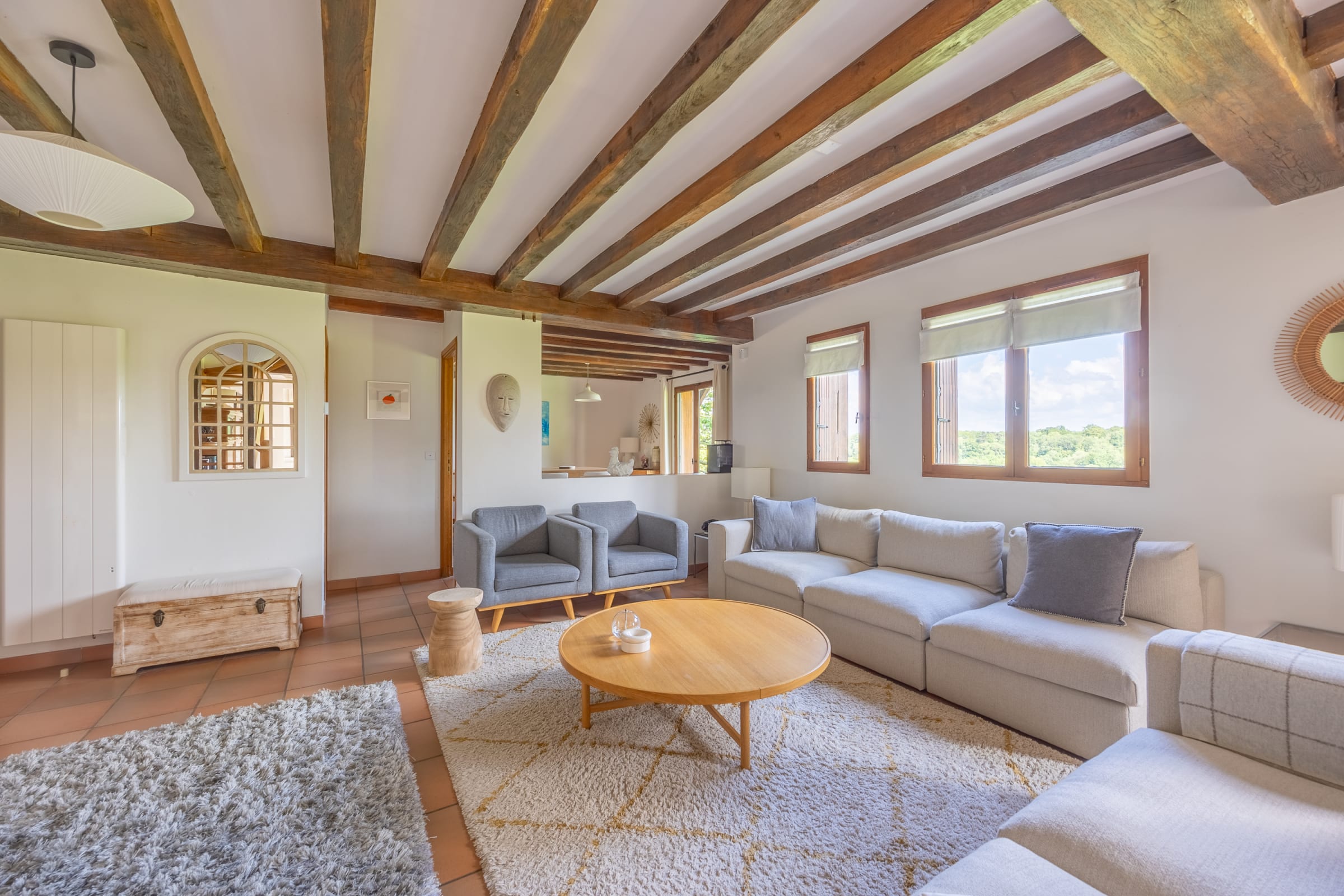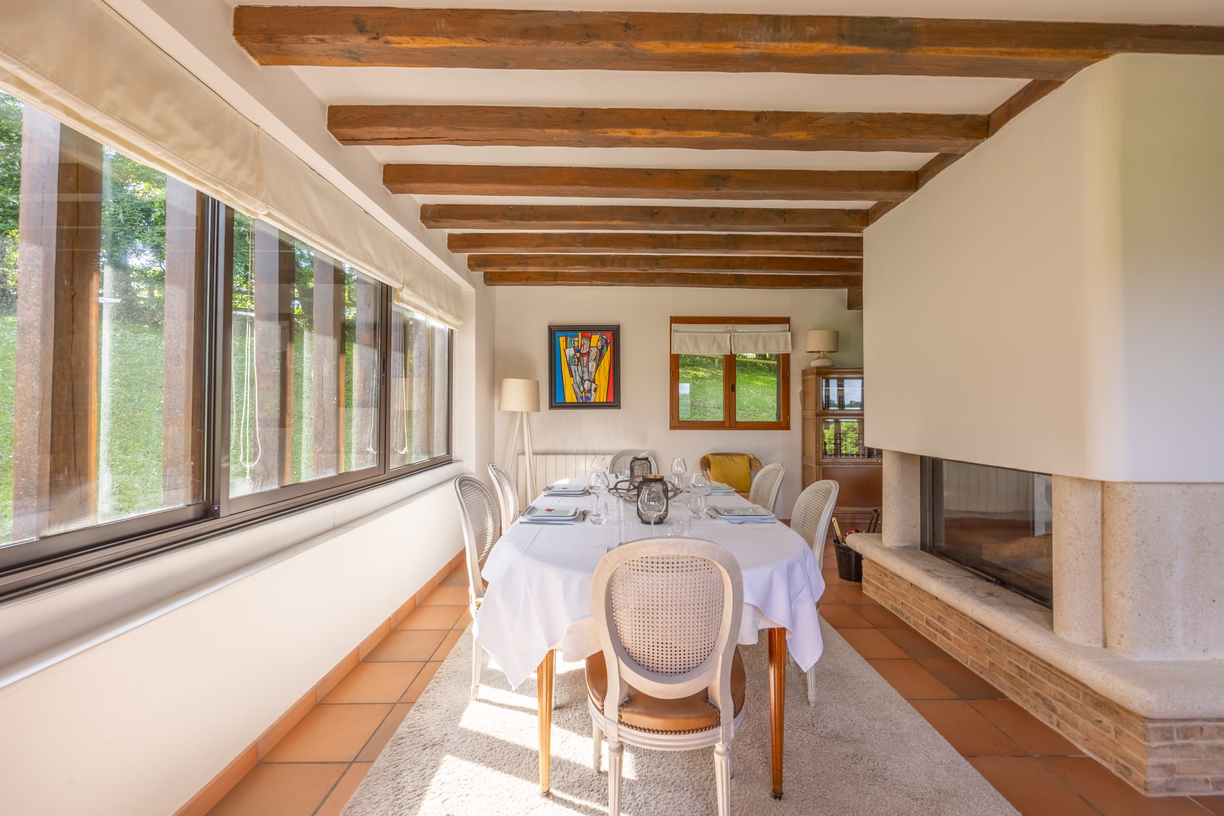 - un grand espace de vie ouvert avec salon et salle à manger, séparés par une cheminée double face,