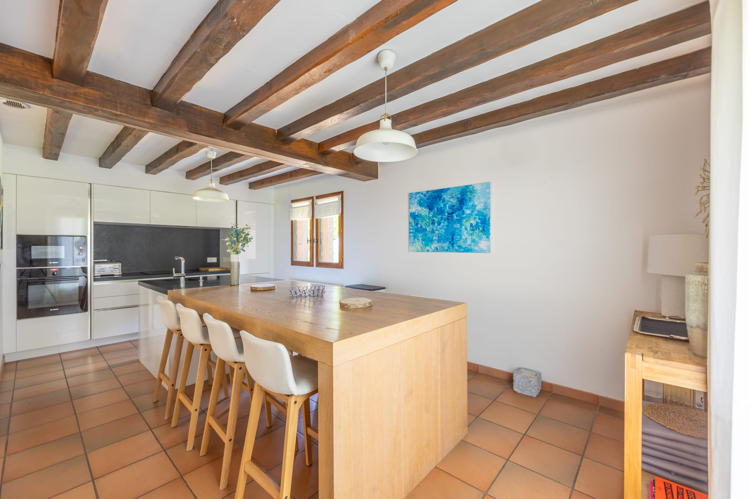 - une cuisine dinatoire ouverte équipée (machine à café, grille pain, mixeur, four, micro-ondes, plaques de cuisson, lave-vaisselle, réfrigérateur, congélateur),