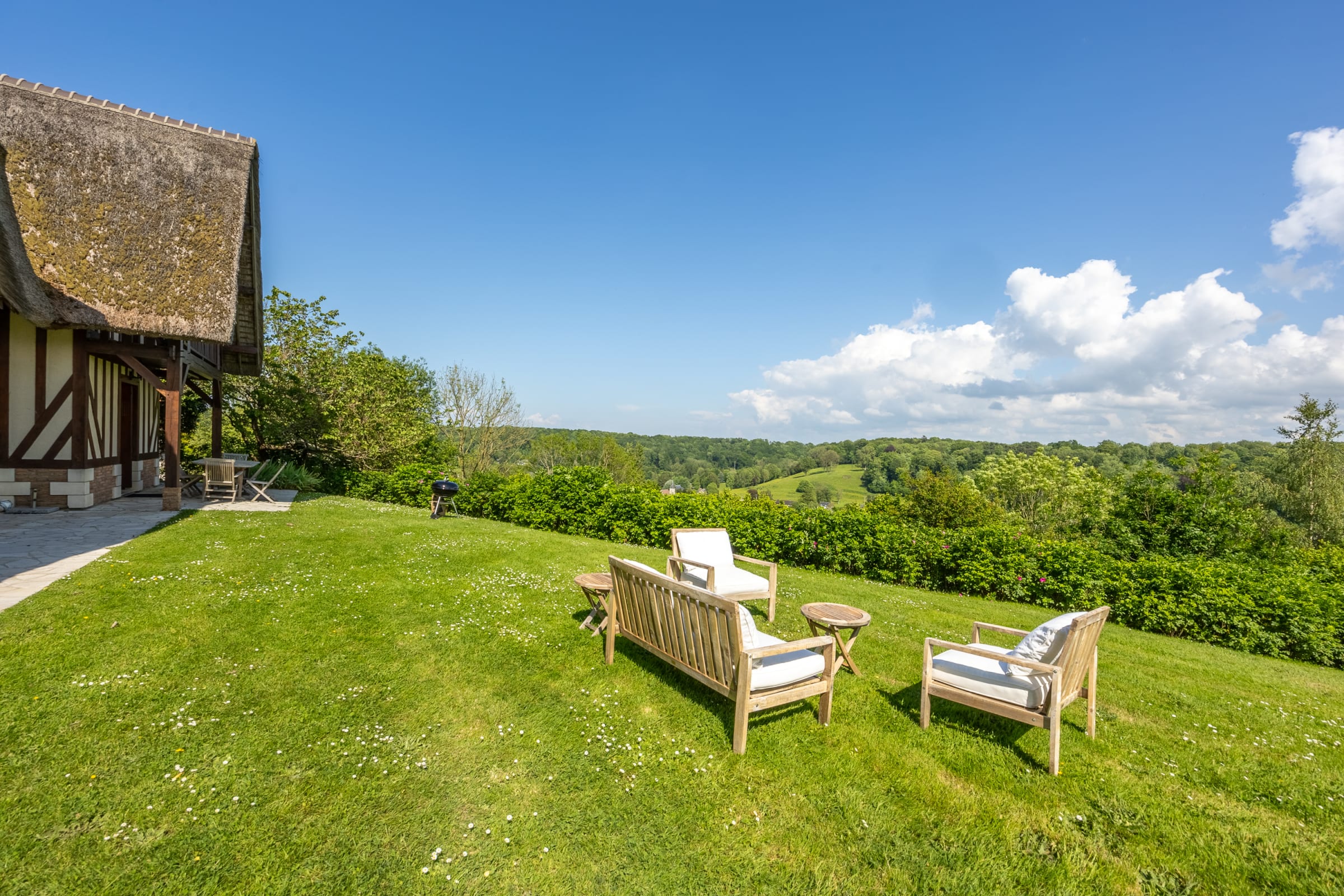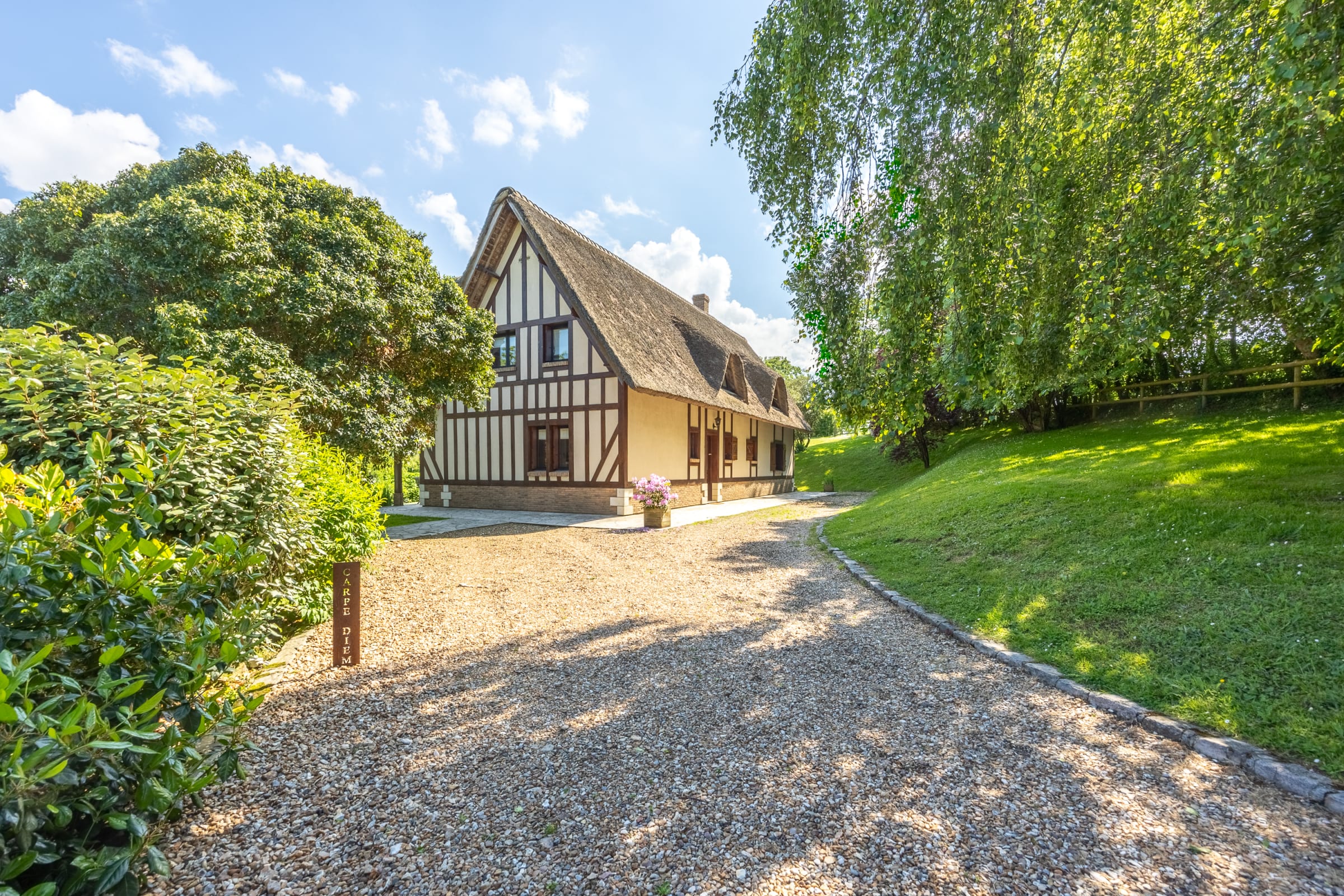 Nichée sur les hauteurs de Barneville-la-Bertran, cette maison typique normande avec colombages jouit d'une vue imprenable sur la vallée et le golf de Saint Gatien. Au milieu de son terrain de 2 hectares, la maison se compose de :
