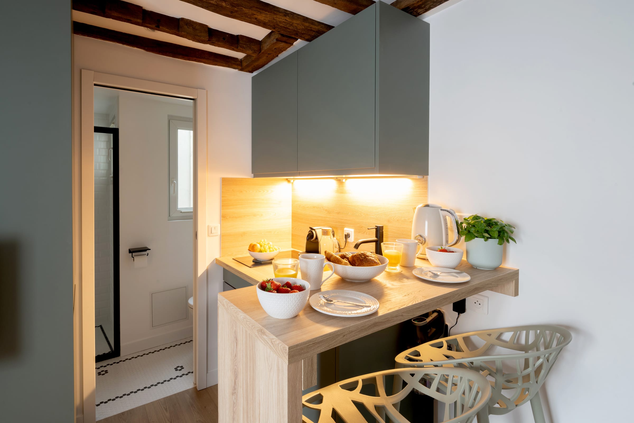- une cuisine dînatoire ouverte (machine à café, grille-pain, bouilloire, four, micro-ondes, plaques de cuisson, réfrigérateur, congélateur),