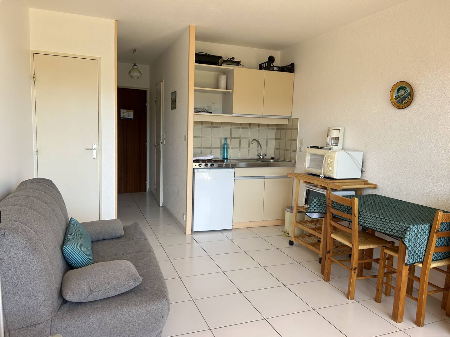 Située au 2ème étage de la résidence, cette location exposée SUD-OUEST vous offre une terrasse , un séjour avec divan convertible, une kitchenette, un coin nuit avec un petit lit simple pour enfant pour et une salle d'eau avec wc.