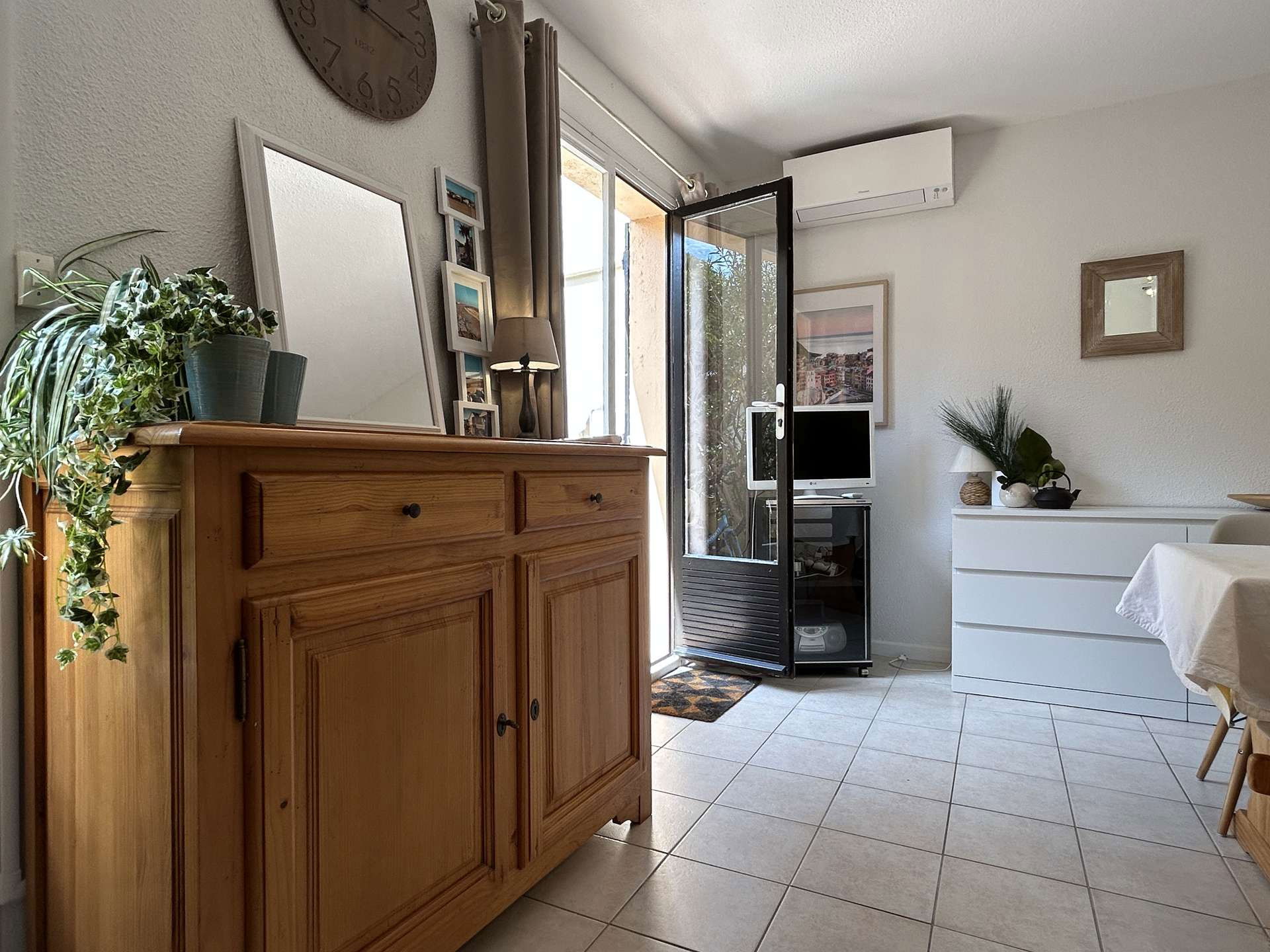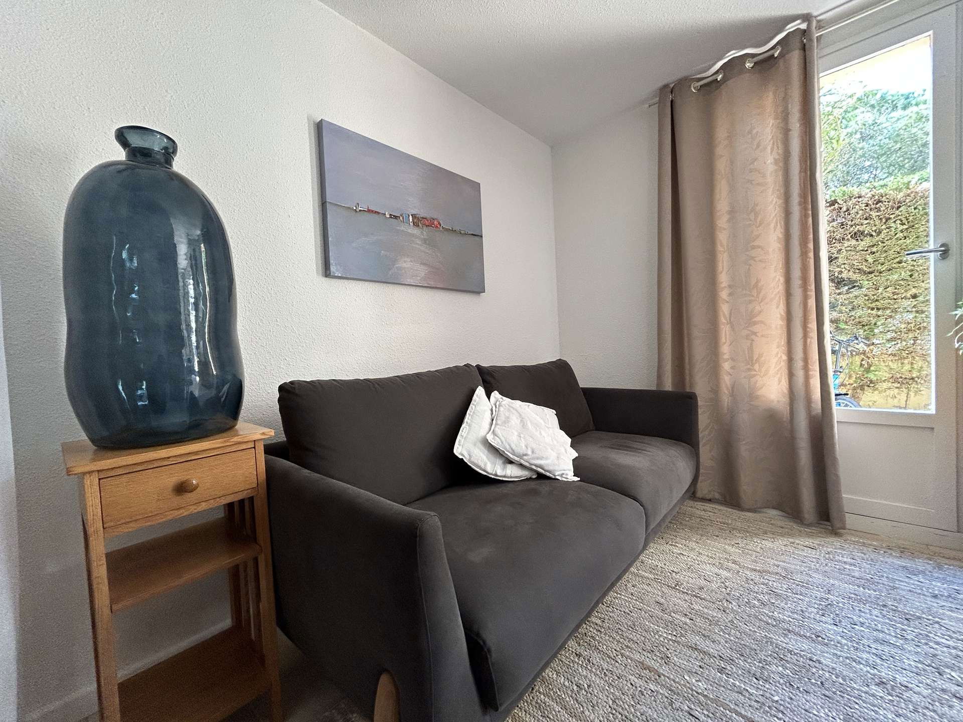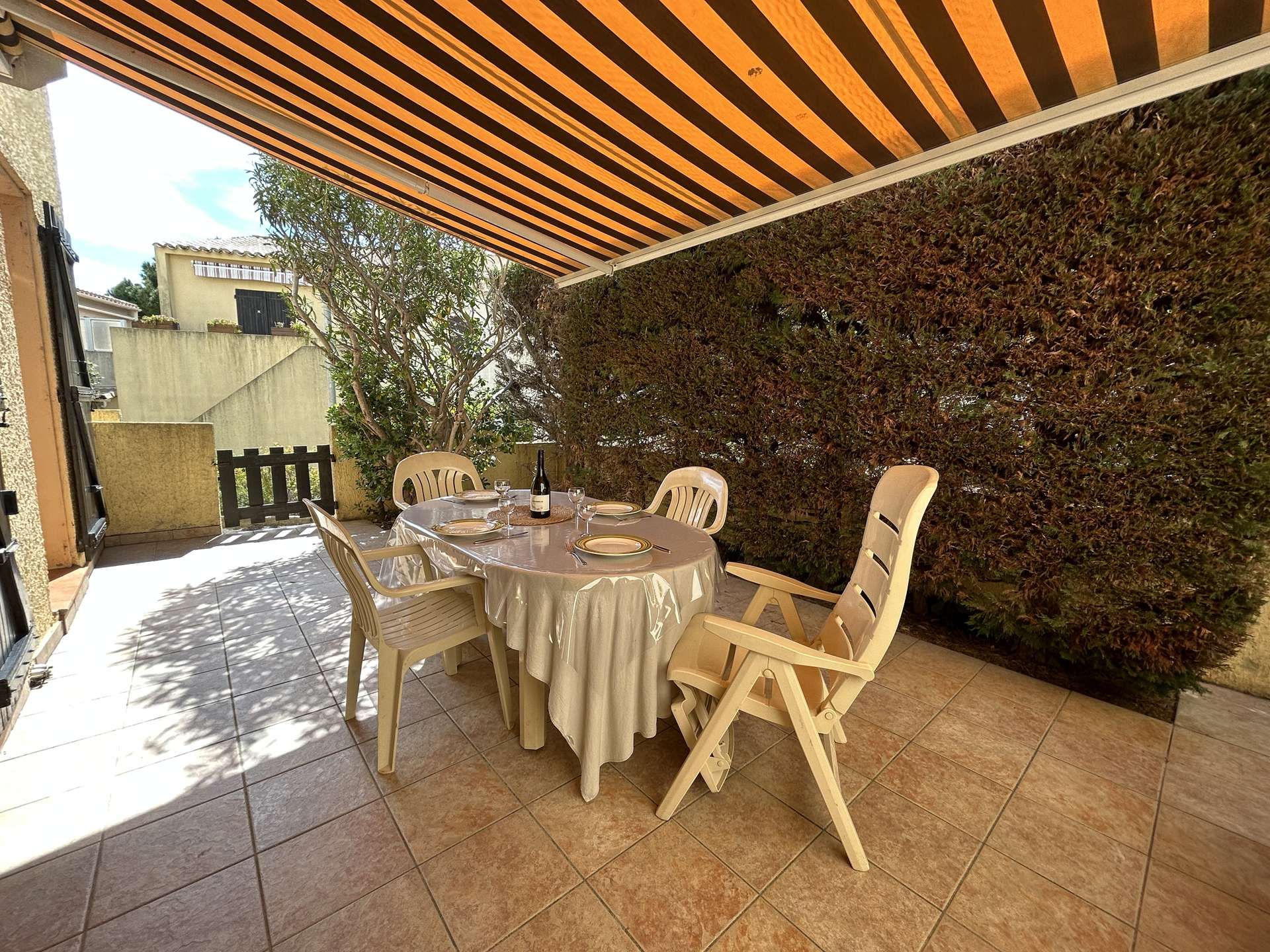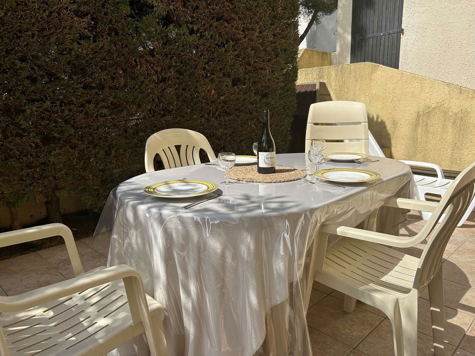 Cette location de vacances située en rez-de-chaussée et refaite à neuf est dotée d’une agréable terrasse avec son mobilier de jardin. Climatisée, elle se compose d’un séjour avec un canapé fixe et coin cuisine toute équipée (four hors d'usage), un coin nuit avec lit deux personnes en 160, une chambre meublée d’un lit deux places. Salle d’eau avec wc.