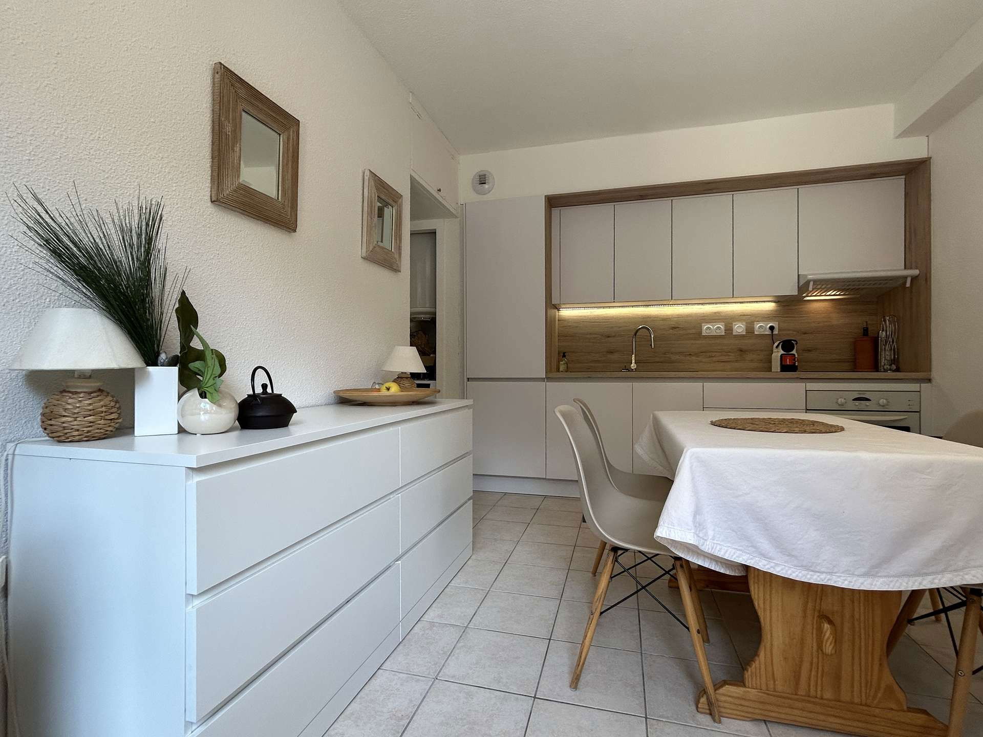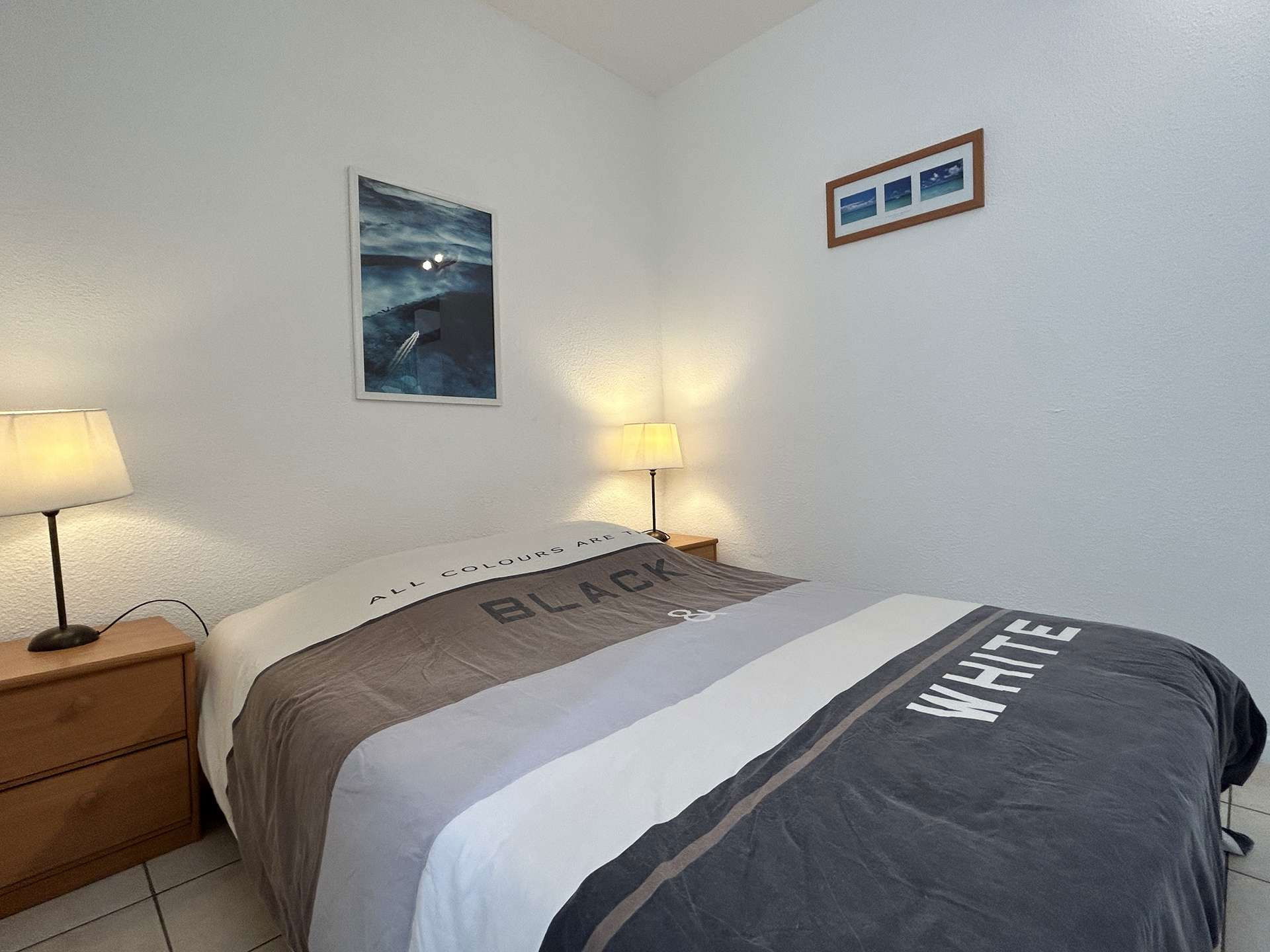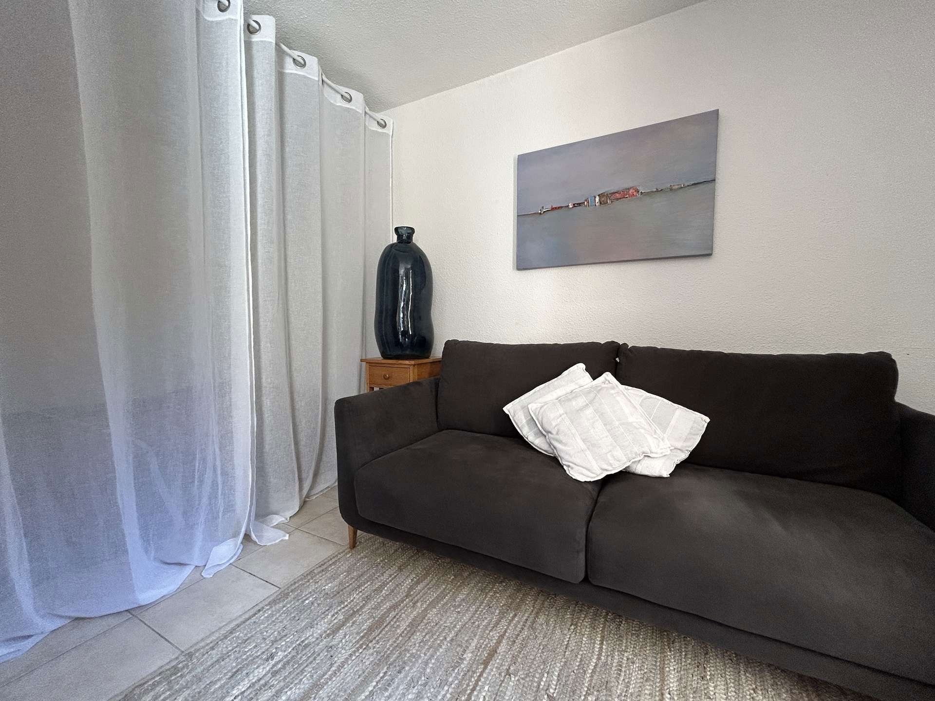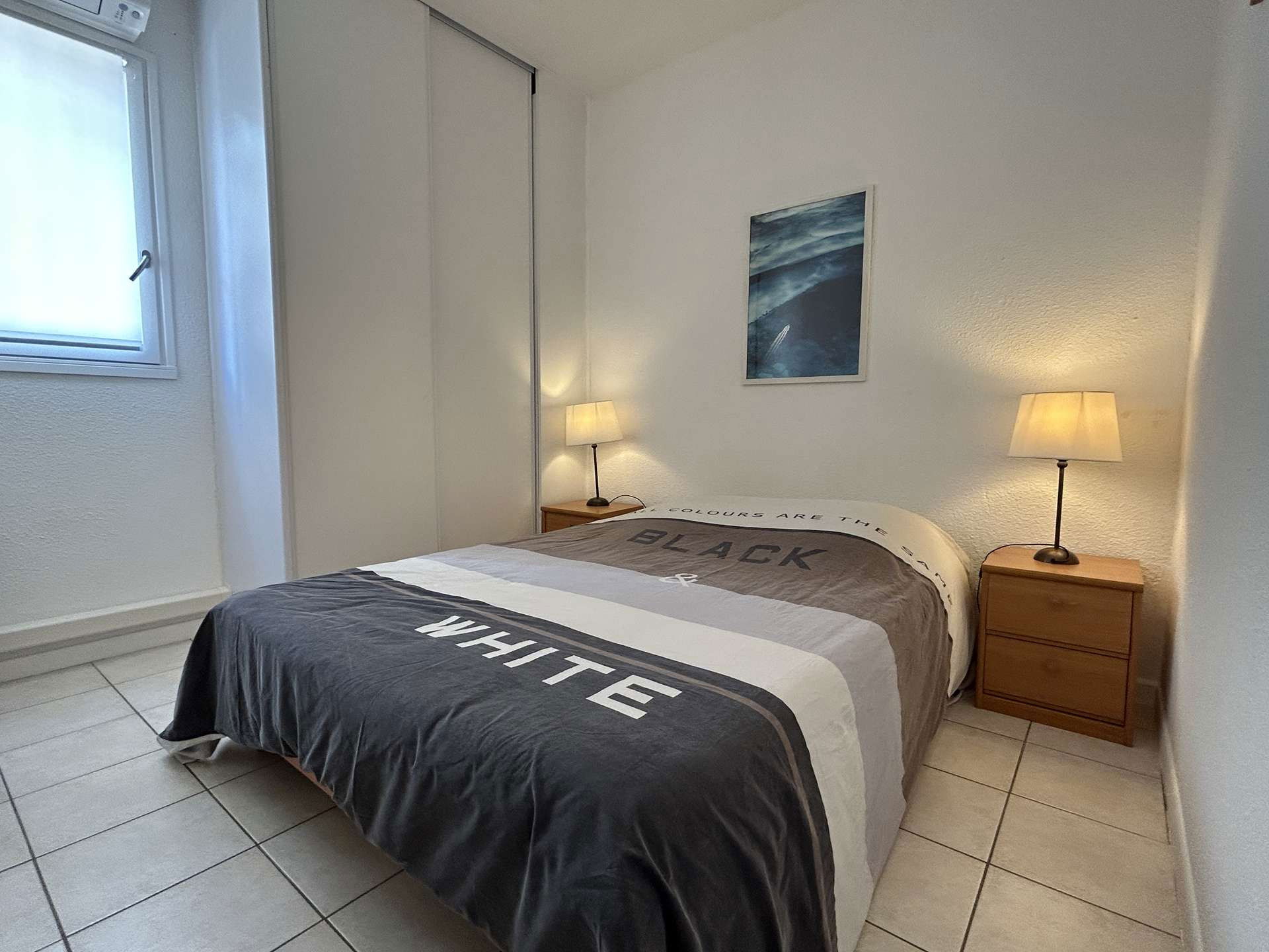 Cette location de vacances située en rez-de-chaussée et refaite à neuf est dotée d’une agréable terrasse avec son mobilier de jardin. Climatisée, elle se compose d’un séjour avec un canapé fixe et coin cuisine toute équipée (four hors d'usage), un coin nuit avec lit deux personnes en 160, une chambre meublée d’un lit deux places. Salle d’eau avec wc.