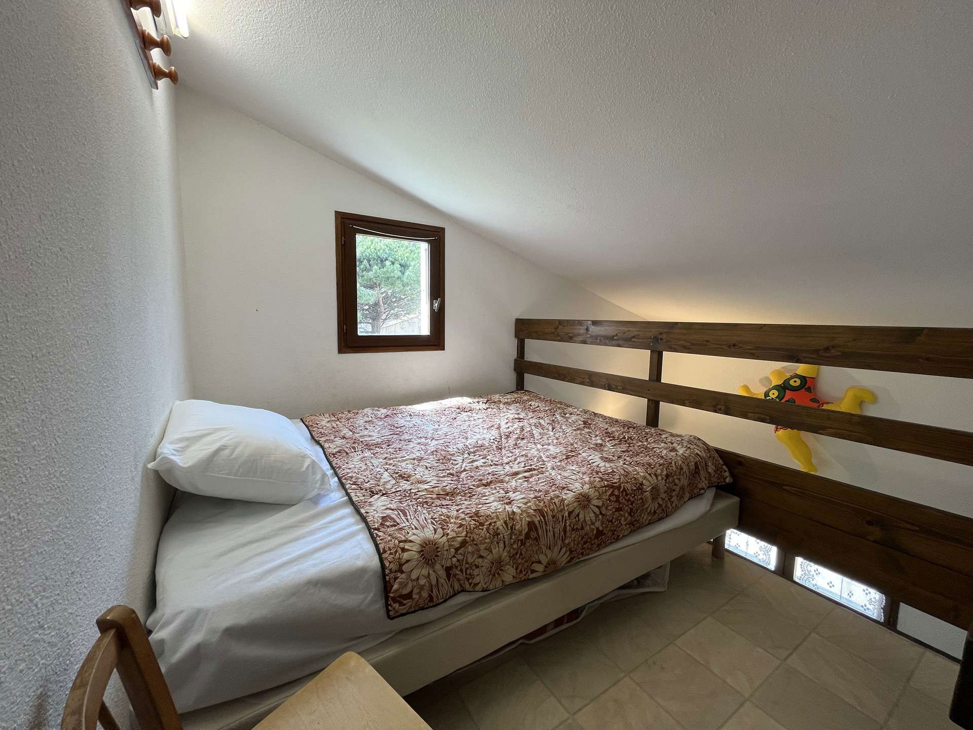 Ce pavillon de vacances est idéal pour six personnes. Il est composé en rdc d’un séjour avec espace repas et coin cuisine tout équipé, salle d’eau et wc séparés, plus une chambre avec un lit deux places. En mezzanine un couchage de 2 personnes et une chambre meublée d'un lit superposé. Belle terrasse ombragée pour prendre les repas.
