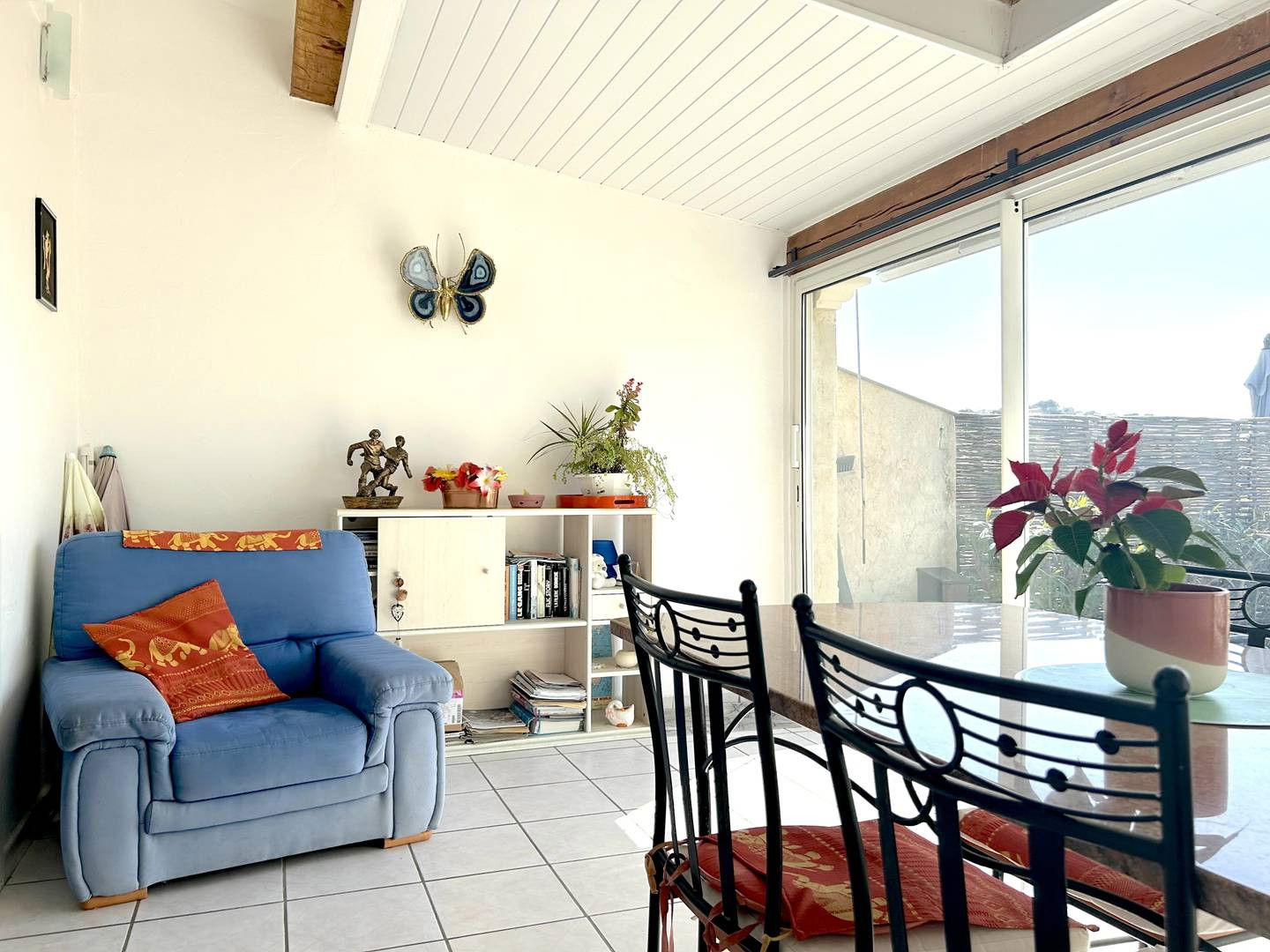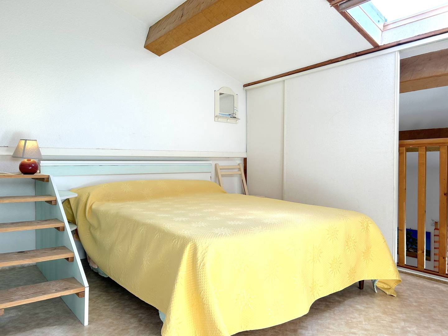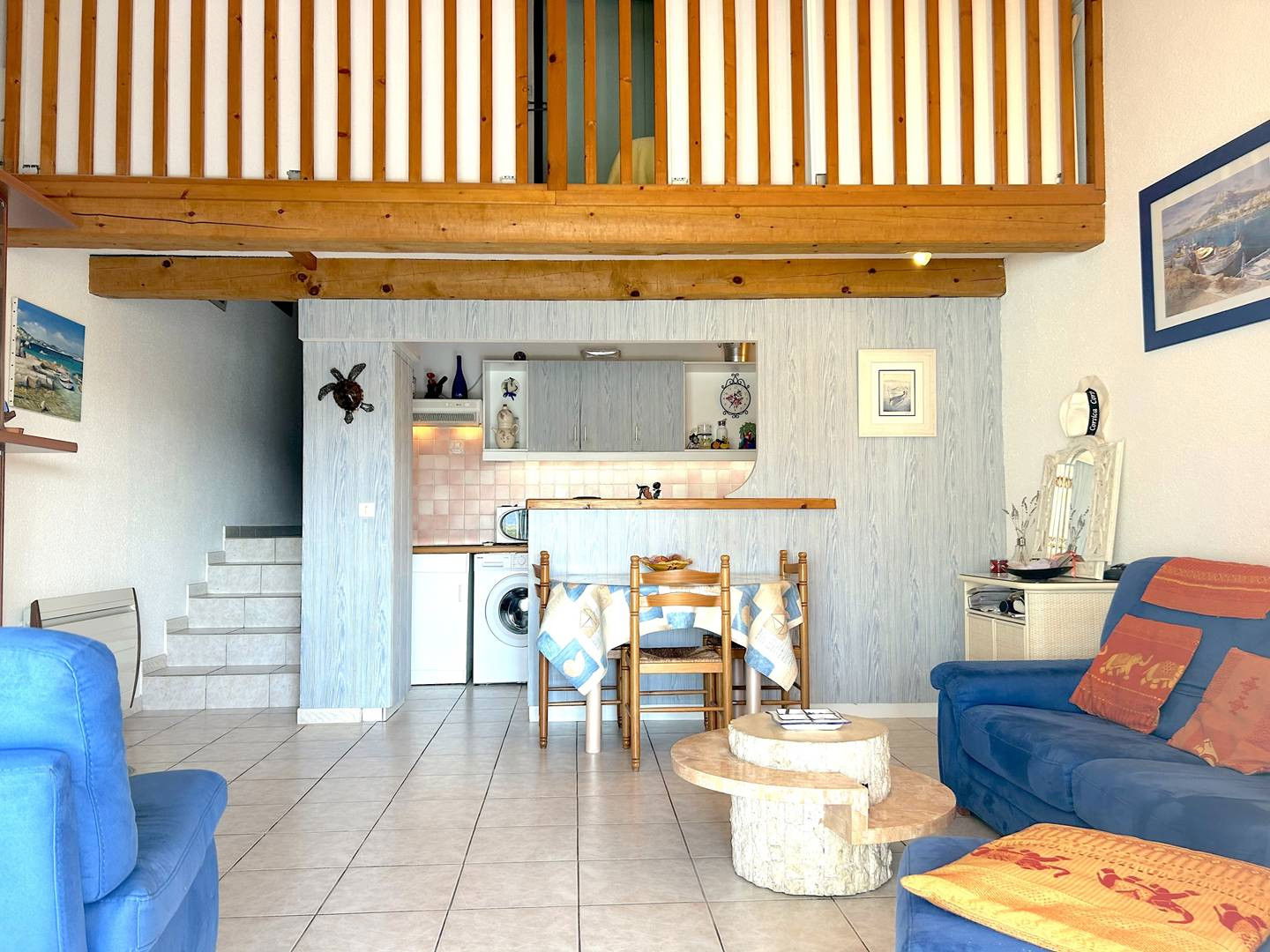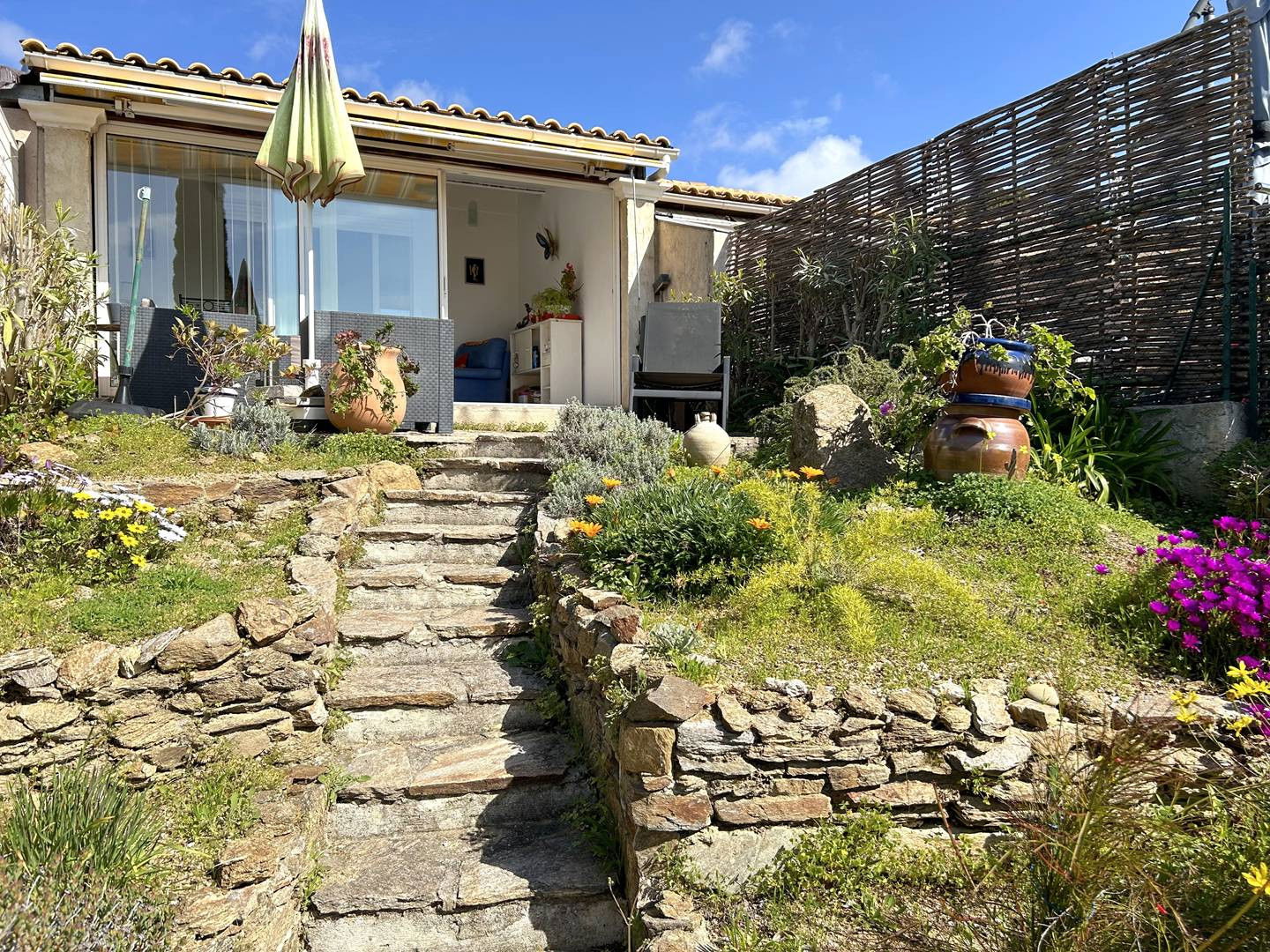 La location vous propose deux terrasses fleuries avec store banne et petit aperçu mer, un séjour ouvrant sur une véranda avec table de repas et coin lecture, une cuisine équipée, une chambre avec lit double ainsi qu'une mezzanine avec lit double également, puis une salle d'eau avec wc.