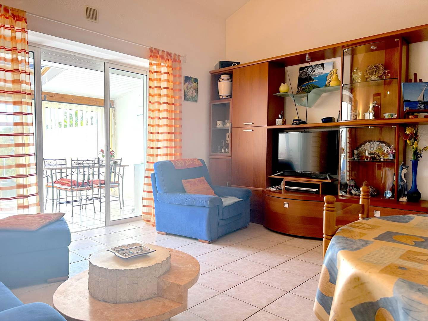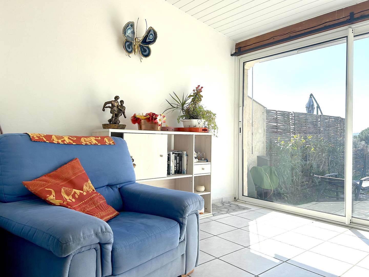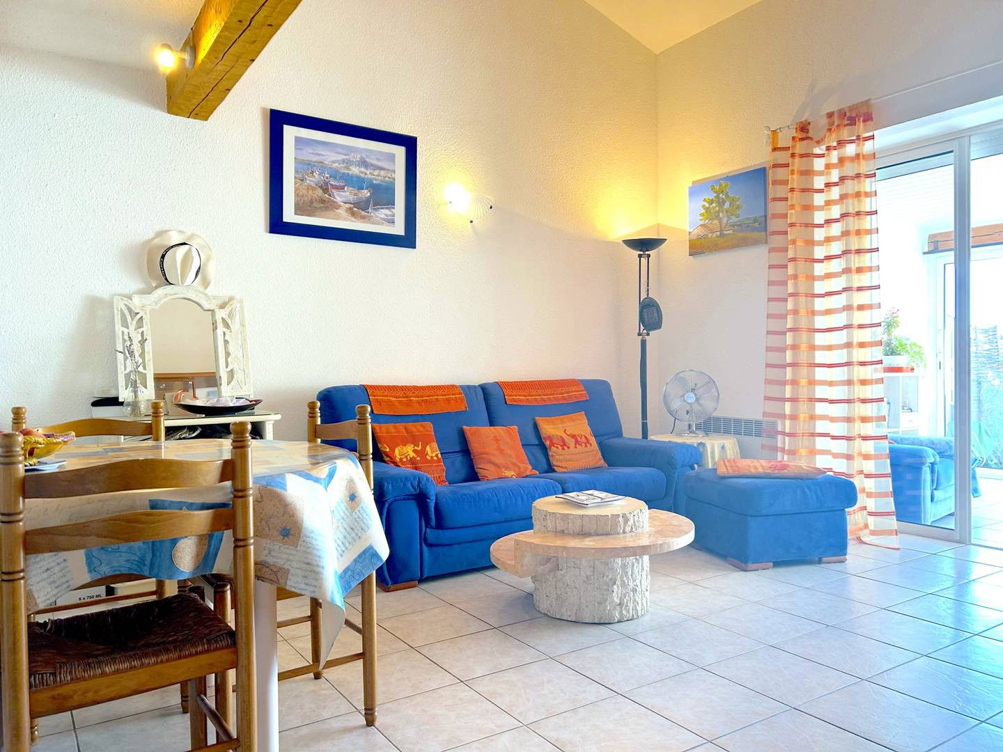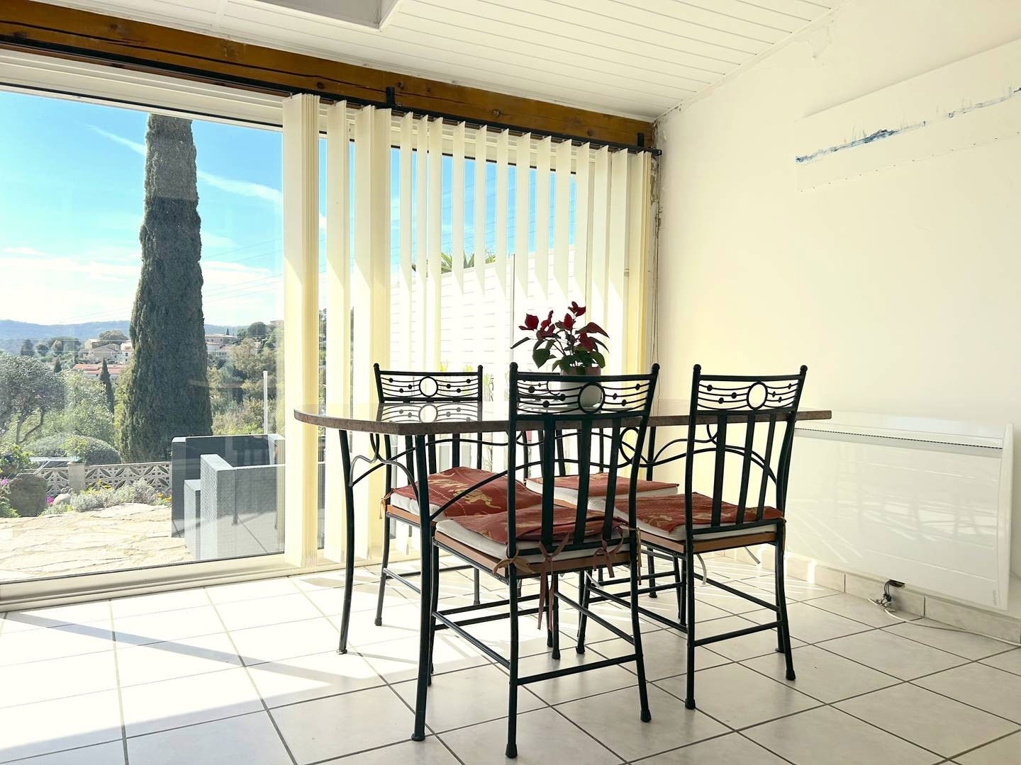 La location vous propose deux terrasses fleuries avec store banne et petit aperçu mer, un séjour ouvrant sur une véranda avec table de repas et coin lecture, une cuisine équipée, une chambre avec lit double ainsi qu'une mezzanine avec lit double également, puis une salle d'eau avec wc.