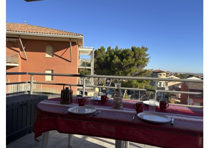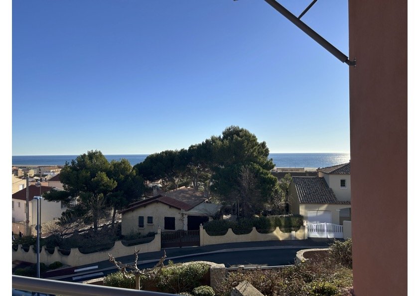 Les avantages de cette location de vacances en Méditerrannée : Belle terrasse avec mobilier de jardin et plancha électrique, vue mer, parking privé sécurisé