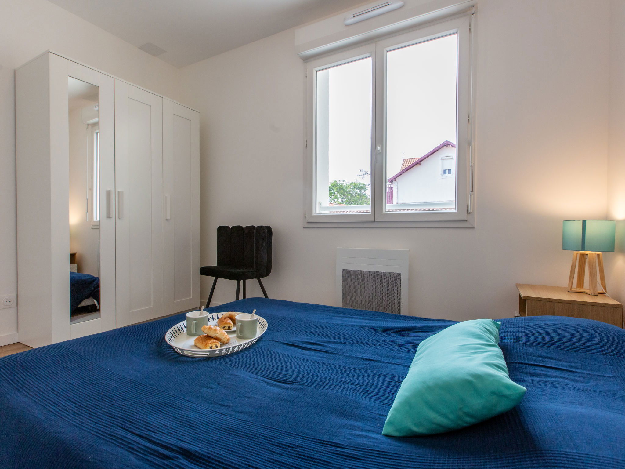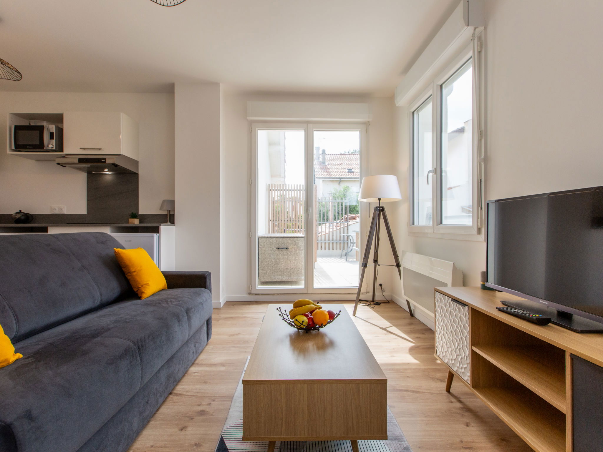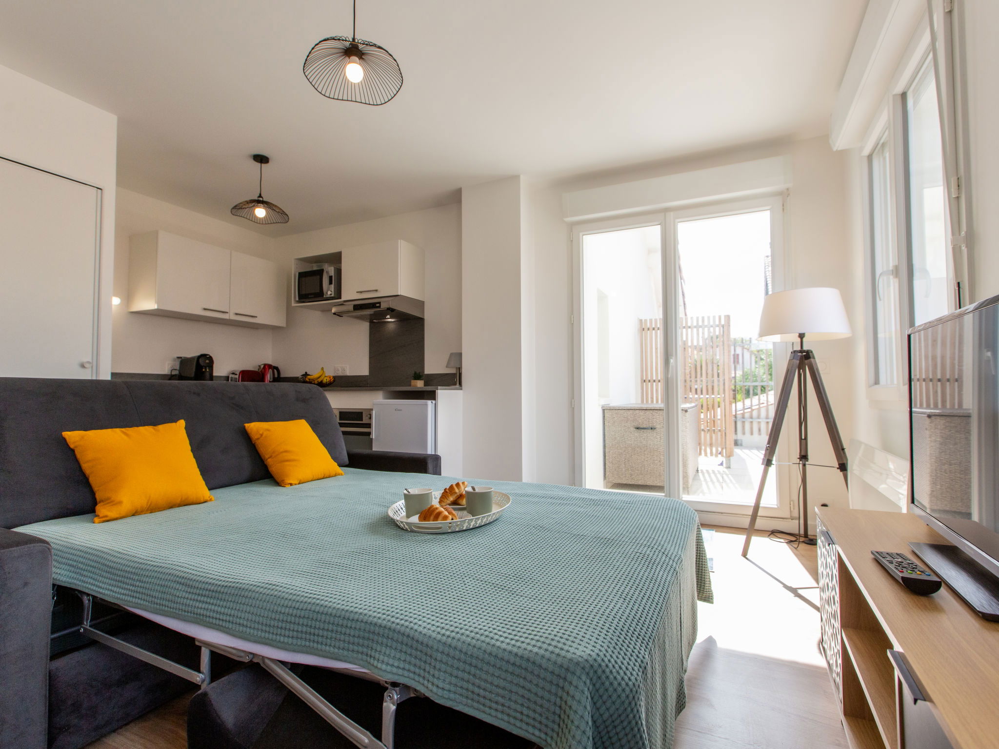 Appartement de 2 pièces 36 m2 au 1er étage. Logement idéal pour 2 adultes + 2 enfants. Aménagement moderne et plaisant: séjour/chambre à coucher avec 1 divan-lit (140 cm, longueur 190 cm), TV (écran plat). Sortie sur la terrasse. 1 chambre avec 1 grand-lit (140 cm, longueur 190 cm). Cuisine ouverte (four, lave-vaisselle, 4 plaques à induction, grille-pain, bouilloire électrique, micro-ondes, cafetière électrique). Douche/WC. Chauffage électrique. Grande terrasse 18 m2. Meubles de terrasse, chaises longues (4). A disposition: lave-linge, sèche-cheveux. Internet (Connexion WIFI, gratuit). Veuillez noter: logement non-fumeur. Annonce d'un particulier (art 155, IV du CGI). 40065001454O7