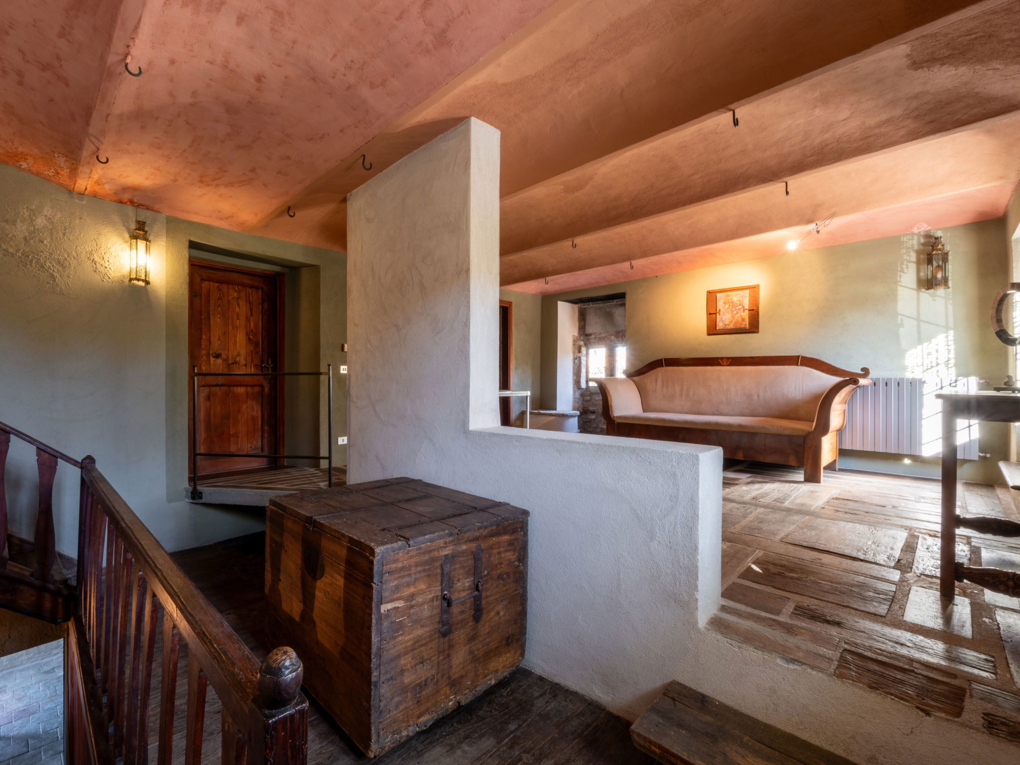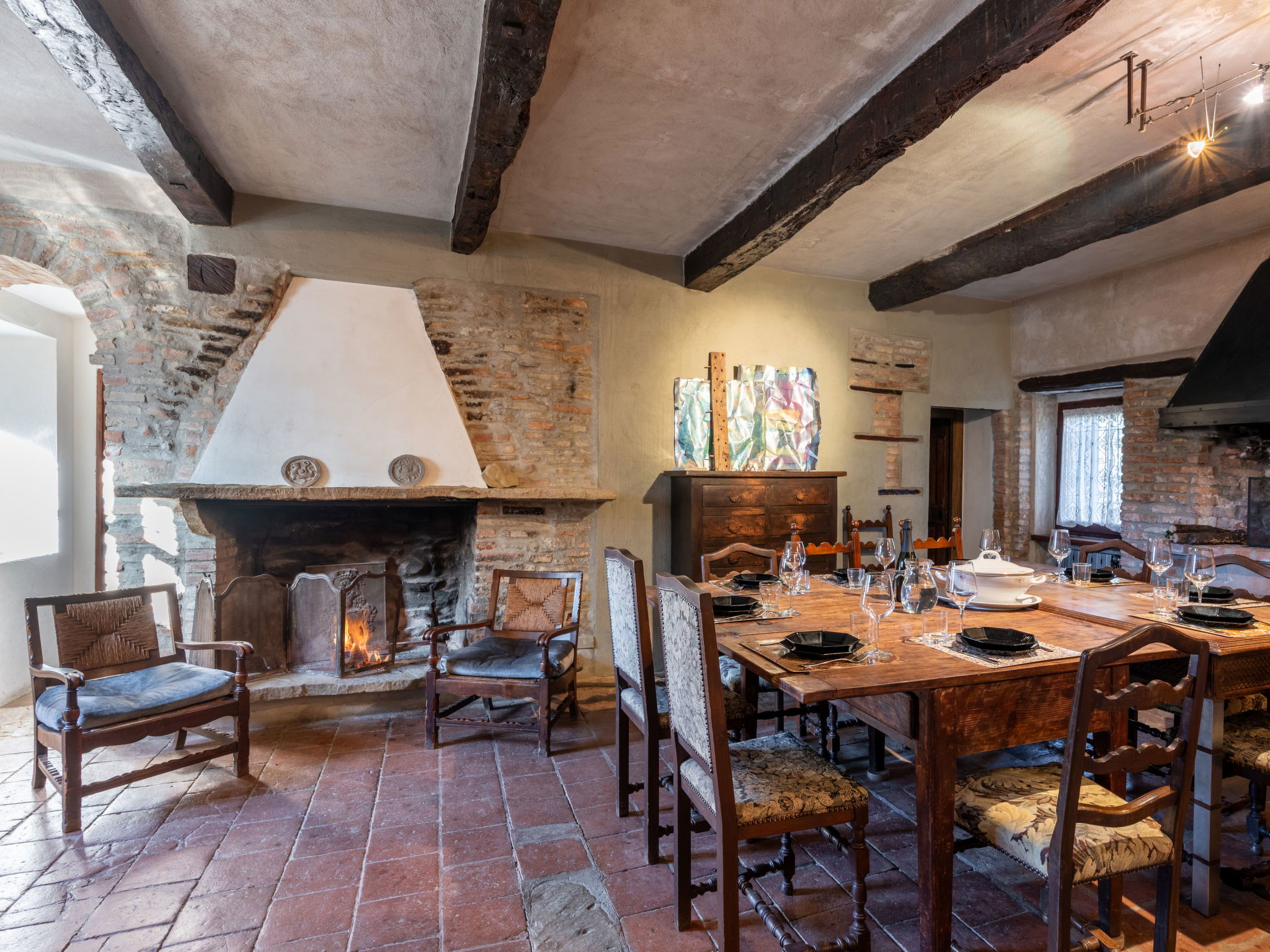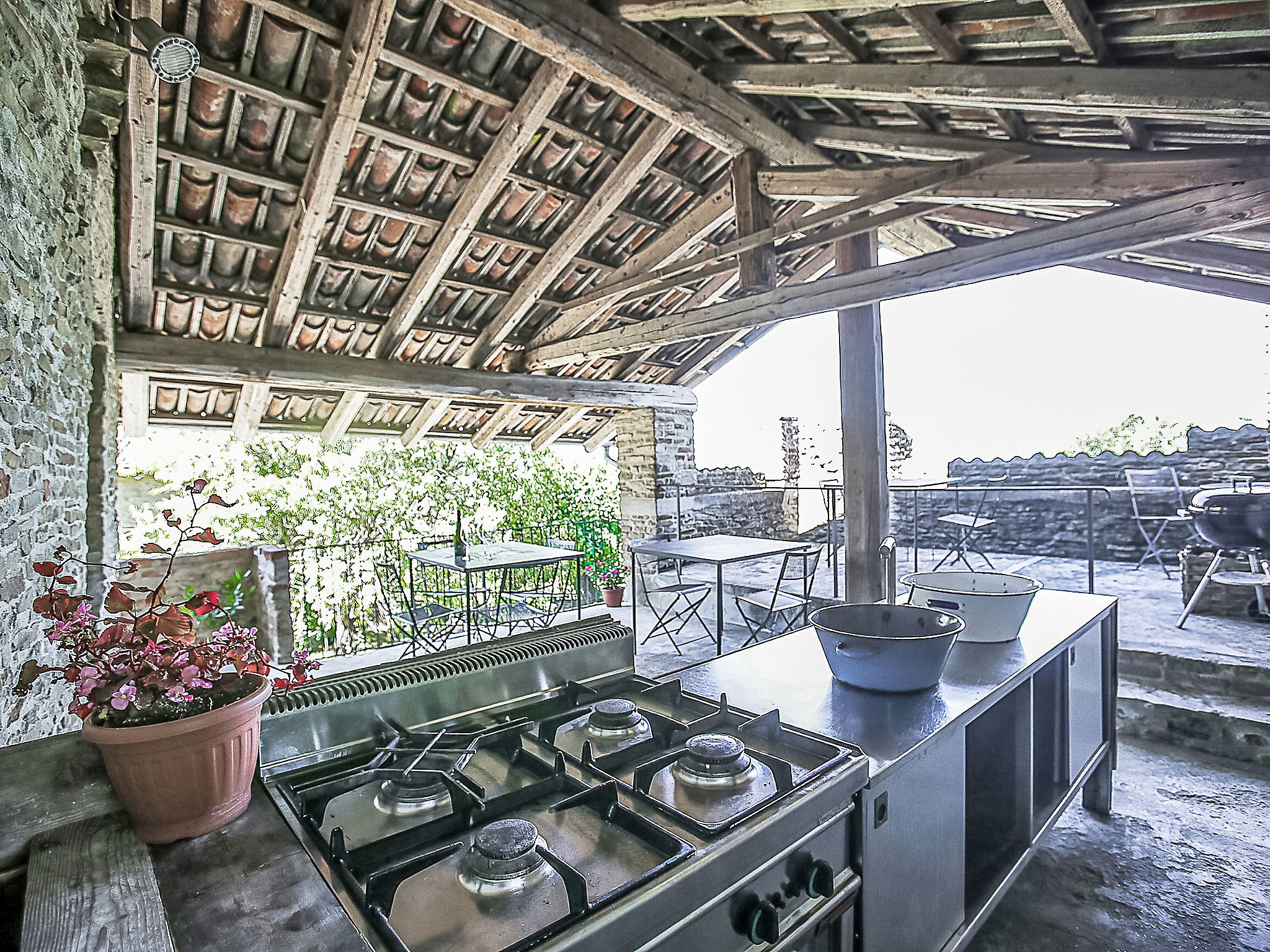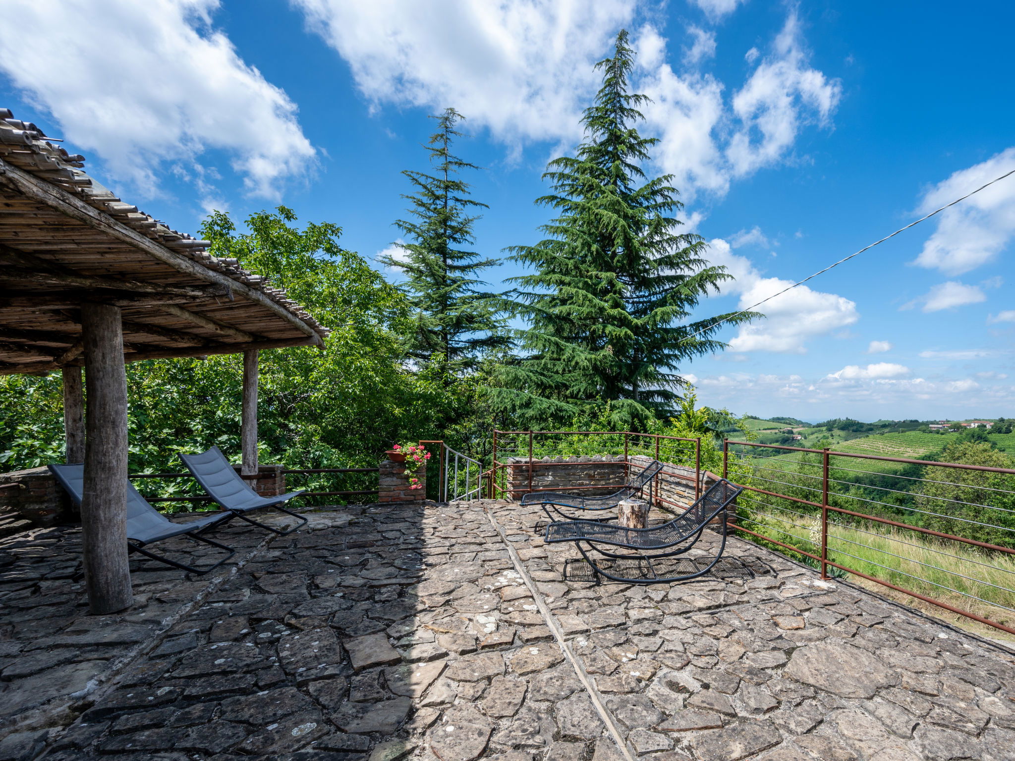 Trezzo Tinella à 10 km de Alba: Grande maison de maître historique "Borgo del Riondino", 550 m au dessus du niveau de la mer, du 15ème siècle, rénovée, environnée par les champs et vignobles. 3 maisons dans le même complexe de vacances. À 3 km du centre de Trezzo Tinella, à 8 km du centre de Neive, à 11 km du centre de Barbaresco, situation isolée, tranquille, à 75 km de la mer, dans la verdure. A usage privé: parc 10 ha avec plantes et arbres, piscine couverte (13 x 4 m, profondeur 140 cm, disponibilité saisonnière: 01.Jun. - 15.Sep.). Douche/WC dans l'espace piscine. Chauffage payable localement, possibilité de chauffage uniquement du 15.Oct. - 15.Avr.. Place de parking sur le terrain. Magasins 8 km, supermarché 8 km, restaurant 2.5 km, arrêt de bus 13 km. Attractions à proximité: Langhe - Barolo 10 km, Asti 30 km, Bra 30 km, Cuneo 80 km. Veuillez noter: voiture recommandée. Le propriétaire habite sur le même terrain. La résidence de vacances est située en face d’une cour ancienne où se trouve une entreprise viticole biologique. Il y a une aire de pique-nique et un sentier pour les joggeurs dans le parc.