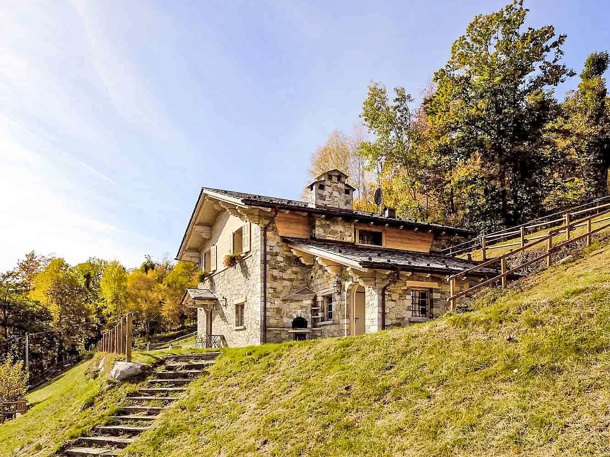 Chalet 5 pièces 300 m2 sur 2 niveaux. Spacieux et clair, partiellement mansardé, aménagement agréable et de style: grand séjour ouvert avec cheminée et TV (câblée) (écran plat). Sortie sur le jardin. Grande cuisine/séjour (4 plaques de cuisson, four, lave-vaisselle, grille-pain, micro-ondes, congélateur, cafetière électrique, Capsules pour machine à café (Nescafè Dolce Gusto)) avec table pour les repas, coin repas et poêle à bois. Douche/bidet/WC. À l'étage supérieur: 1 chambre avec 1 lit et 1 x 2 lits superposés, TV. 1 chambre avec 1 lit double (180 cm, longueur 200 cm), TV. 1 chambre avec 1 lit double (180 cm, longueur 200 cm), douche/bidet/WC. Sortie sur le balcon. Douche/bidet/WC. Sol en bois, sol en pierres naturelles. Petit balcon. Chaises longues (4). Très belle vue panoramique sur les montagnes, la vallée et le jardin. A disposition: lave-linge, chaise haute pour enfant, lit bébé, sèche-cheveux, bois (en sus). Internet (Connexion WIFI, gratuit). Veuillez noter: adapté(e) aux familles. Maison non-fumeur. Maximum 1 animal/ chien autorisé. IT014034C2BNOI9VEQ