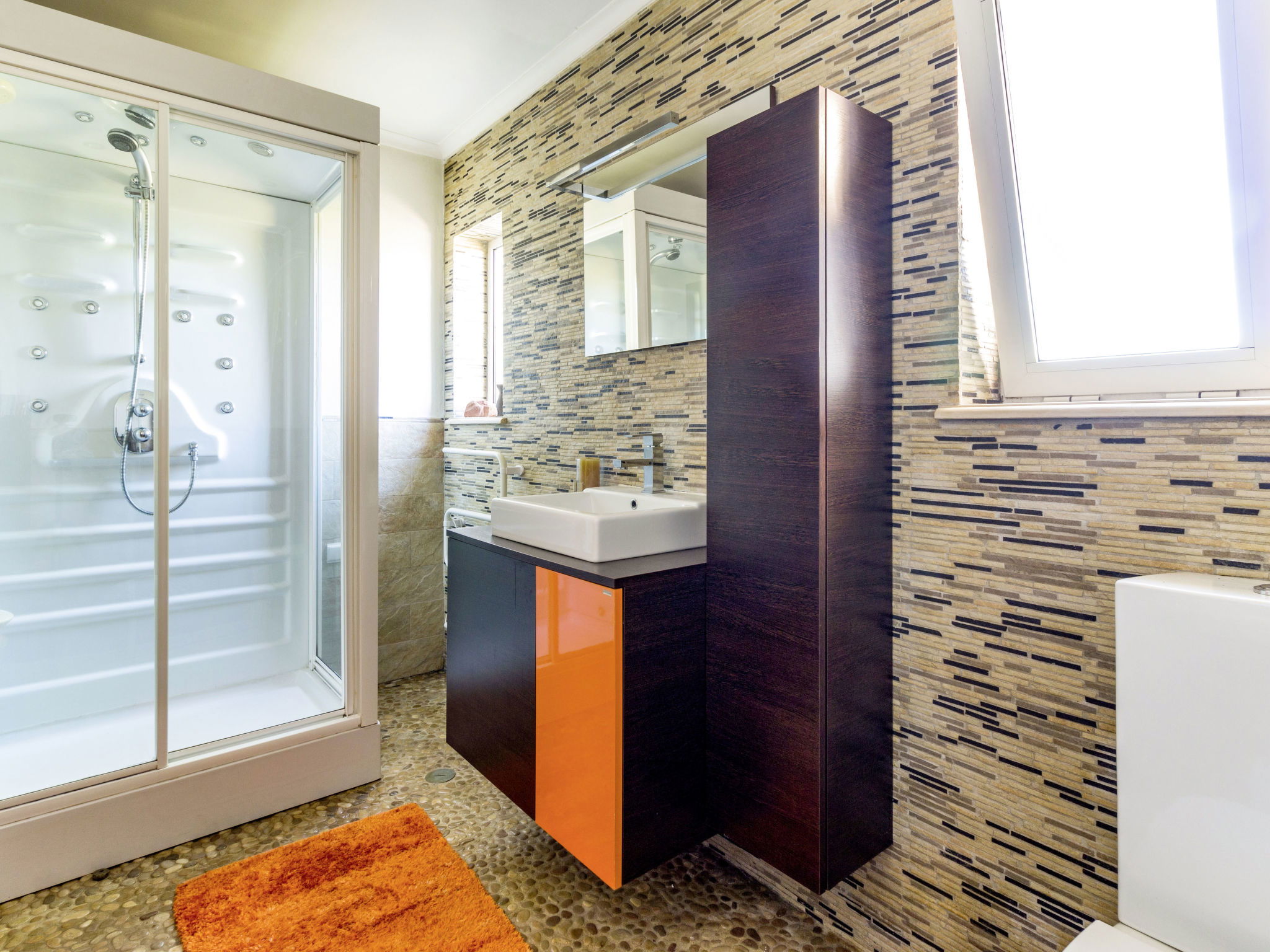 "Monte Meco", maison 6 pièces 260 m2 sur 2 niveaux. Aménagement de bon goût: séjour/salle à manger sur 2 niveaux avec cheminée, table pour les repas et TV (câblée). Sortie sur la terrasse. Séjour. 1 chambre avec Dressing avec 1 grand-lit (150 cm, longueur 205 cm), douche/WC, double vasque et bain à remous . 1 chambre avec 2 lits (95 cm, longueur 195 cm), bain/WC. Cuisine (four, lave-vaisselle, 4 feux, grille-pain, bouilloire électrique, micro-ondes, congélateur, cafetière électrique, Capsules pour machine à café (Nespresso not incl.)) avec table pour les repas. WC séparé. À l'étage supérieur: 1 chambre avec 1 grand-lit (140 cm, longueur 195 cm), douche/WC. Sortie sur la terrasse. 1 chambre avec 1 grand-lit (140 cm, longueur 195 cm), bain/WC. Entresol. Chauffage électrique, air-conditionné. Chauffage pas dans toutes les pièces. Terrasse partiellement couverte. Meubles de terrasse, barbecue, chaises longues (8). Vue panoramique. A disposition: lave-linge, coffre-fort, fer à repasser, moustiquaire, chaise haute pour enfant, lit bébé, sèche-cheveux. Internet (Connexion WIFI, gratuit). Veuillez noter: logement non-fumeur. Maximum 2 animaux/ chiens autorisés. Extincteur. 67380/AL