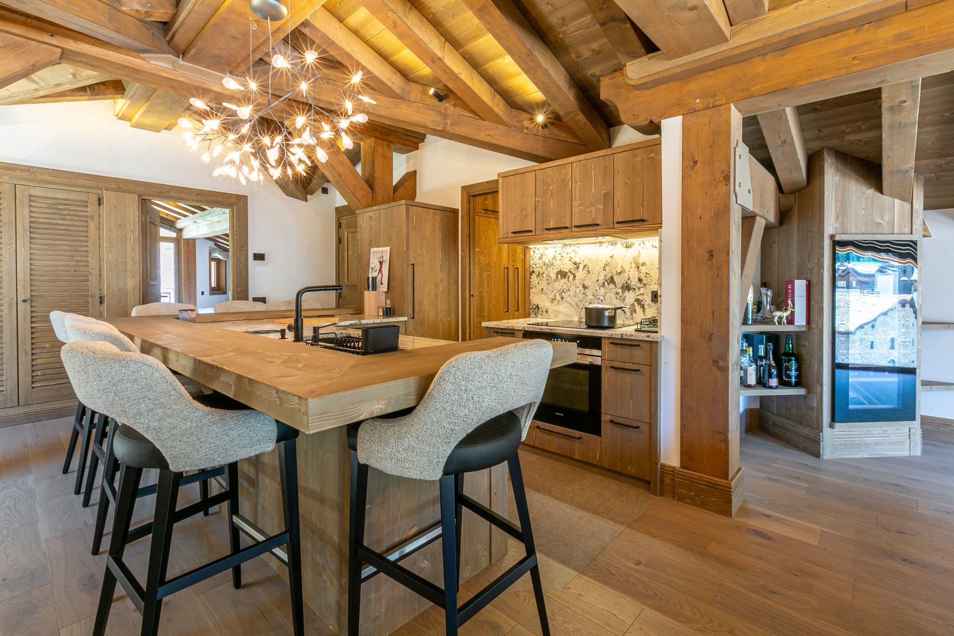 1 Cuisine ouverte: plaque induction, lave-vaisselle, réfrigérateur, hotte aspirante, cave à vin, table bar avec chaises hautes.