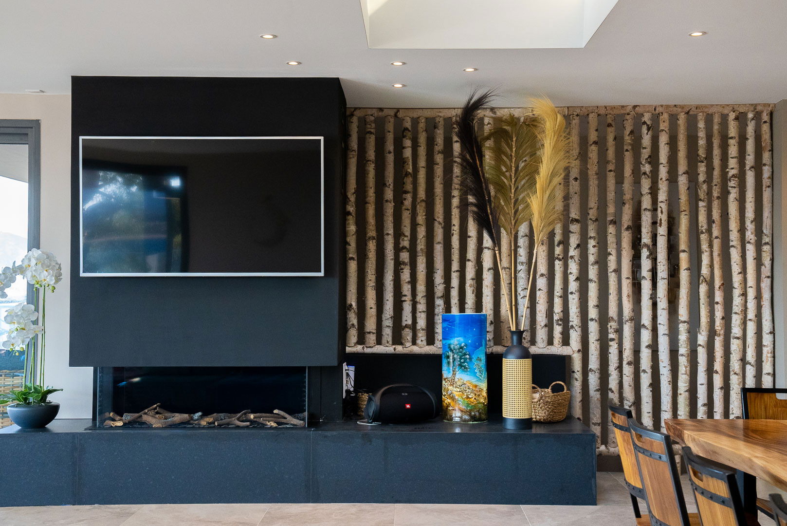 • Salon élégant offrant une vue panoramique sur la mer et doté d'une cheminée
