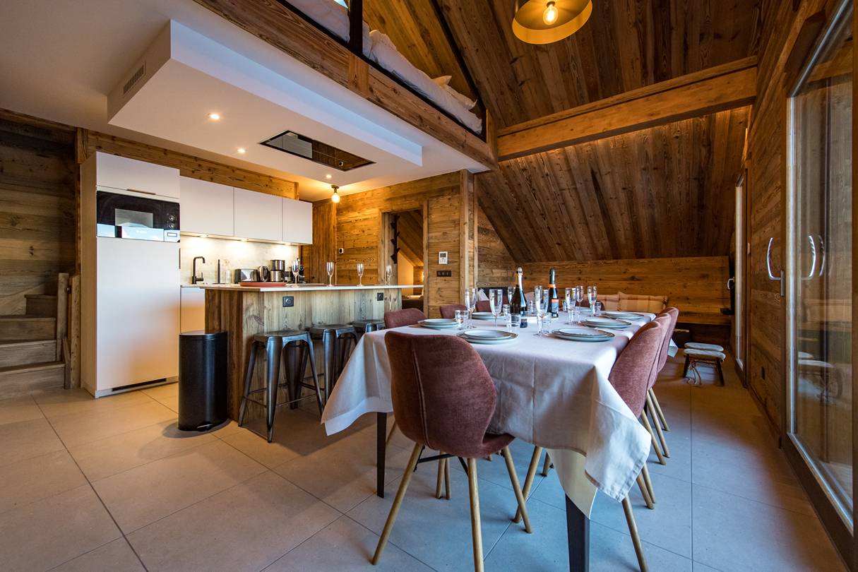 La pièce de vie propose un coin salon - salle à manger et une cuisine équipée.