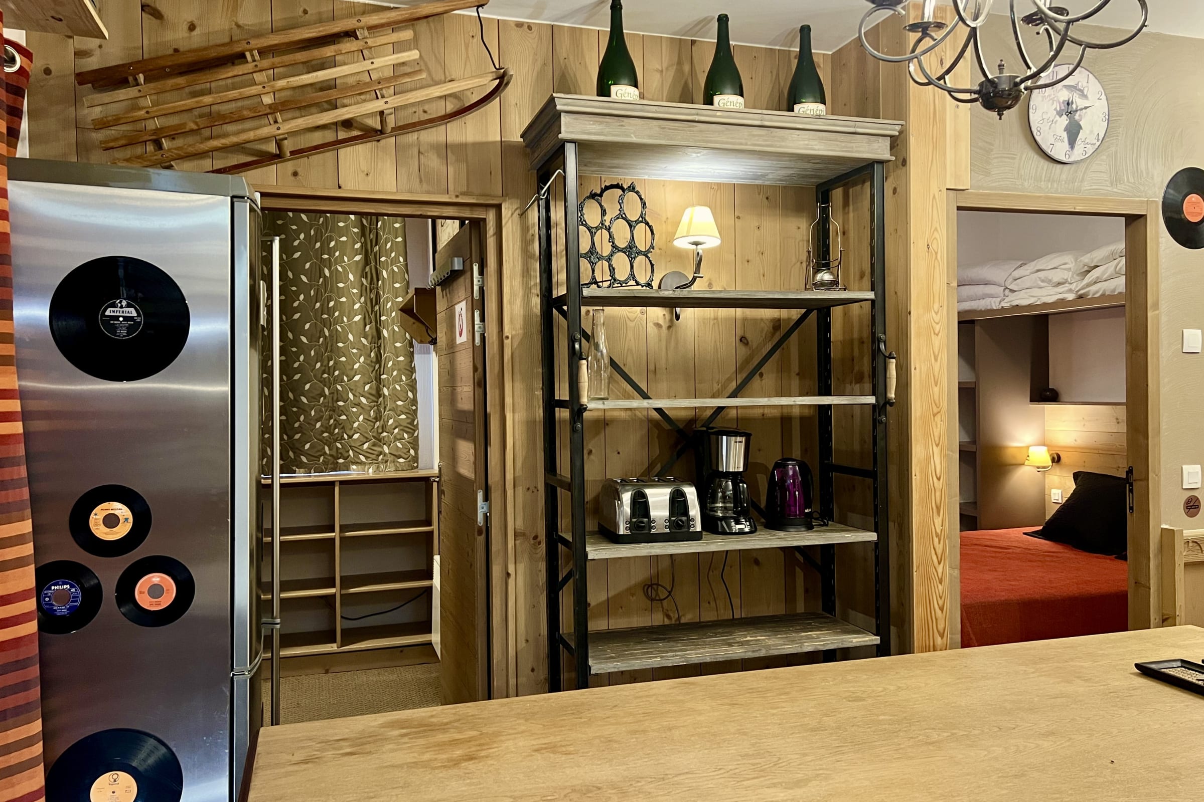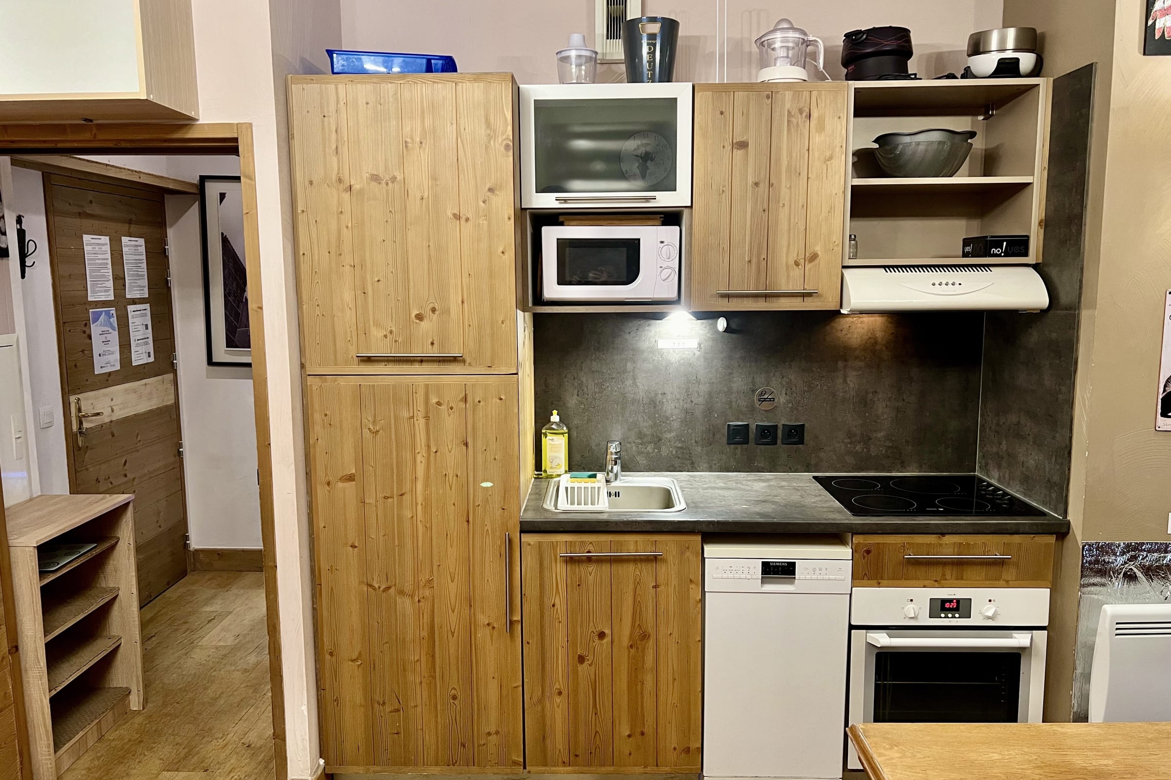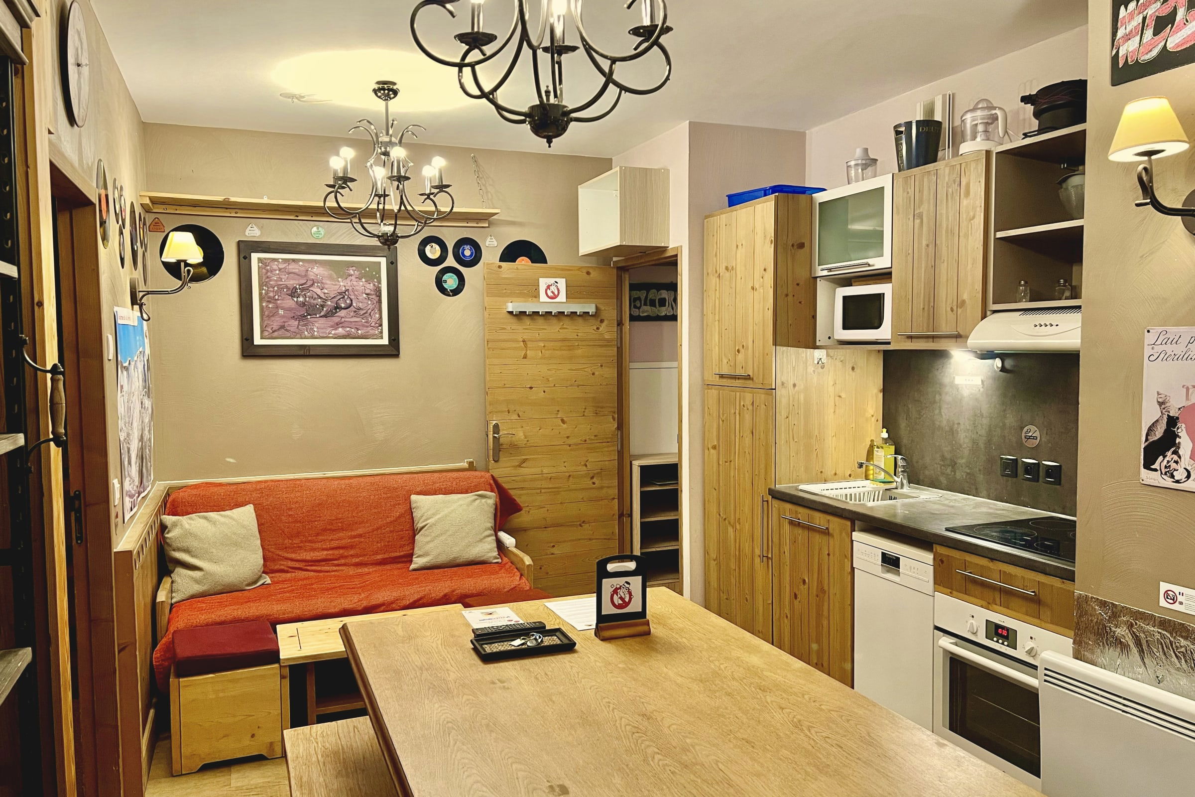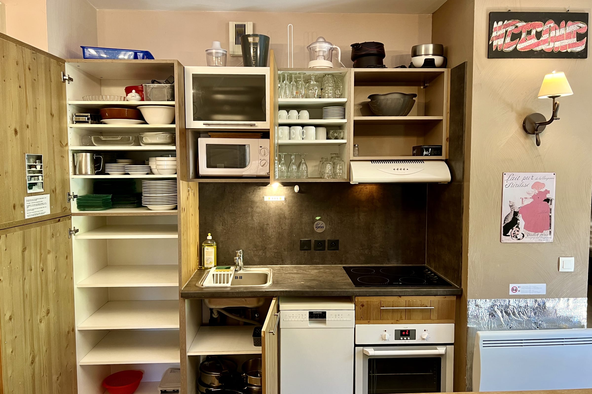 - Cuisine super équipée: un lave-vaisselle, un four à micro-ondes, un four classique, une cafetière à filtres, une bouilloire, un appareil à raclette/pierrade et à fondue, un grille-pain, un mixeur et un presse-agrumes. Mais aussi beaucoup de vaisselle : assiettes, verres, couverts, casseroles, poêles...