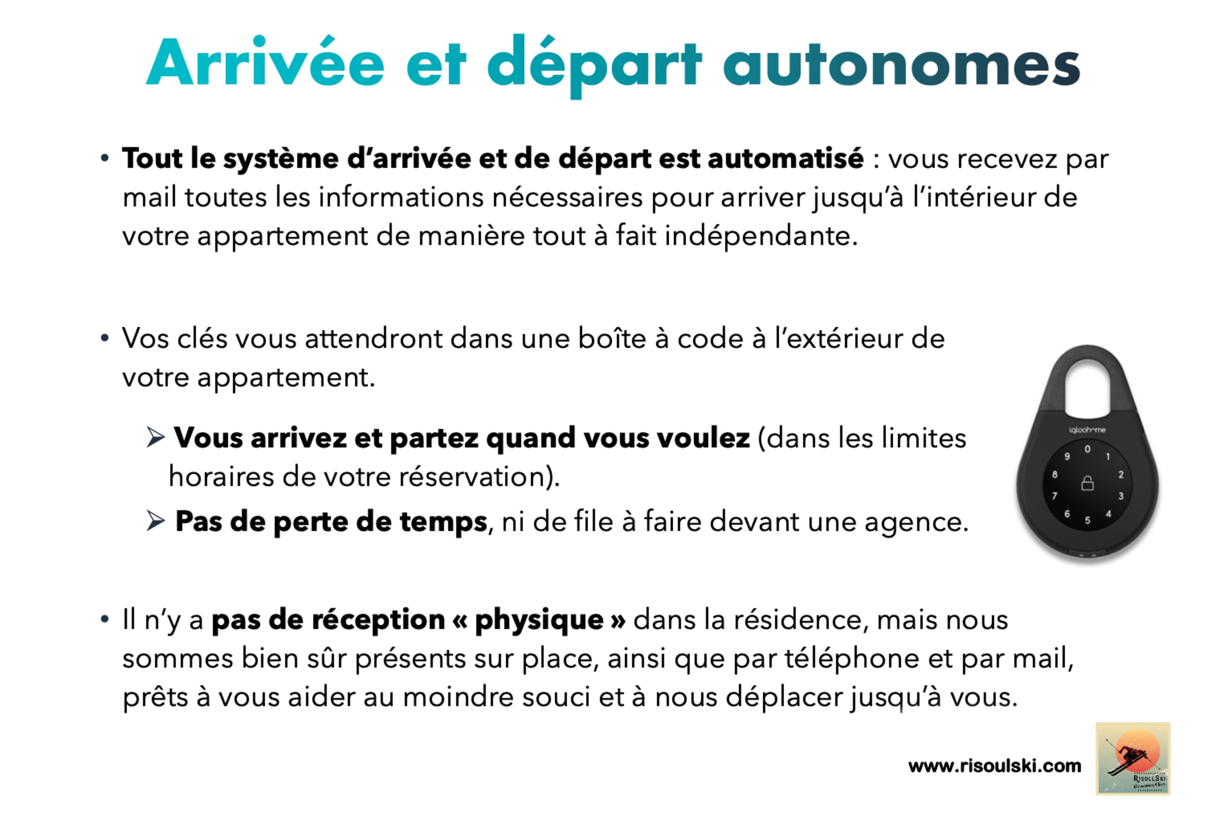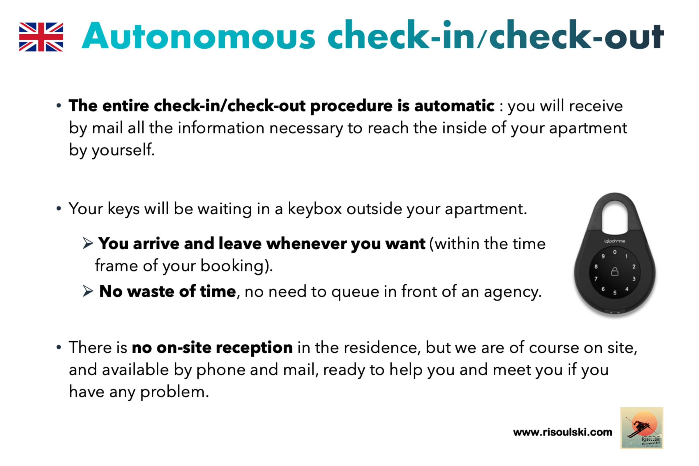 Chez RisoulSki, le check-in se fait à partir de 17h, le check-out doit avoir lieu avant 10h, dernier délai.