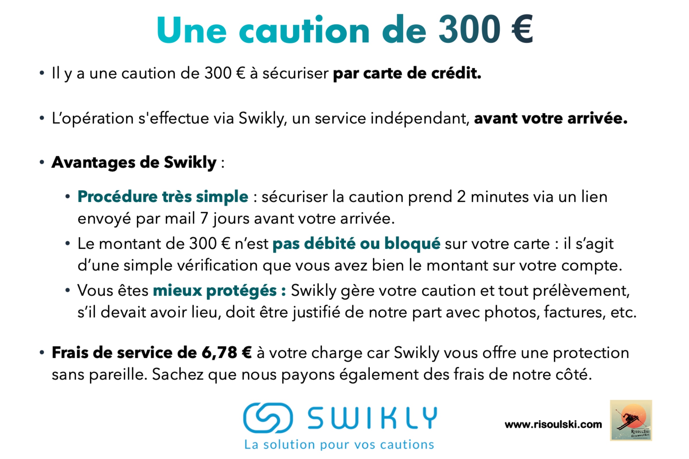 Le montant de 300 € n’est pas débité de votre carte, ni même bloqué. Il s’agit d’une simple vérification que vous disposez de cette somme sur votre compte en banque. Vous êtes en outre mieux protégé : Swikly gère votre caution et tout prélèvement, s'il devait avoir lieu, doit être justifié de notre part avec photos, factures, etc. Swikly est donc largement préférable à une caution déposée en espèces voire prise sur une carte de crédit, où l'hébergeur a tout pouvoir sur votre argent.