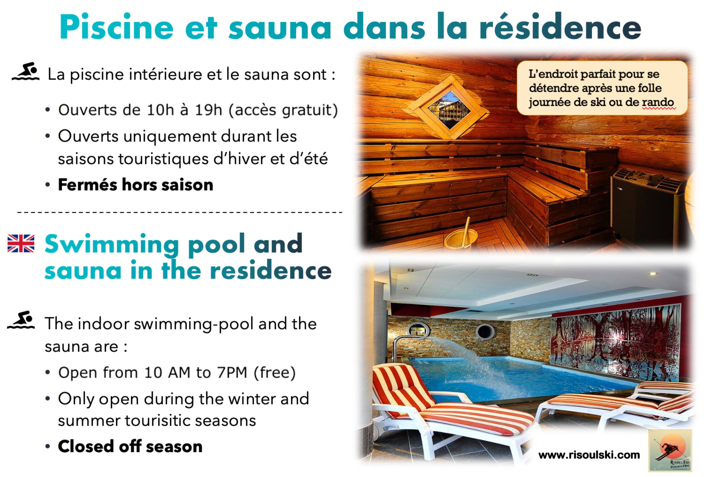 **En dehors des saisons d’hiver et d’été, la piscine et le sauna de la résidence sont fermés**.