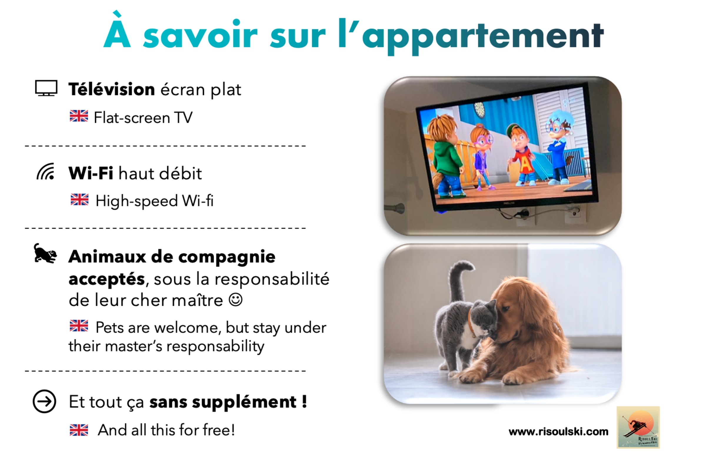 Les animaux de compagnie sont admis, sans supplément chez RisoulSki. Ils restent néanmoins sous la responsabilité de leur maître.