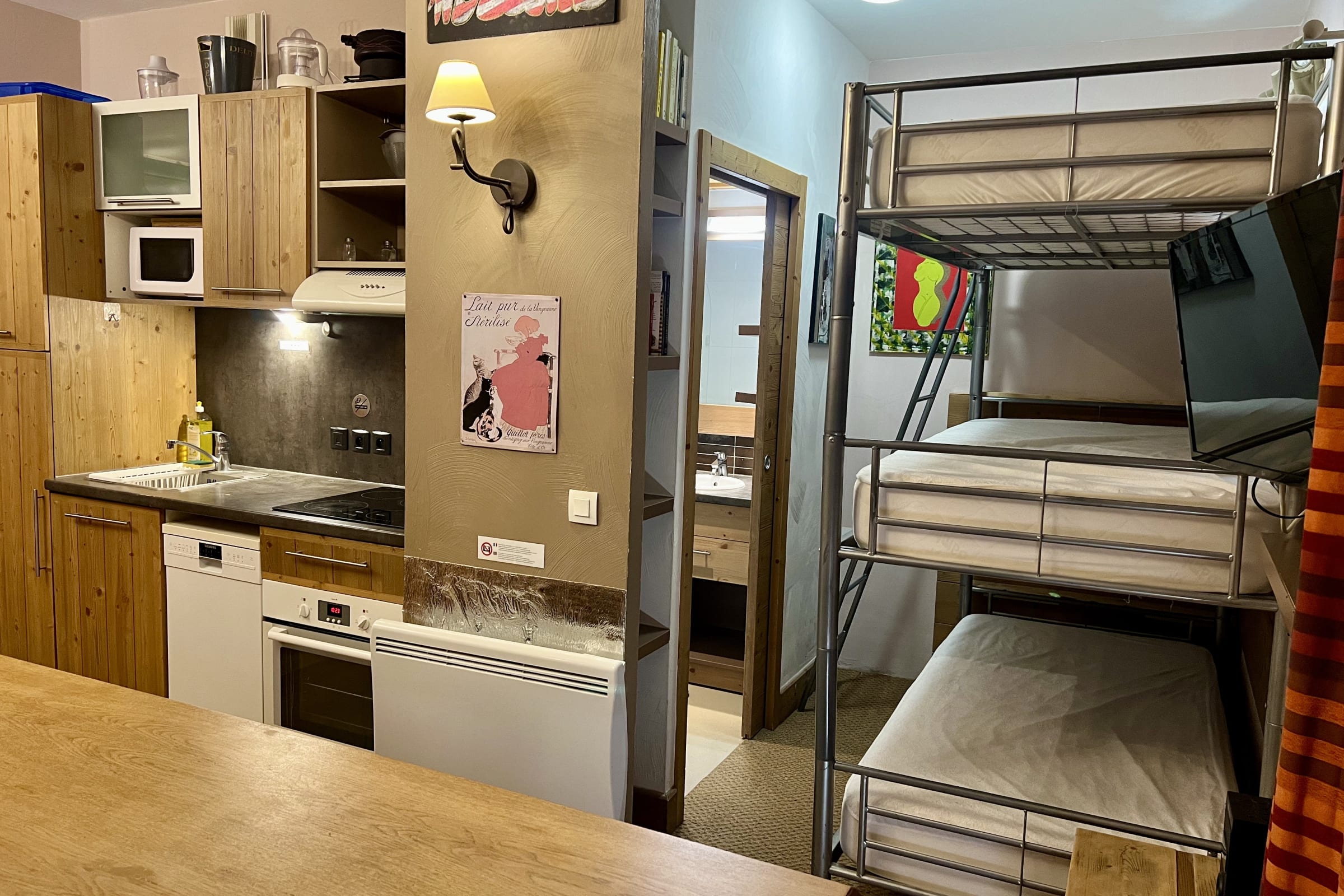 - Séjour avec canapé-lit et coin montagne avec lits superposés triples