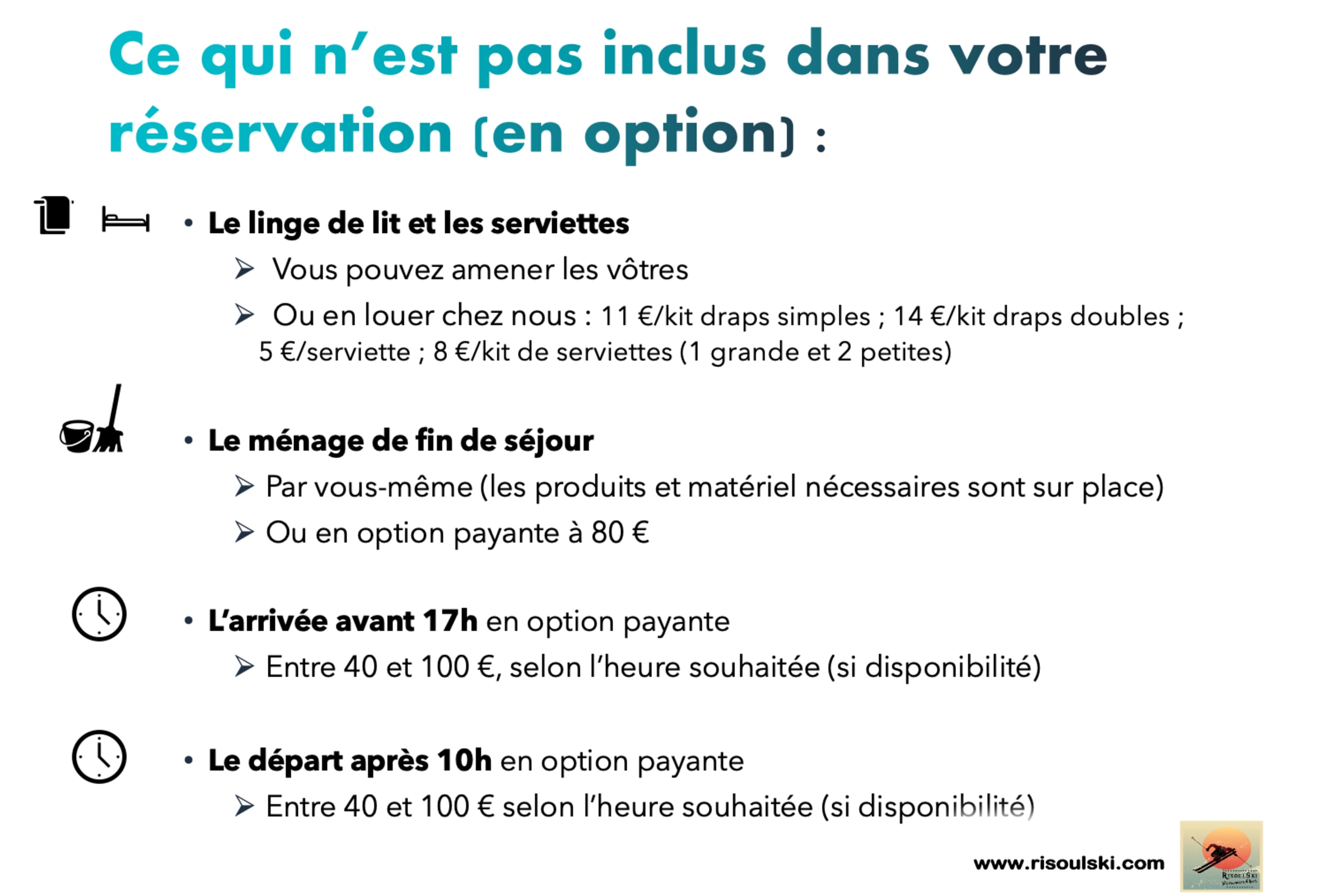 - Soit vous en louez via RisoulSki: 11 €/kit lit simple ; 14 €/kit lit double ; 5 €/grande serviette ; 8 €/kit de serviettes (une grande et 2 petites)