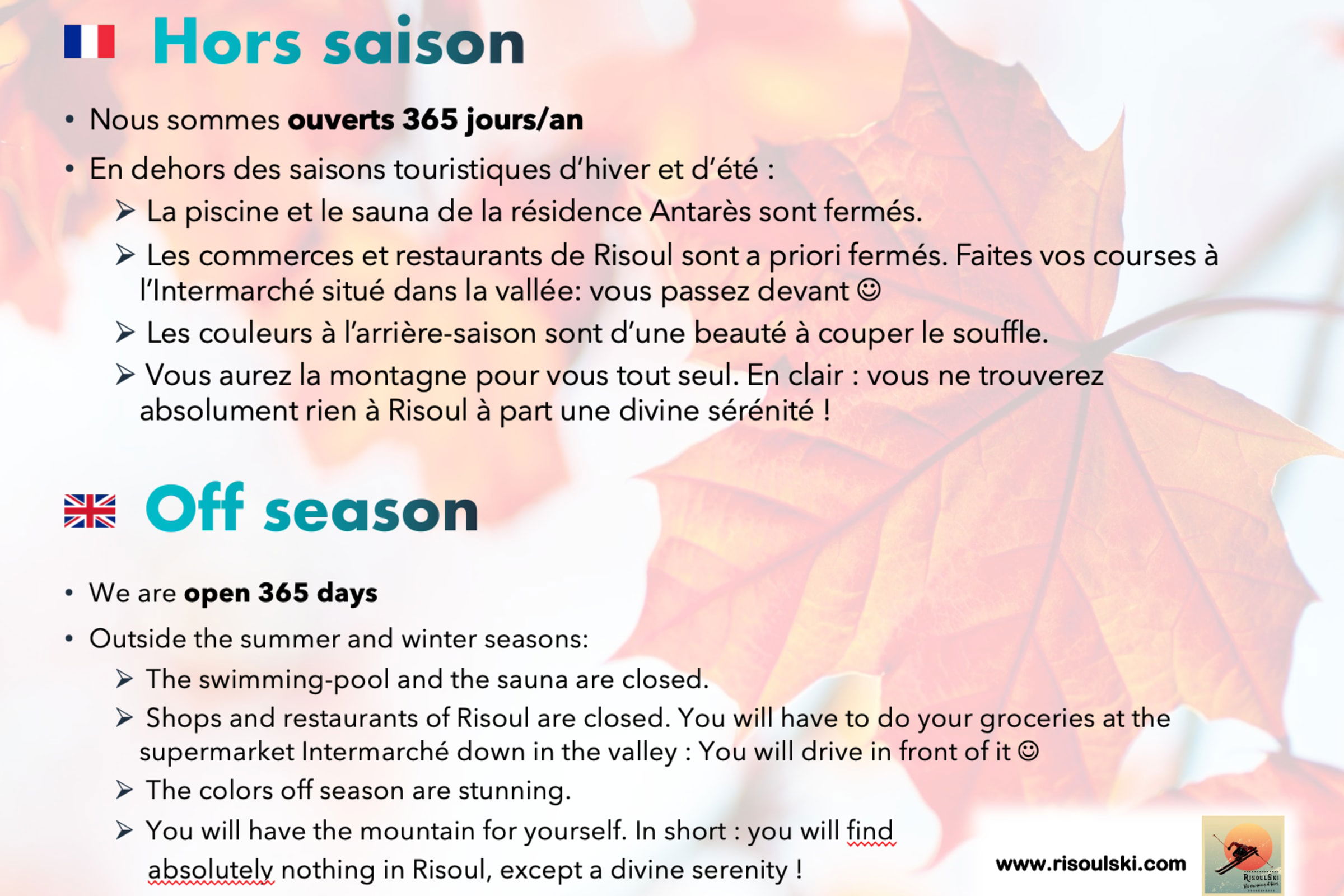 RisoulSki propose ses appartements et studios 365 jours par an, même lorsque la station est fermée. RisoulSki accueille des amoureux de la nature et des ouvriers en toutes saisons.