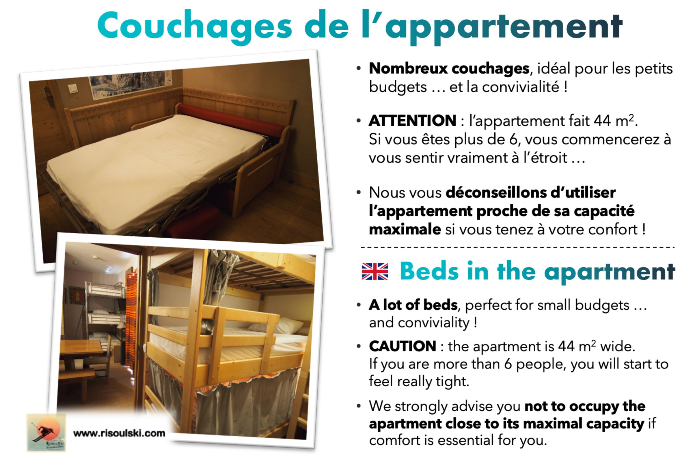 Les logements sont pensés de manière pratique et confortable. L’espace a été optimisé pour y mettre de nombreux lits, mais aussi beaucoup de rangements. RisoulSki permet aux familles ou groupes d'amis de se réunir dans un seul et même appartement, que cela soit par envie d'être tous ensemble ou pour raison financière.