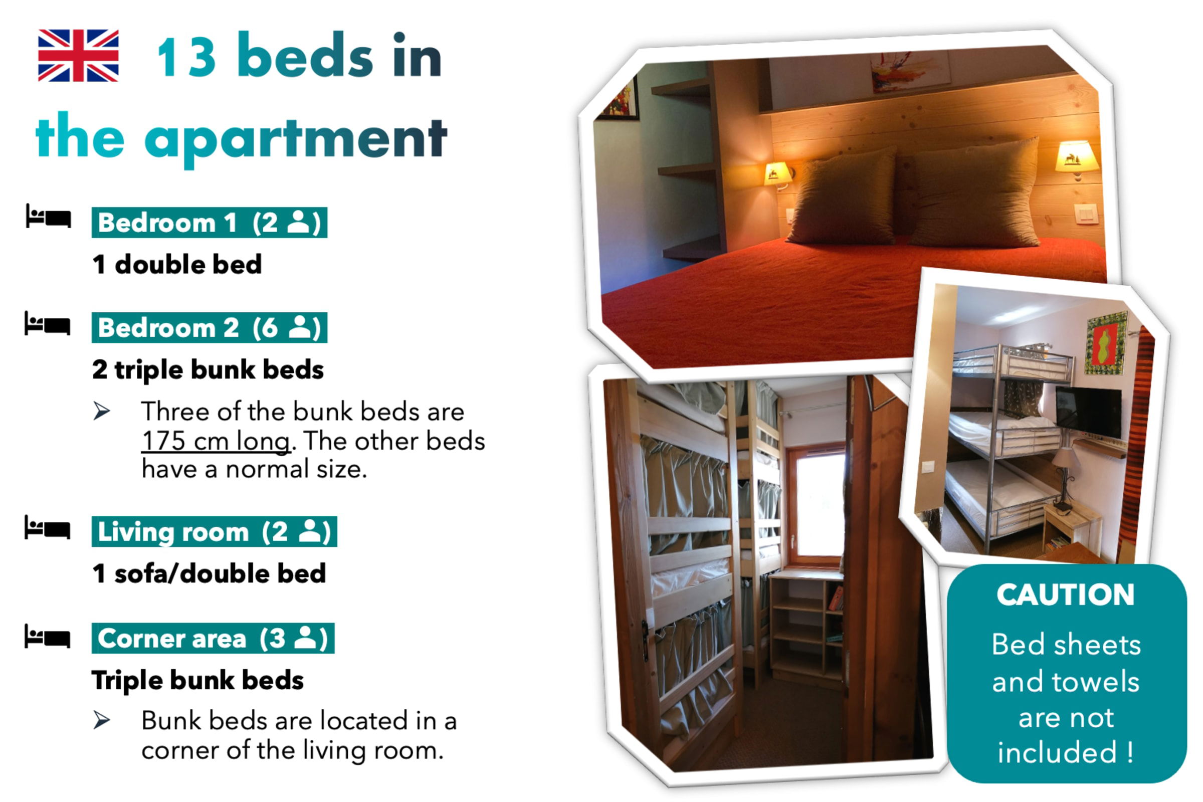 Attention: L'un des lits superposés triples dans la chambre a des lits de 175cm de long ! Les autres couchages sont de taille normale.