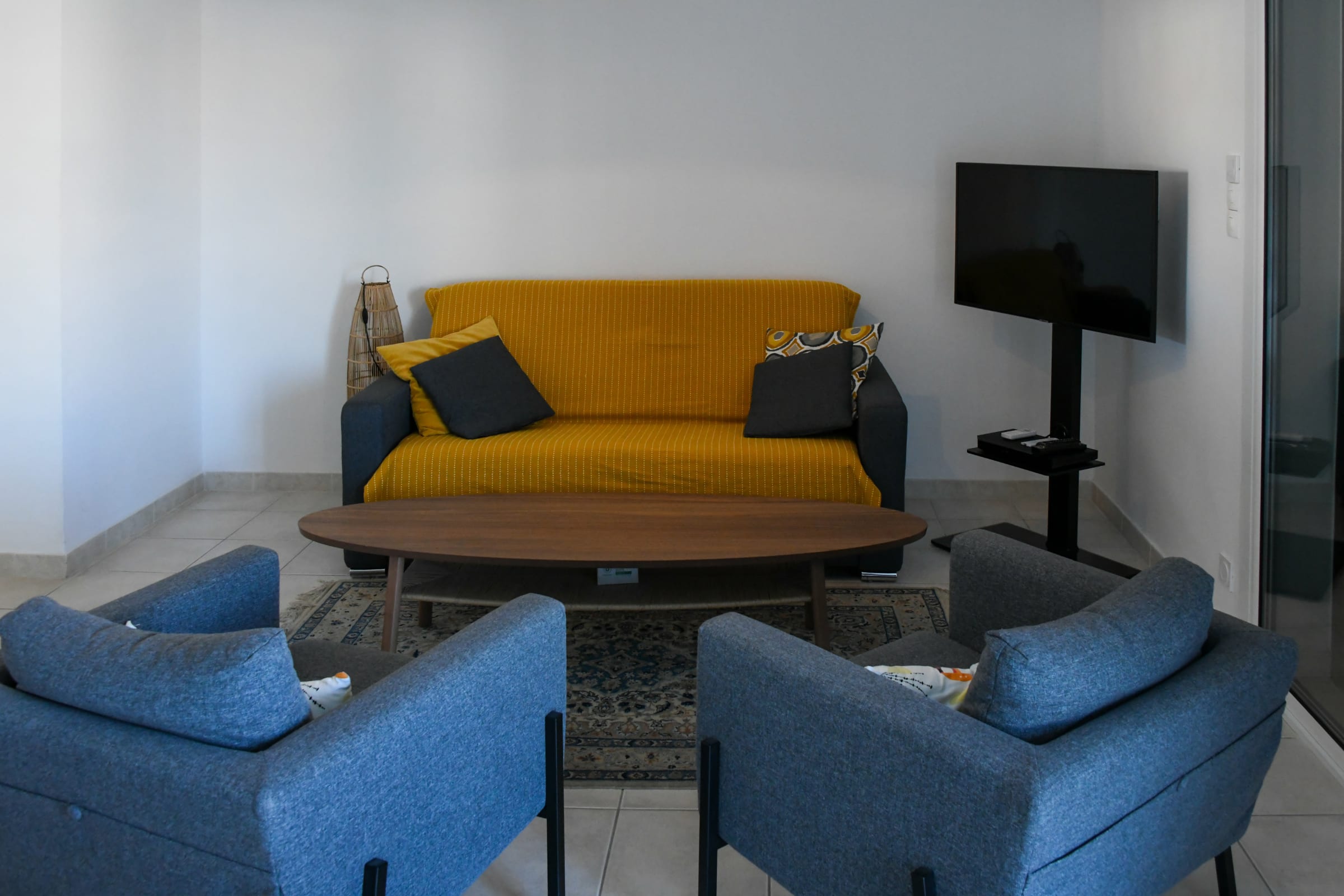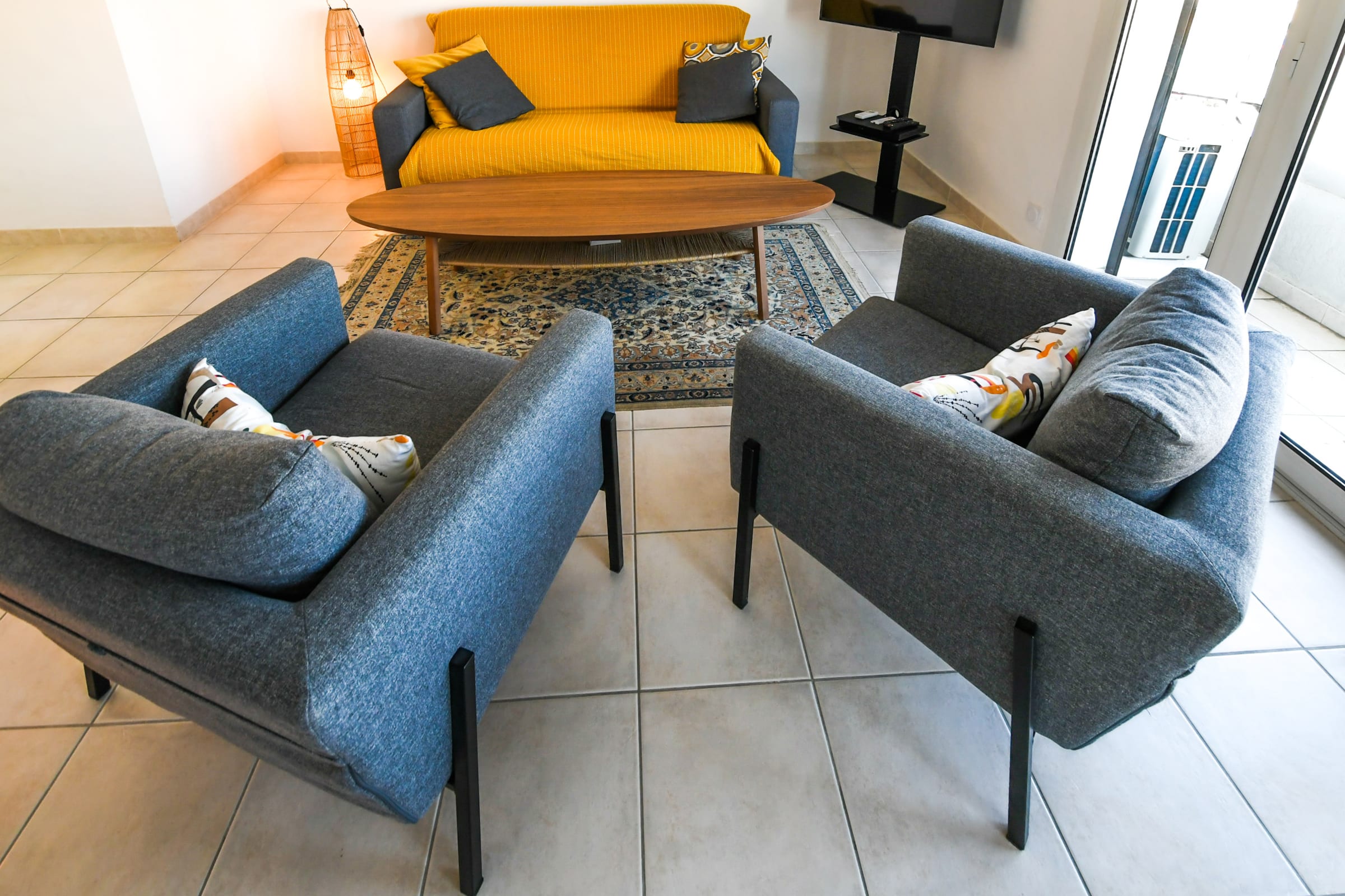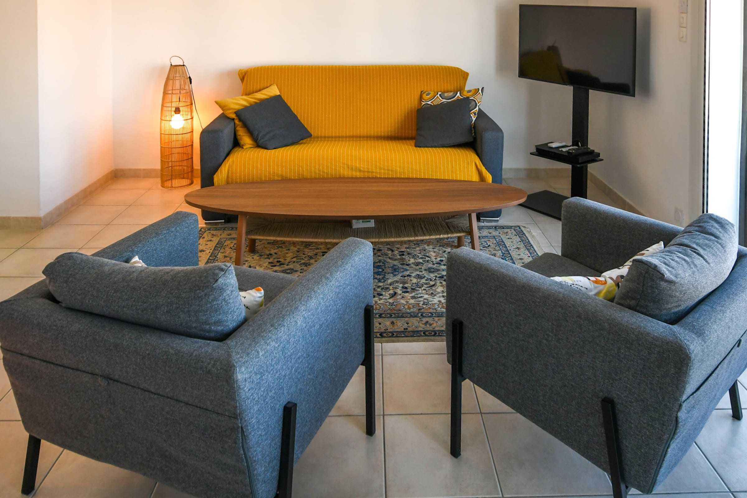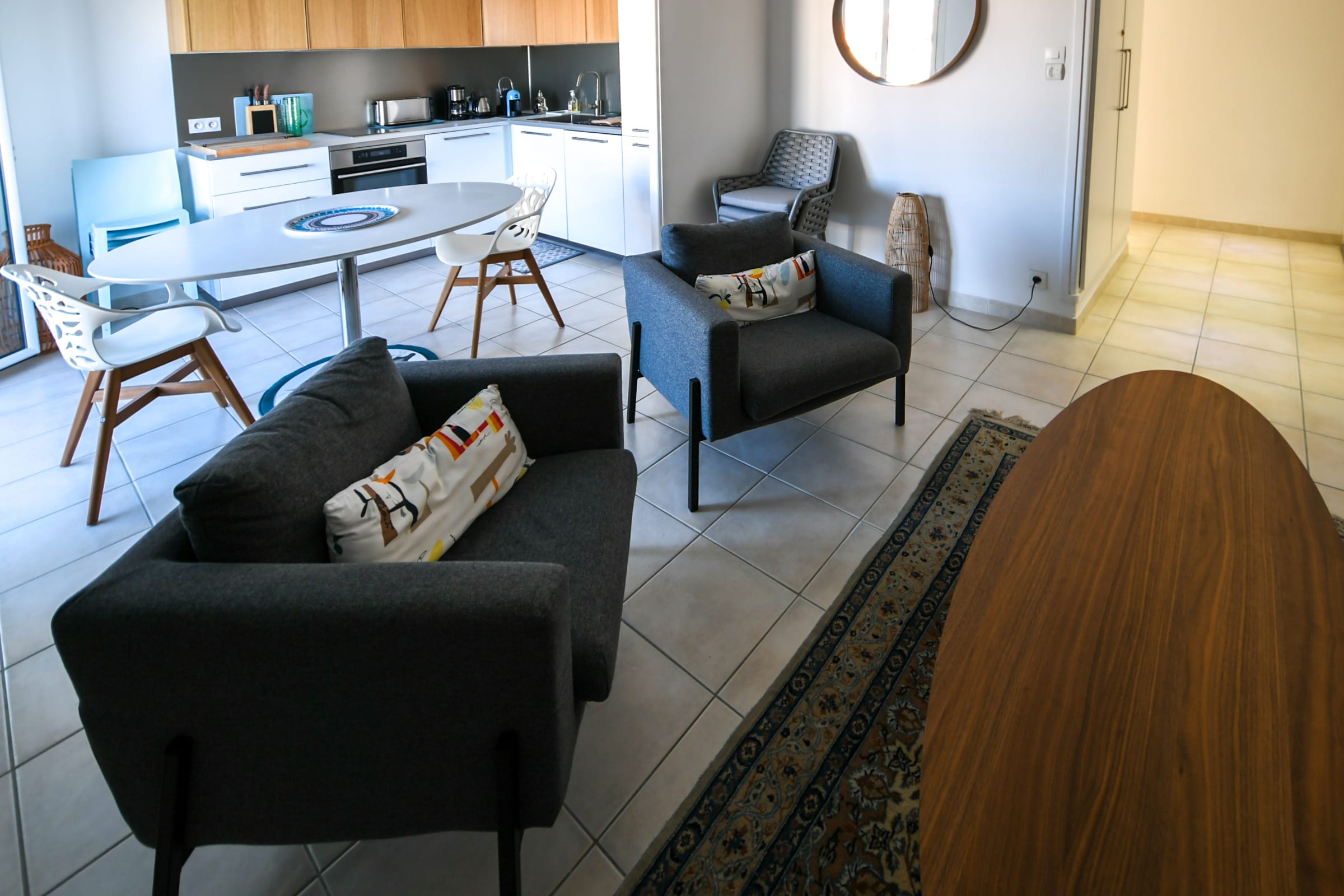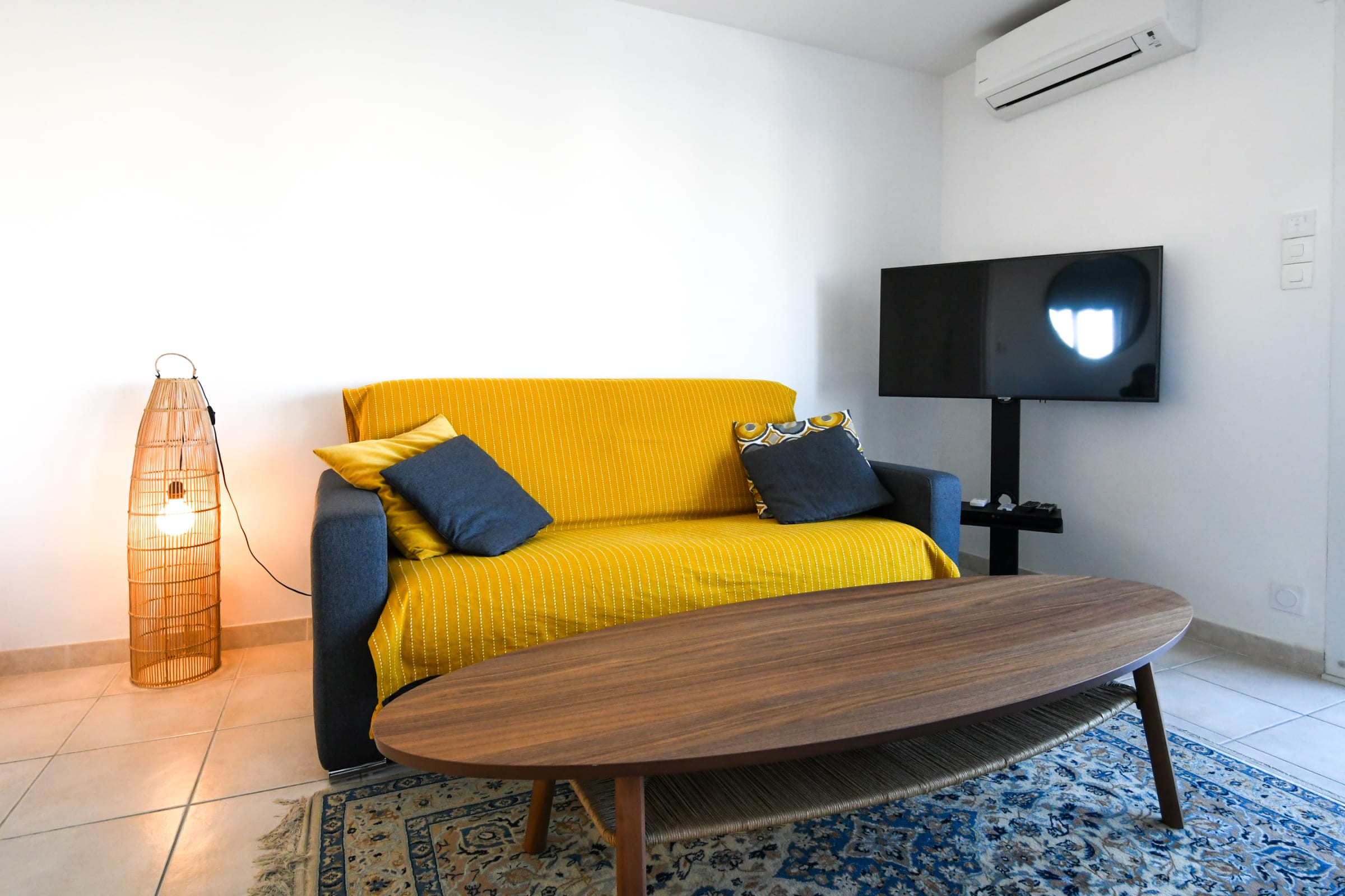 La pièce de vie est agréable et baignée de lumière, avec un canapé convertible, une TV, et la climatisation. Appréciez le calme et reposez-vous dans une des deux chambres chaleureuses à la décoration épurée.