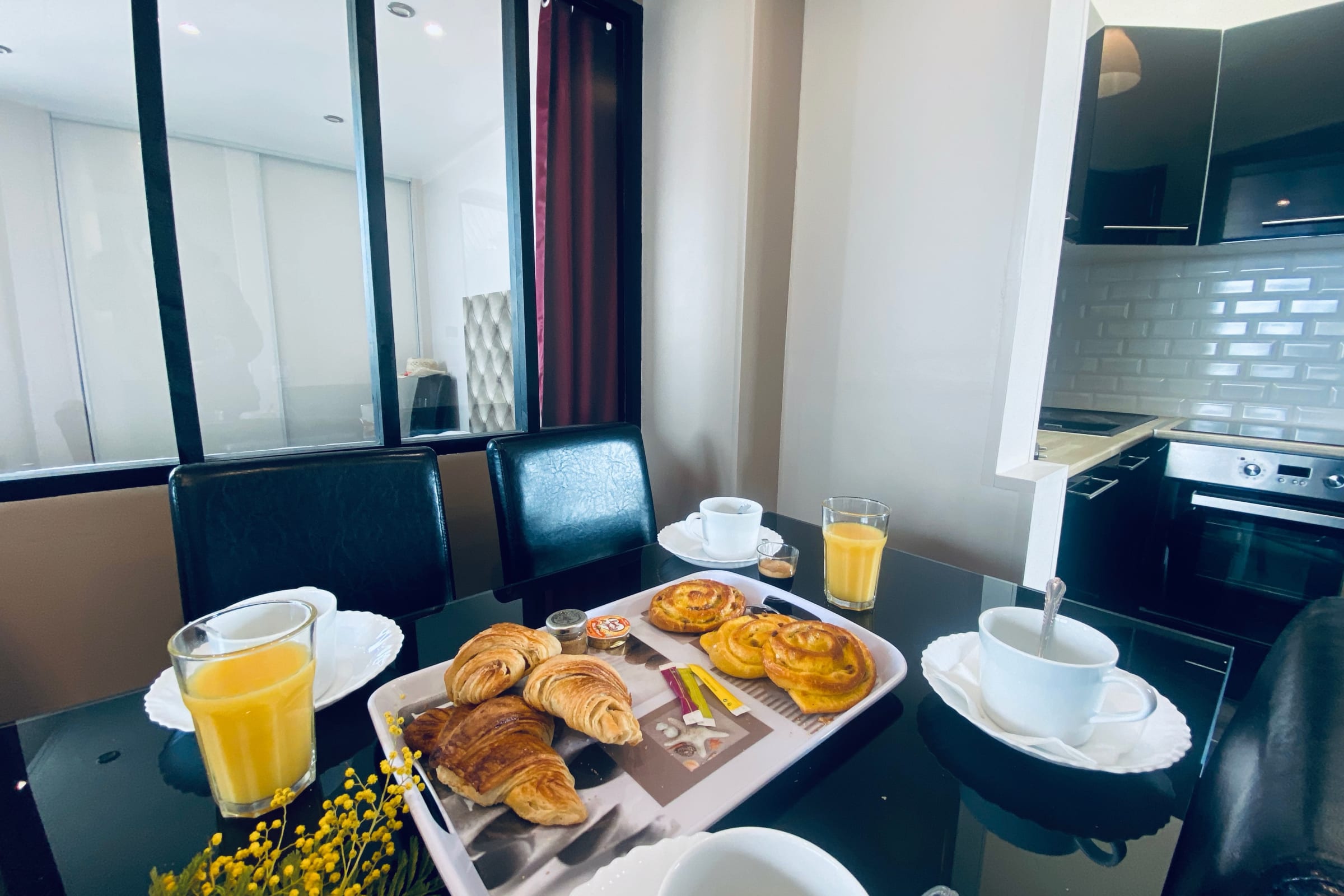 Cuisine ouverte et entièrement équipée : Machine à café, bouilloire, grille-pain, four, micro-ondes, réfrigérateur, ustensiles etc
