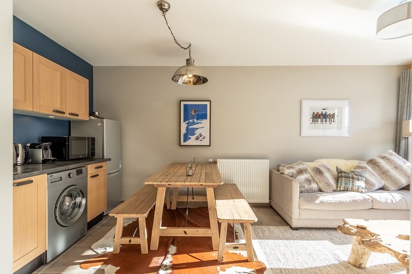 - Une cuisine ouverte entièrement équipée avec un réfrigérateur/congélateur, un lave-vaisselle, un lave-linge séchant, des plaques vitrocéramique, un four traditionnel, un four micro-ondes et une cafetière Nespresso.