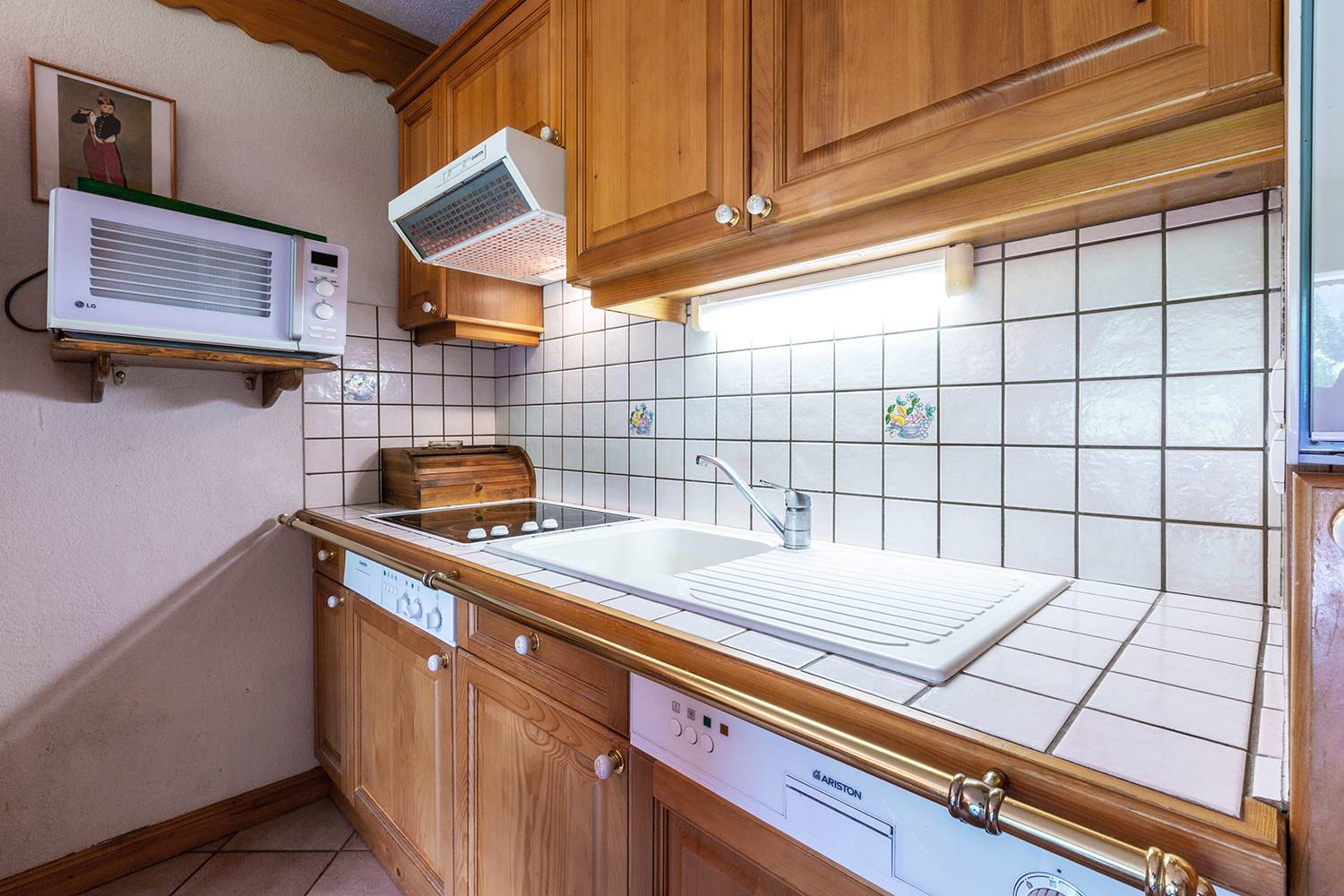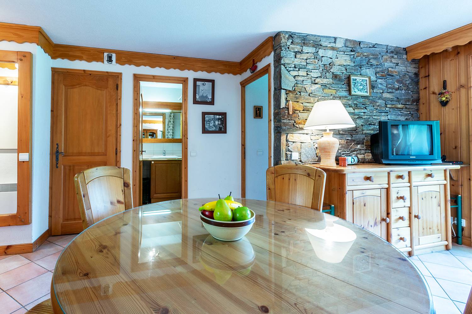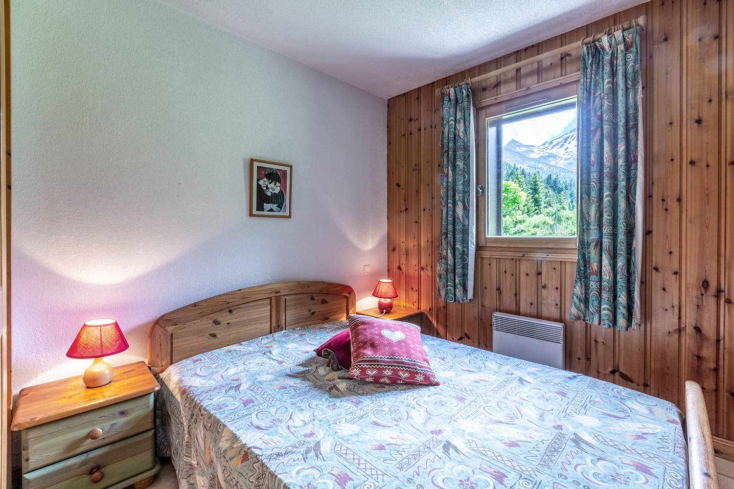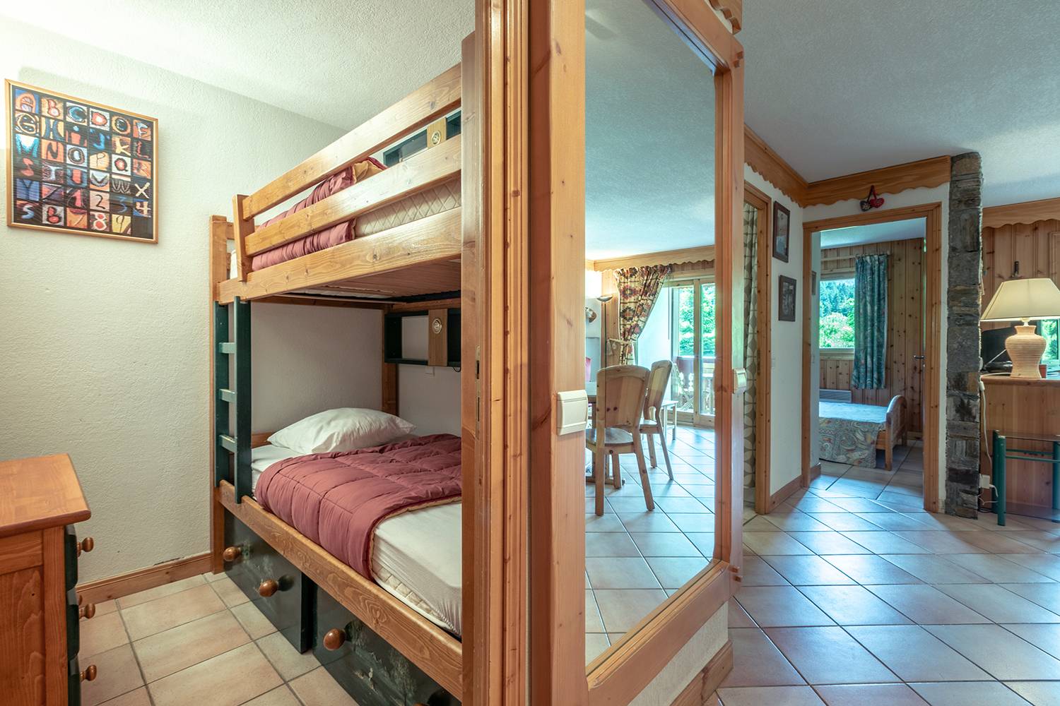 Le séjour est composé d'une banquette lit, d'un lit gigogne (80x190) et d'une télévision. Chambre cabine avec lits superposés (90x190). Chambre avec 1 lit double (140x190). Cuisine ouverte sur le séjour équipée de plaques vitrocéramique, four, lave vaisselle, réfrigérateur, lave linge, four micro-ondes, grille-pain, bouilloire, cafetière. Salle de bains, WC séparés. Balcon. Casier à skis dans la résidence. Rez-de-chaussée. Appartement non-fumeur. Animaux non admis.