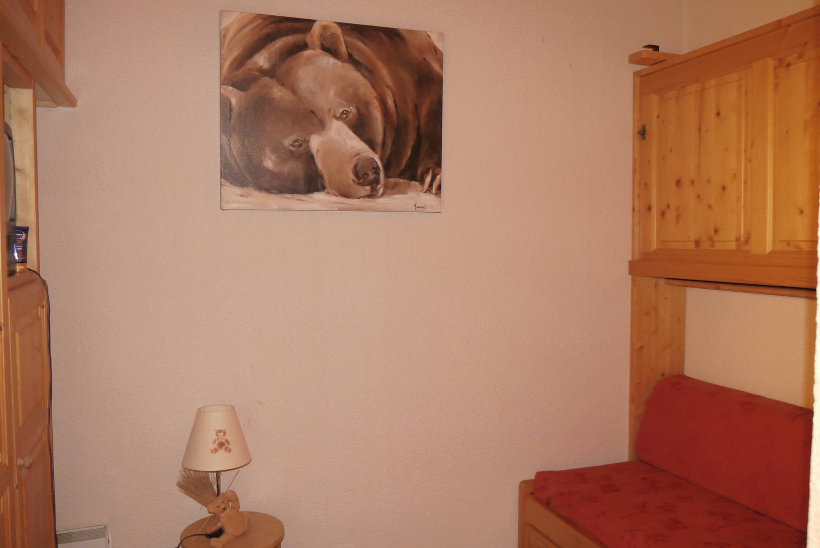 Séjour comprenant une banquette simple et télévision. Mezzanine ouverte sur l'escalier avec Salle de bain, coin couchage avec lit simple et lit tiroir et coin couchage avec lit simple.Cuisine équipée de plaques vitro, four, micro ondes, lave vaisselle, réfrigérateur, bouilloire, grille pain, cafetière Bosch Tassimo. Wc au rez-de-chaussée. Appartement non-fumeur. Animaux non admis. Balcon, casier à skis et ascenseur dans la résidence.