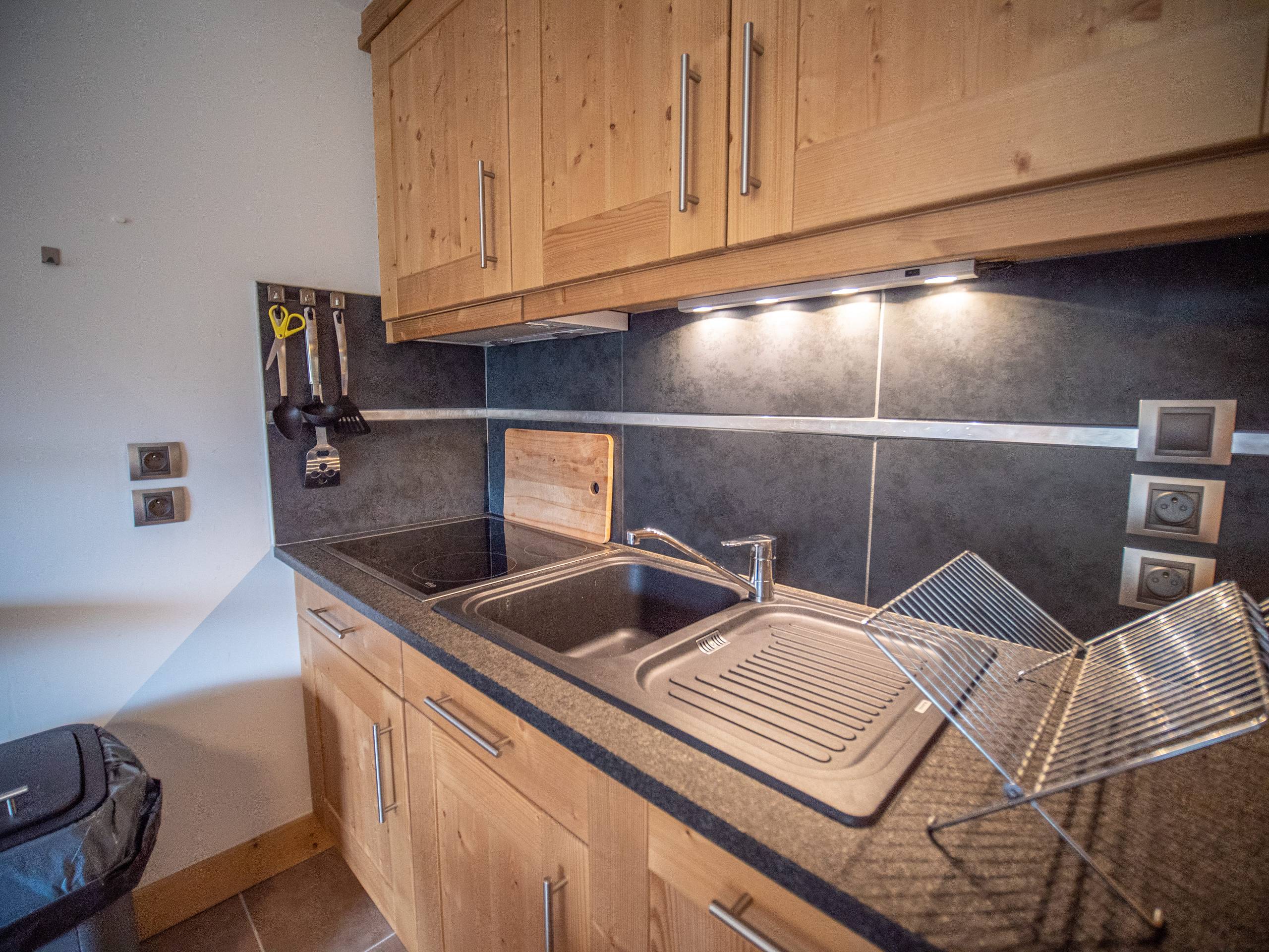 - Cuisine ouverte équipée avec lave-vaisselle, plaques vitrocéramiques, four combiné micro-ondes, réfrigérateur avec freezer, cafetière italienne, bouilloire, grille-pain, appareil à raclette