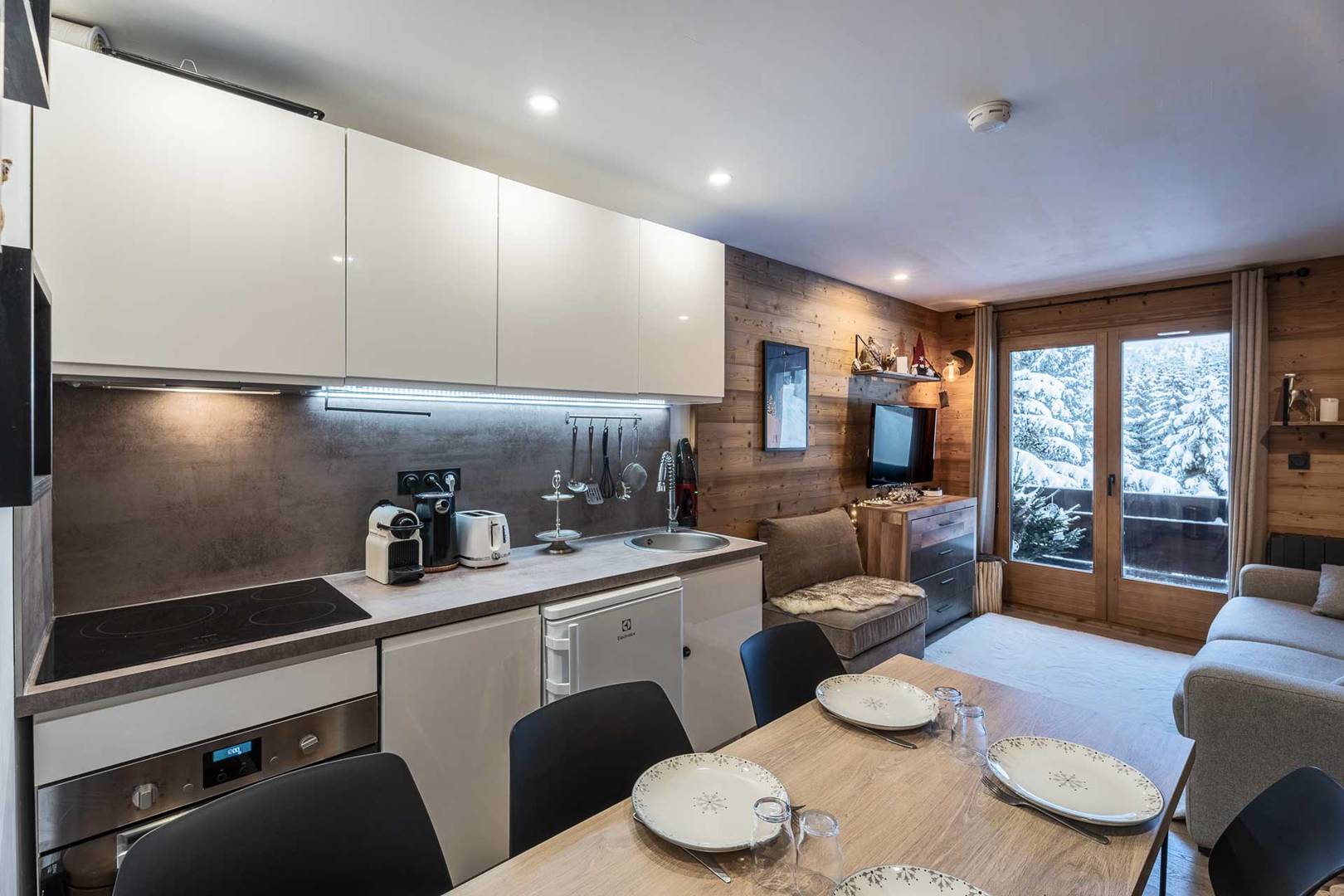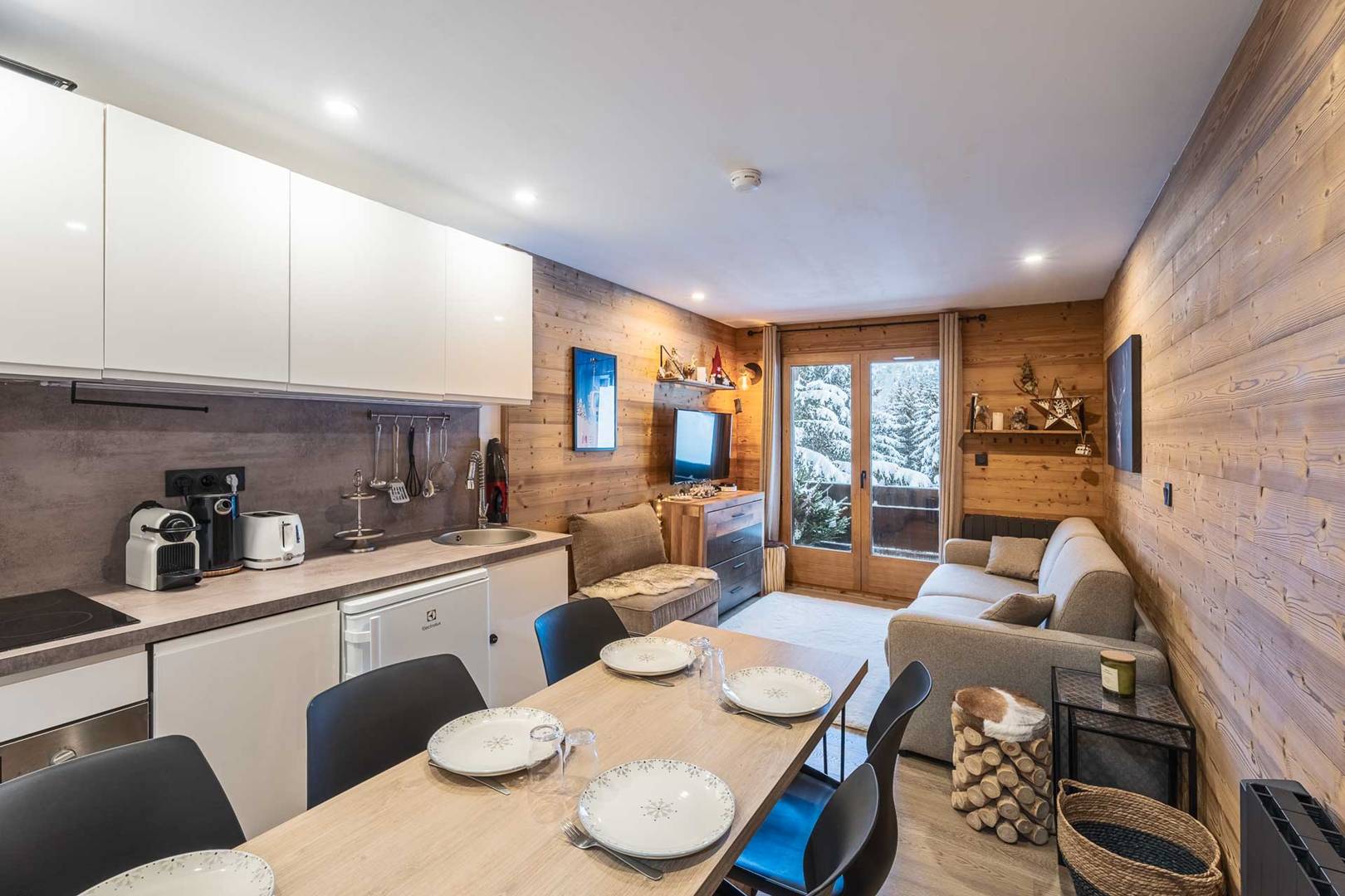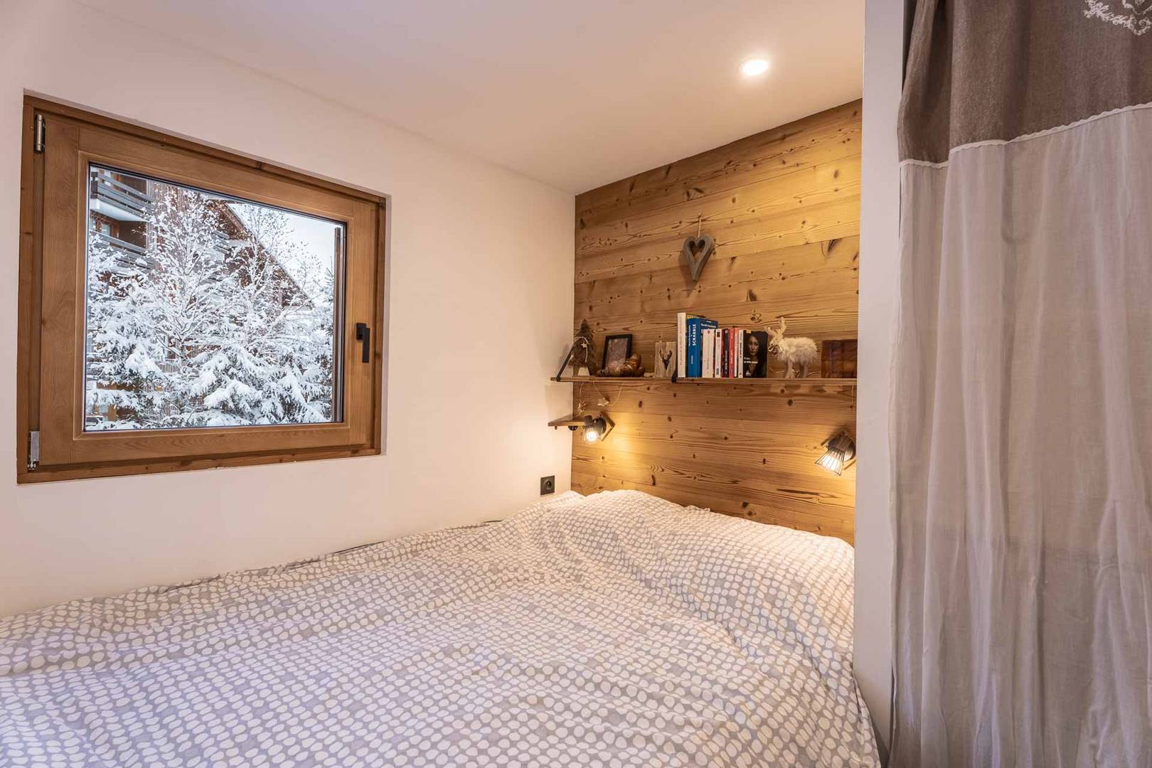 Une chambre avec lit double (140x200), grands rangements. Un Coin montagne (chambre sans fenêtre) avec lits superposés (90x200), grands rangements et TV écran plat. Salle d'eau avec douche, WC, vasque et sèche serviette. Cuisine dans le séjour avec 4 plaques à induction, lave-vaisselle, four micro-ondes combiné, réfrigérateur, cafetière Nespresso et traditionnelle, Bouilloire, grille-pain, hotte. Balcon avec table et chaises. Accès Wifi privatif et gratuit. Casier à skis et ascenseur dans la résidence. Etage -2. Appartement non-fumeur / Animaux acceptés