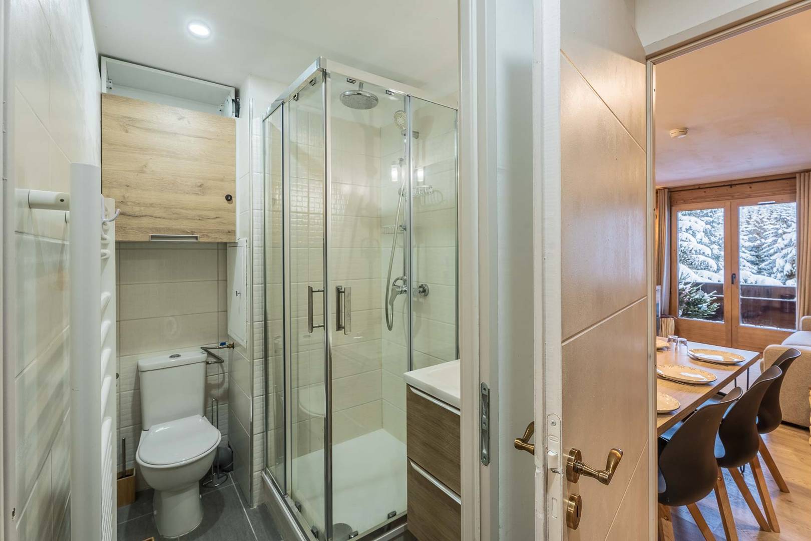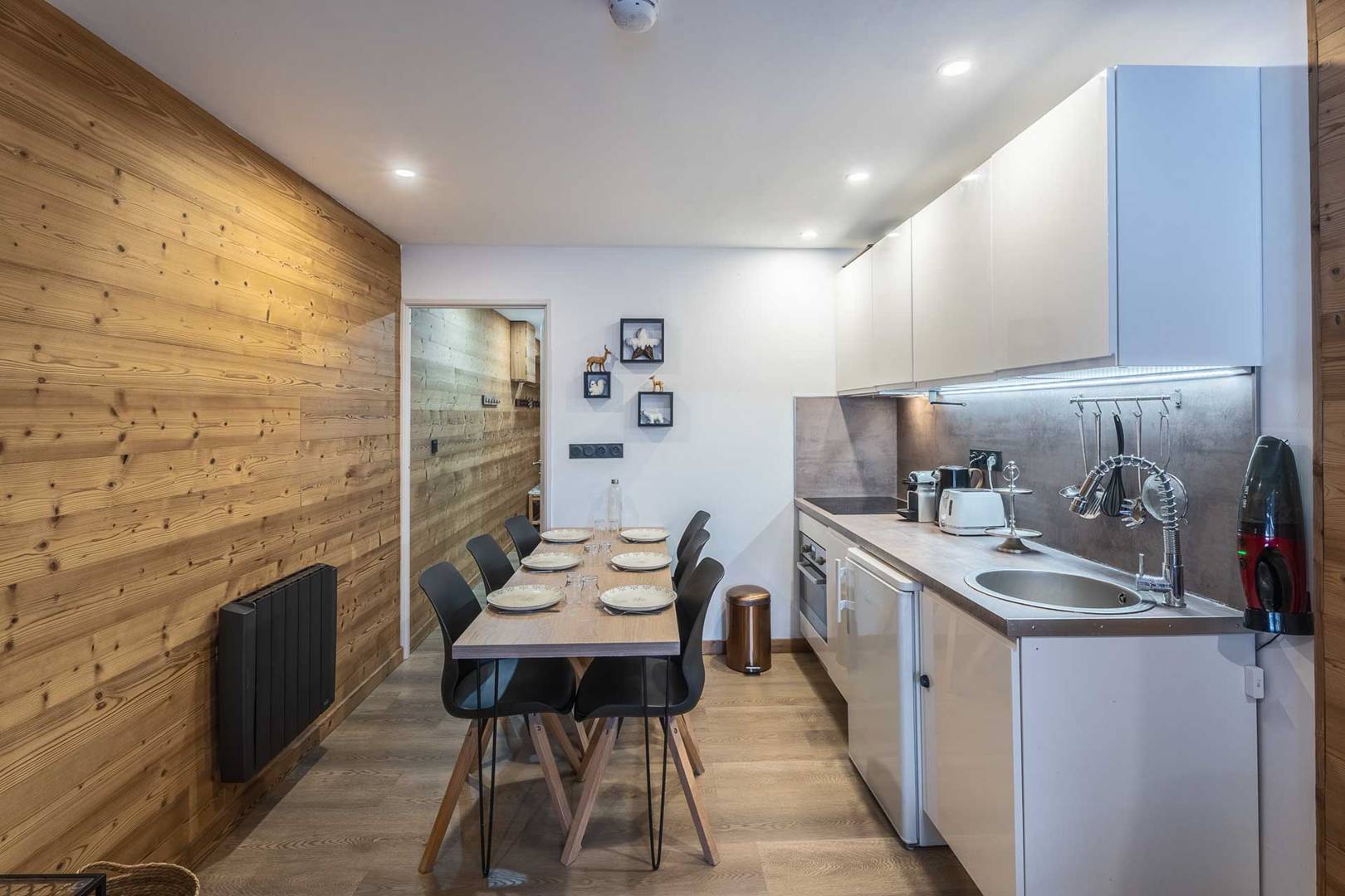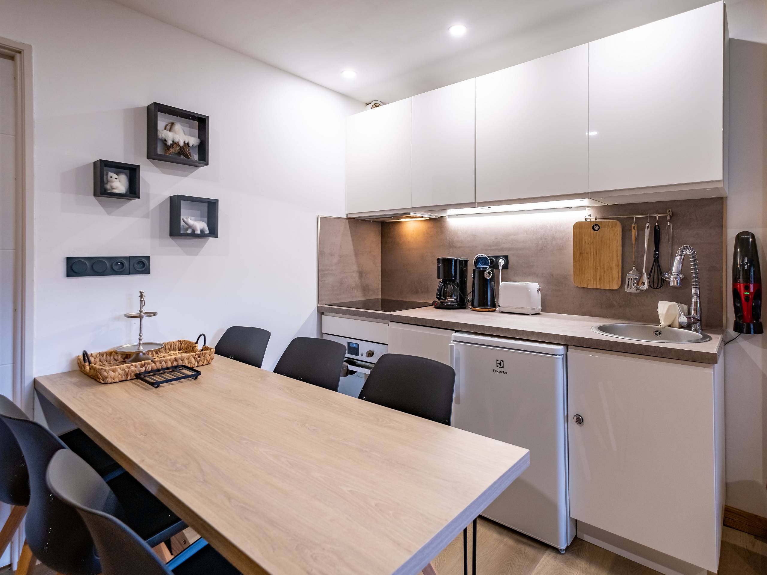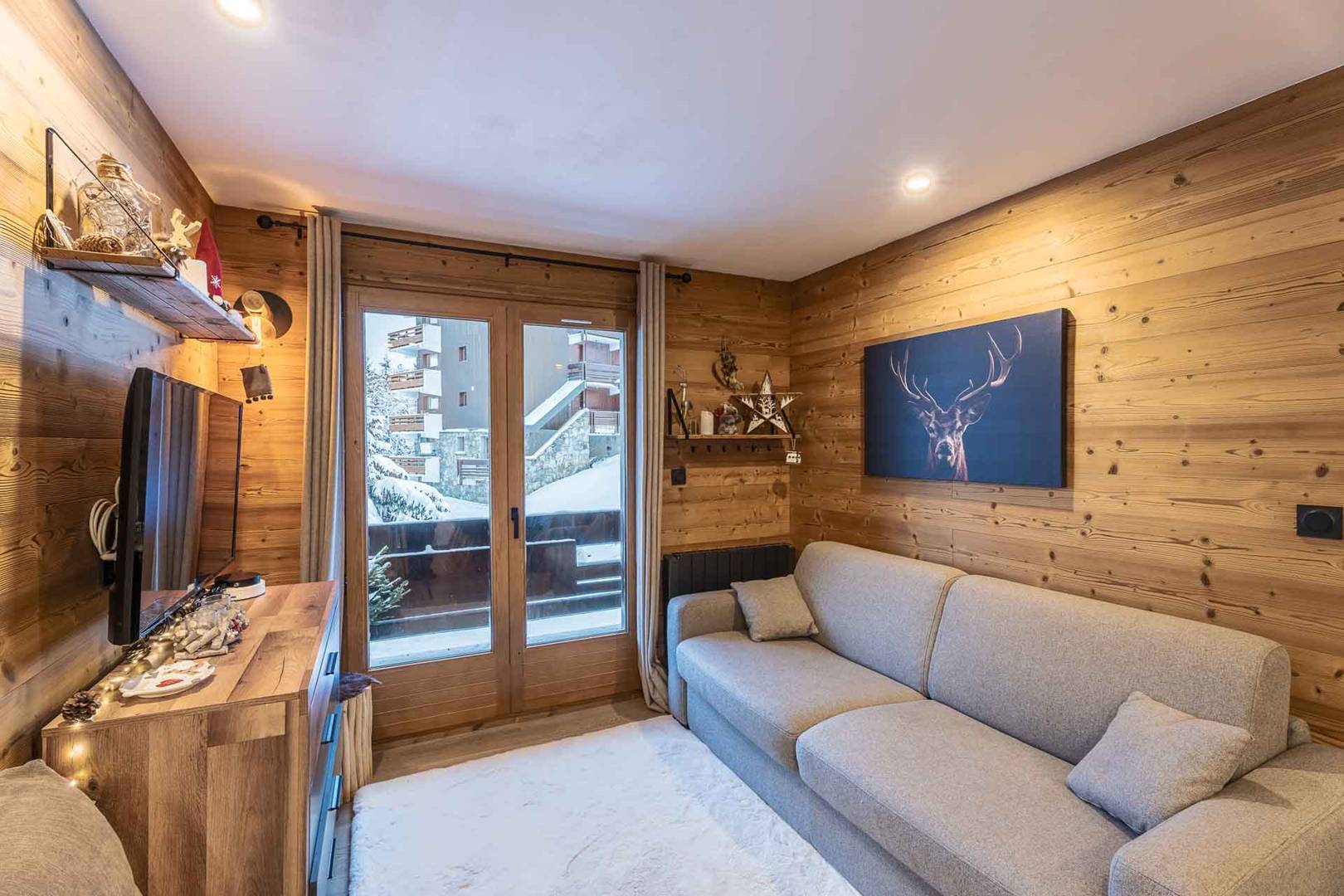 Une chambre avec lit double (140x200), grands rangements. Un Coin montagne (chambre sans fenêtre) avec lits superposés (90x200), grands rangements et TV écran plat. Salle d'eau avec douche, WC, vasque et sèche serviette. Cuisine dans le séjour avec 4 plaques à induction, lave-vaisselle, four micro-ondes combiné, réfrigérateur, cafetière Nespresso et traditionnelle, Bouilloire, grille-pain, hotte. Balcon avec table et chaises. Accès Wifi privatif et gratuit. Casier à skis et ascenseur dans la résidence. Etage -2. Appartement non-fumeur / Animaux acceptés