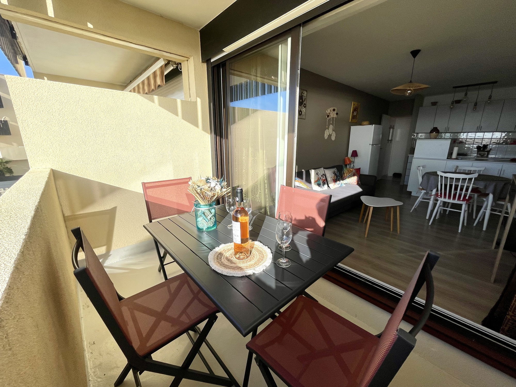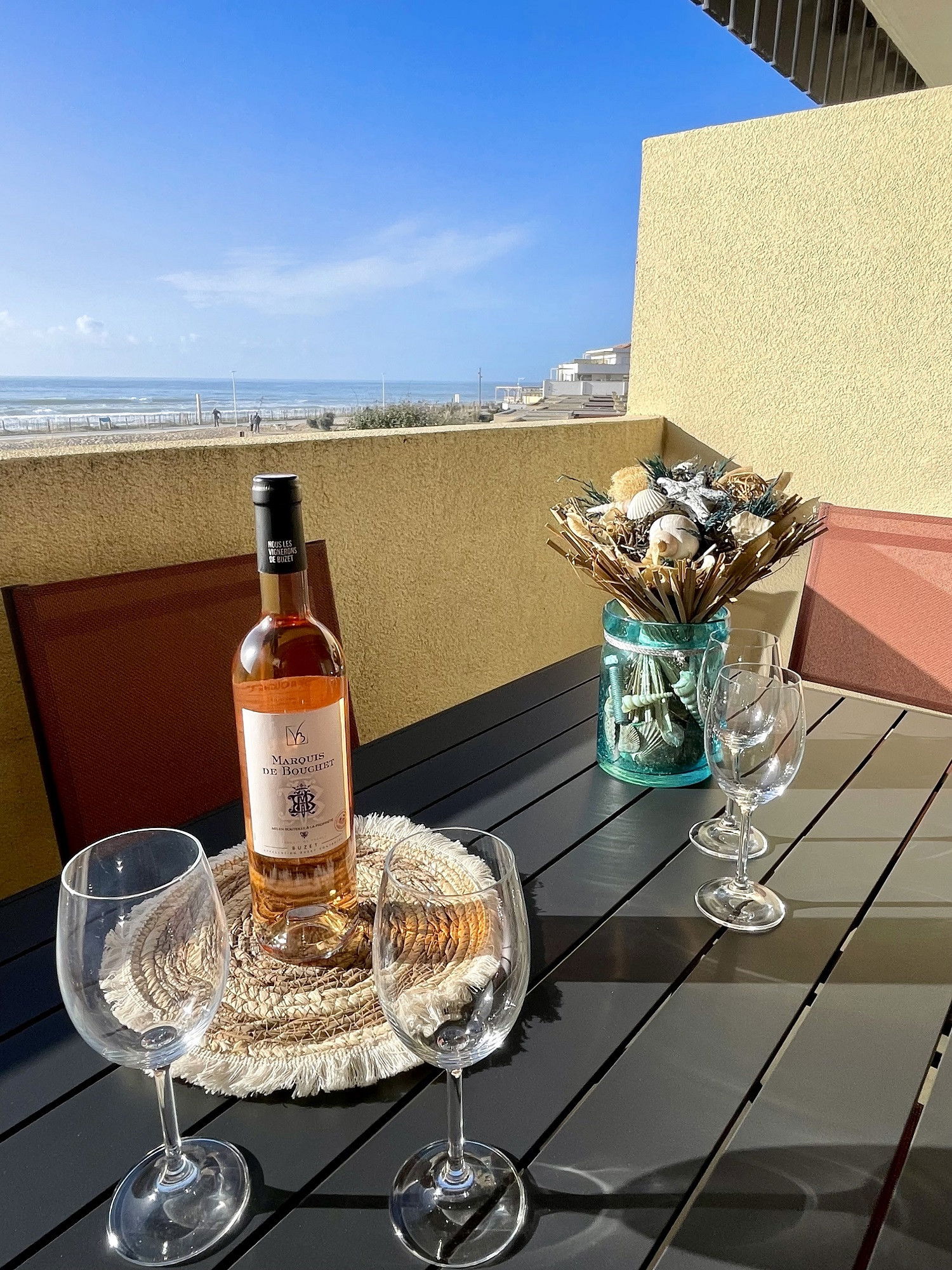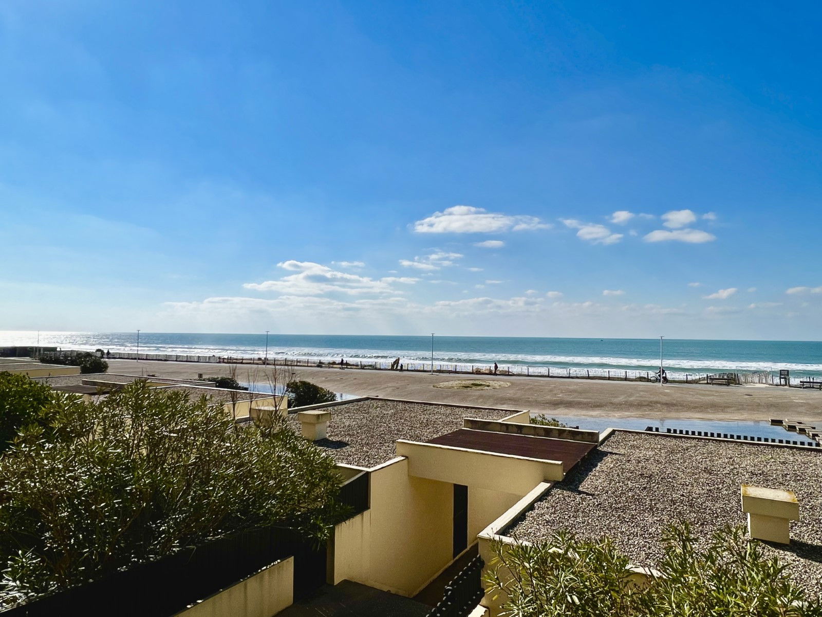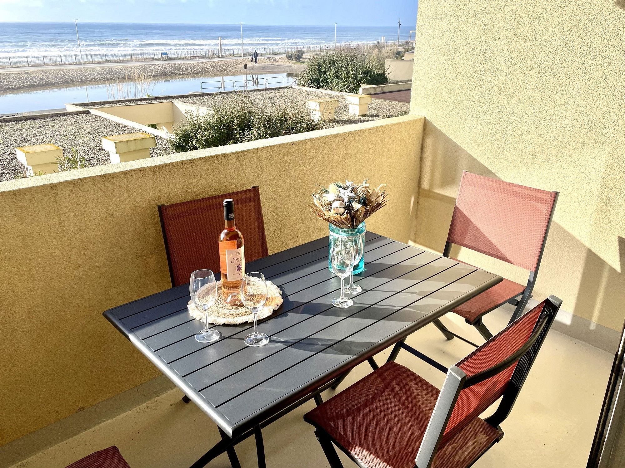 Le balcon, accessible depuis le séjour, offre une vue dégagée sur l’océan et est aménagé avec un salon de jardin, idéal pour profiter des repas en extérieur ou des couchers de soleil. Une place de parking privative complète ce bien.