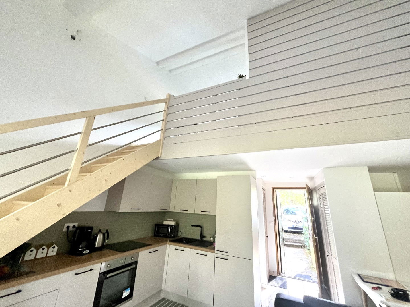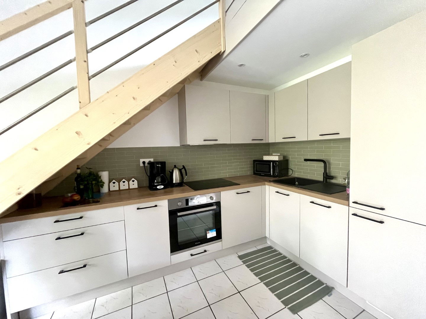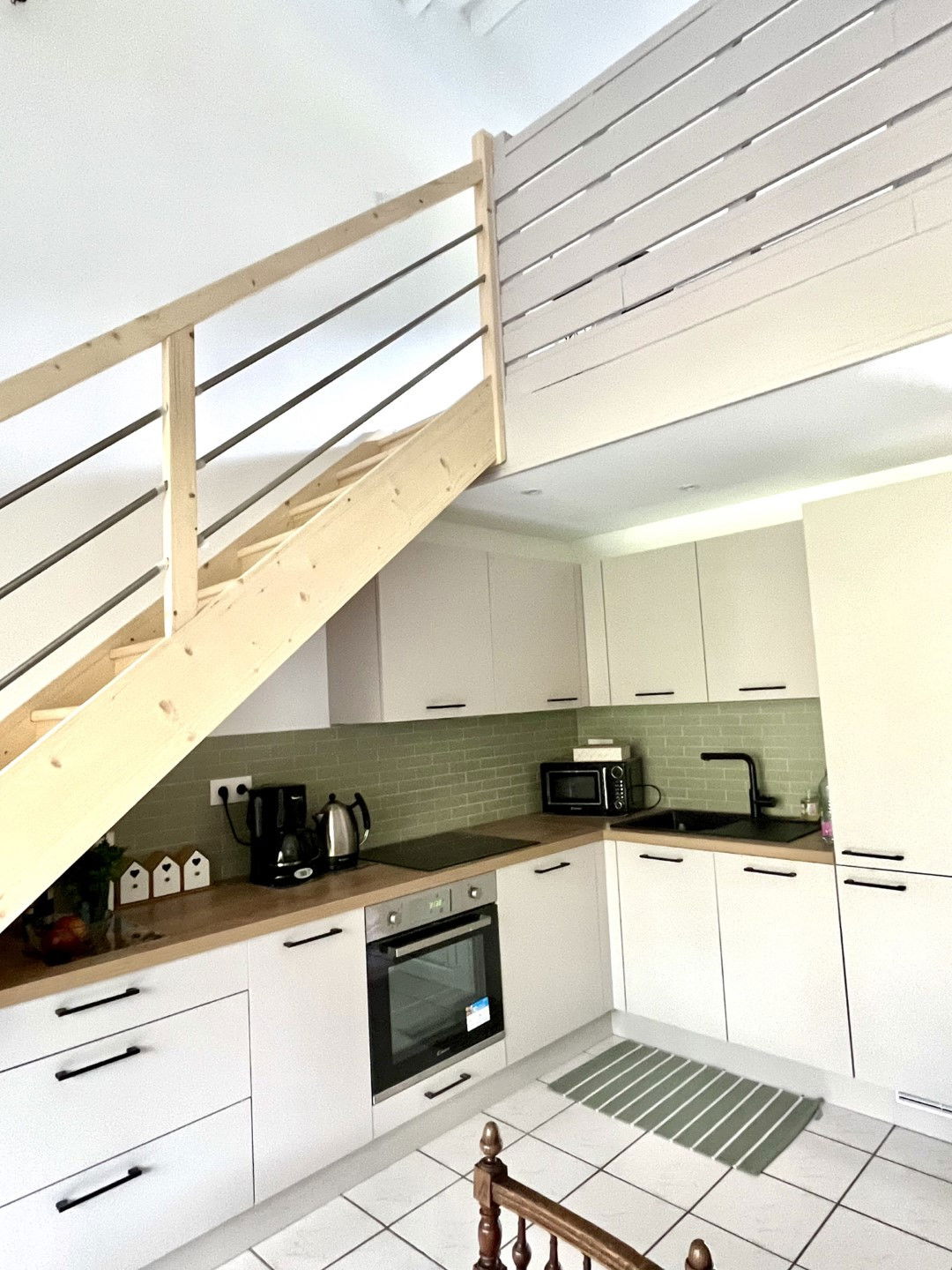 Le séjour est lumineux et accueillant, équipé d’une table, de chaises, d’un canapé et d’une télévision. La cuisine ouverte est fonctionnelle et bien équipée avec plaques de cuisson, four, micro-ondes, réfrigérateur/congélateur, lave-vaisselle, rangements et tout le nécessaire pour cuisiner. Une salle de bains avec douche et lavabo ainsi qu’un WC indépendant complètent le rez-de-chaussée.