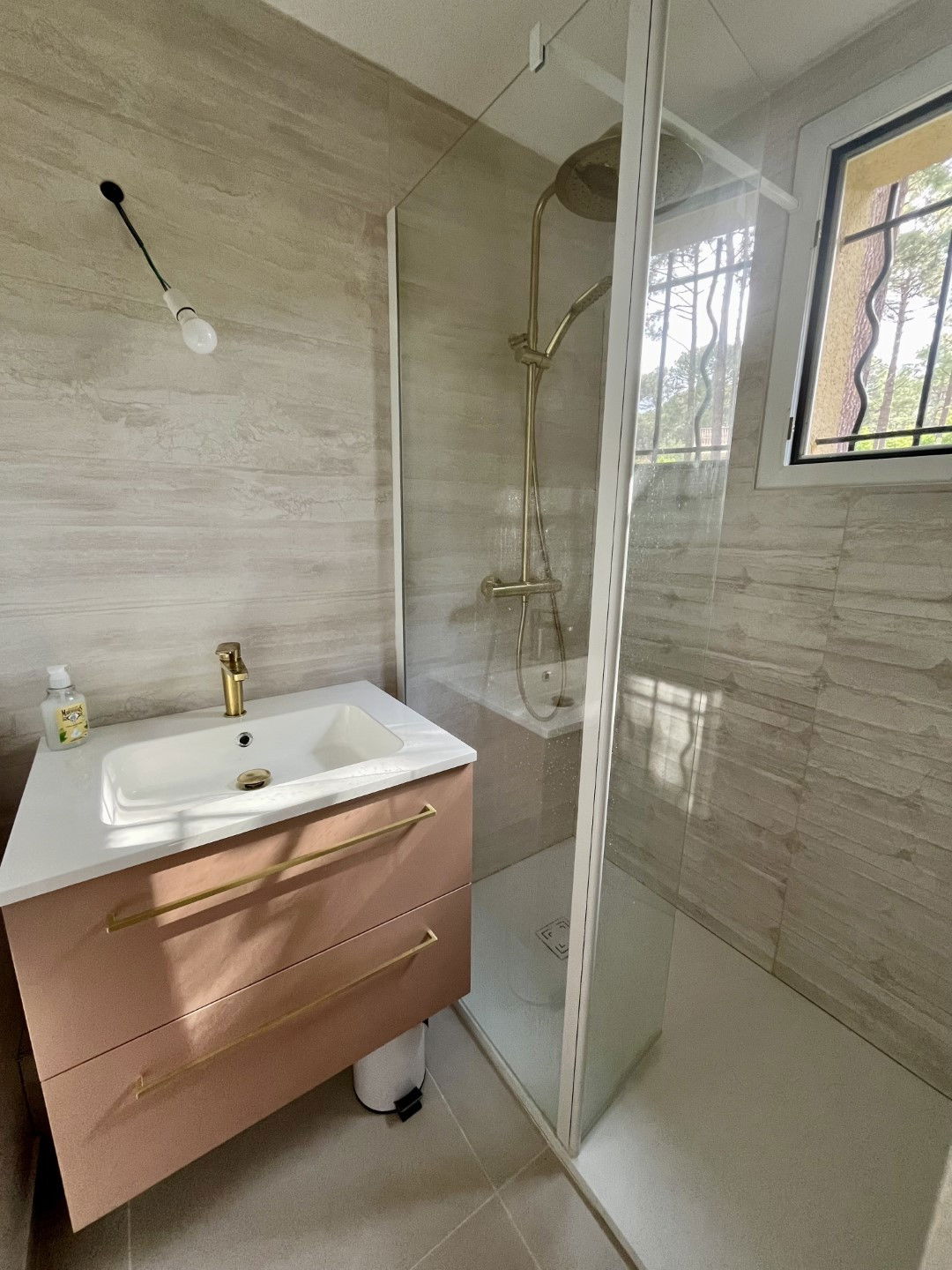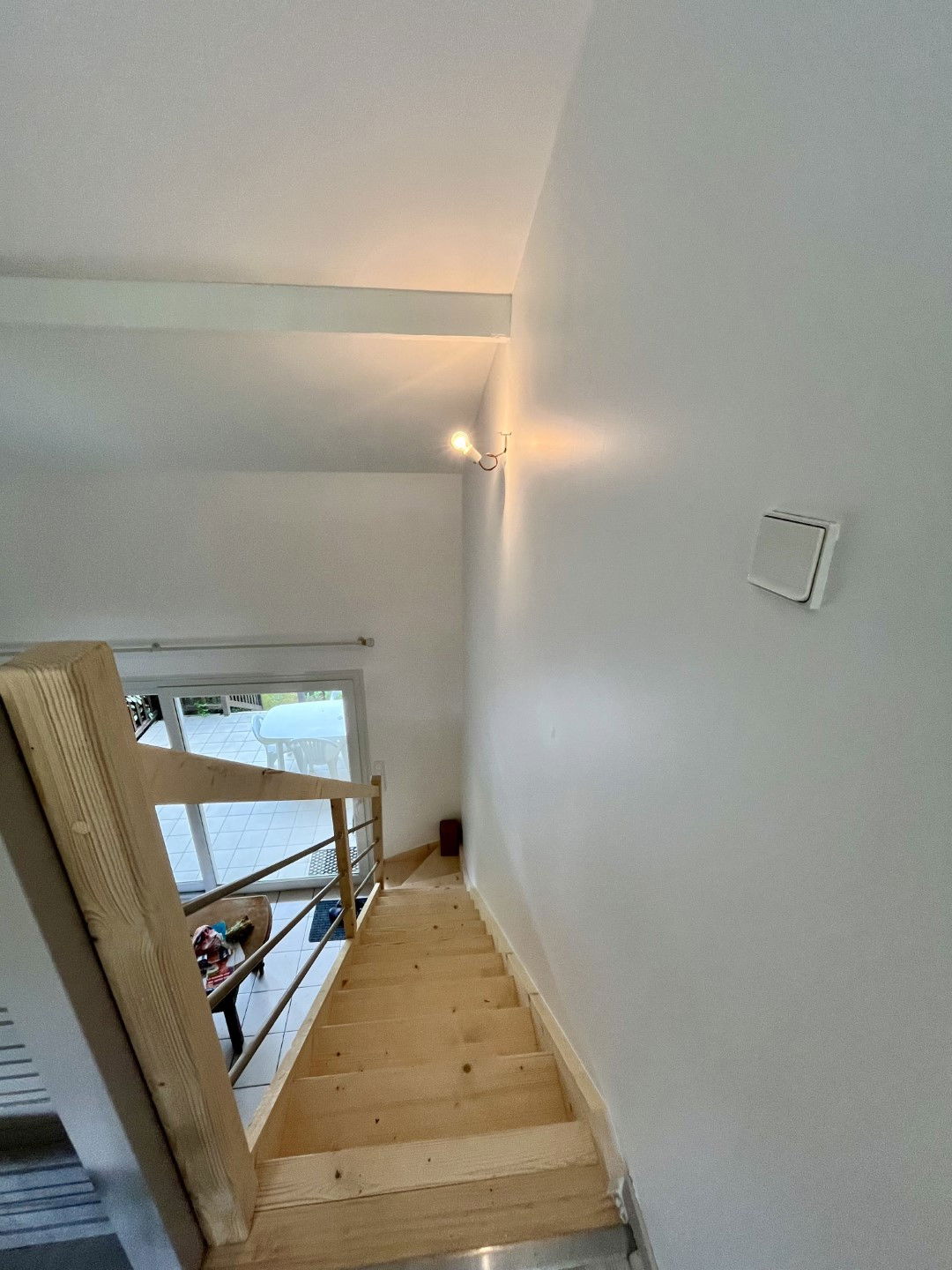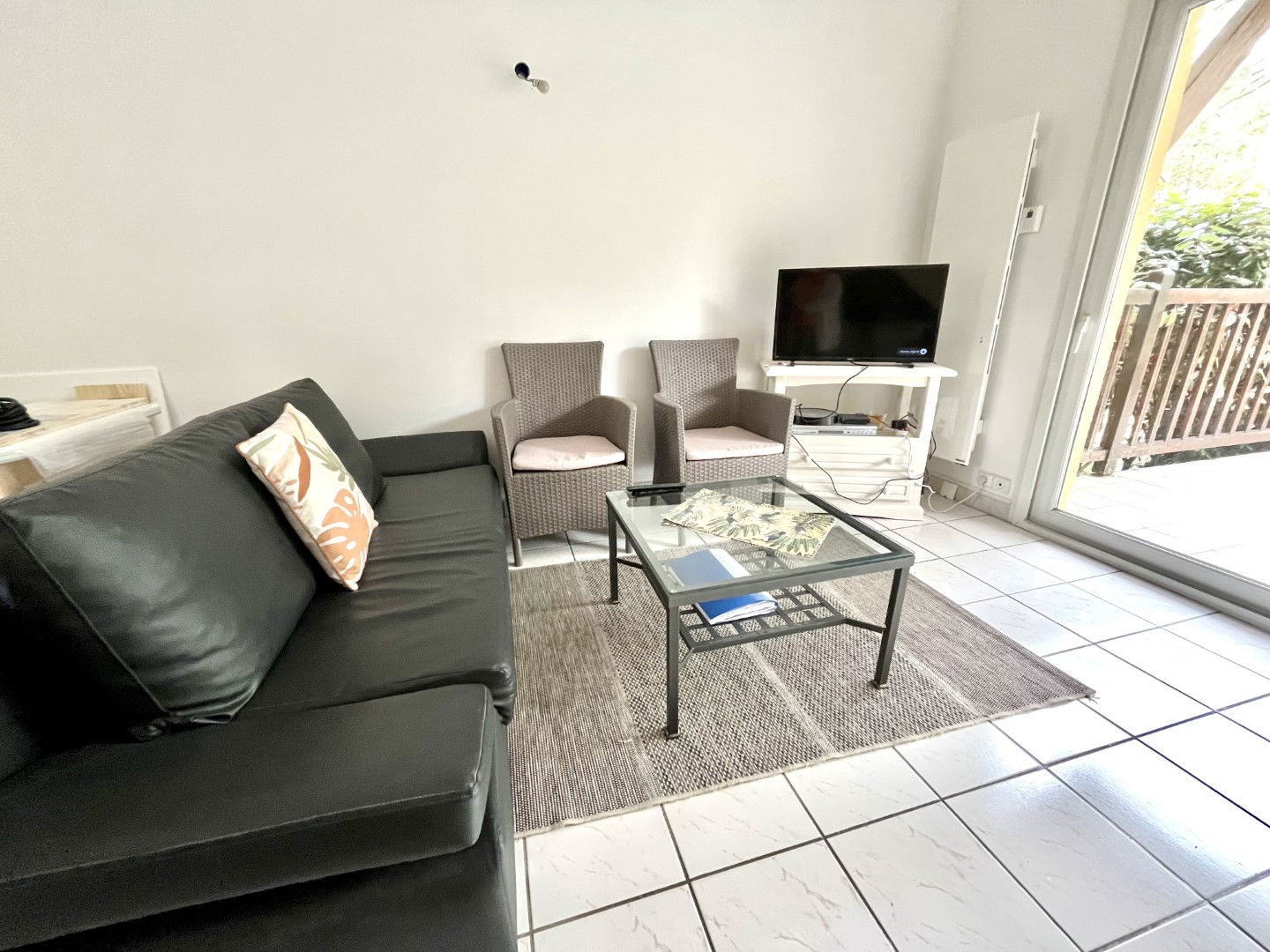 Le séjour est lumineux et accueillant, équipé d’une table, de chaises, d’un canapé et d’une télévision. La cuisine ouverte est fonctionnelle et bien équipée avec plaques de cuisson, four, micro-ondes, réfrigérateur/congélateur, lave-vaisselle, rangements et tout le nécessaire pour cuisiner. Une salle de bains avec douche et lavabo ainsi qu’un WC indépendant complètent le rez-de-chaussée.