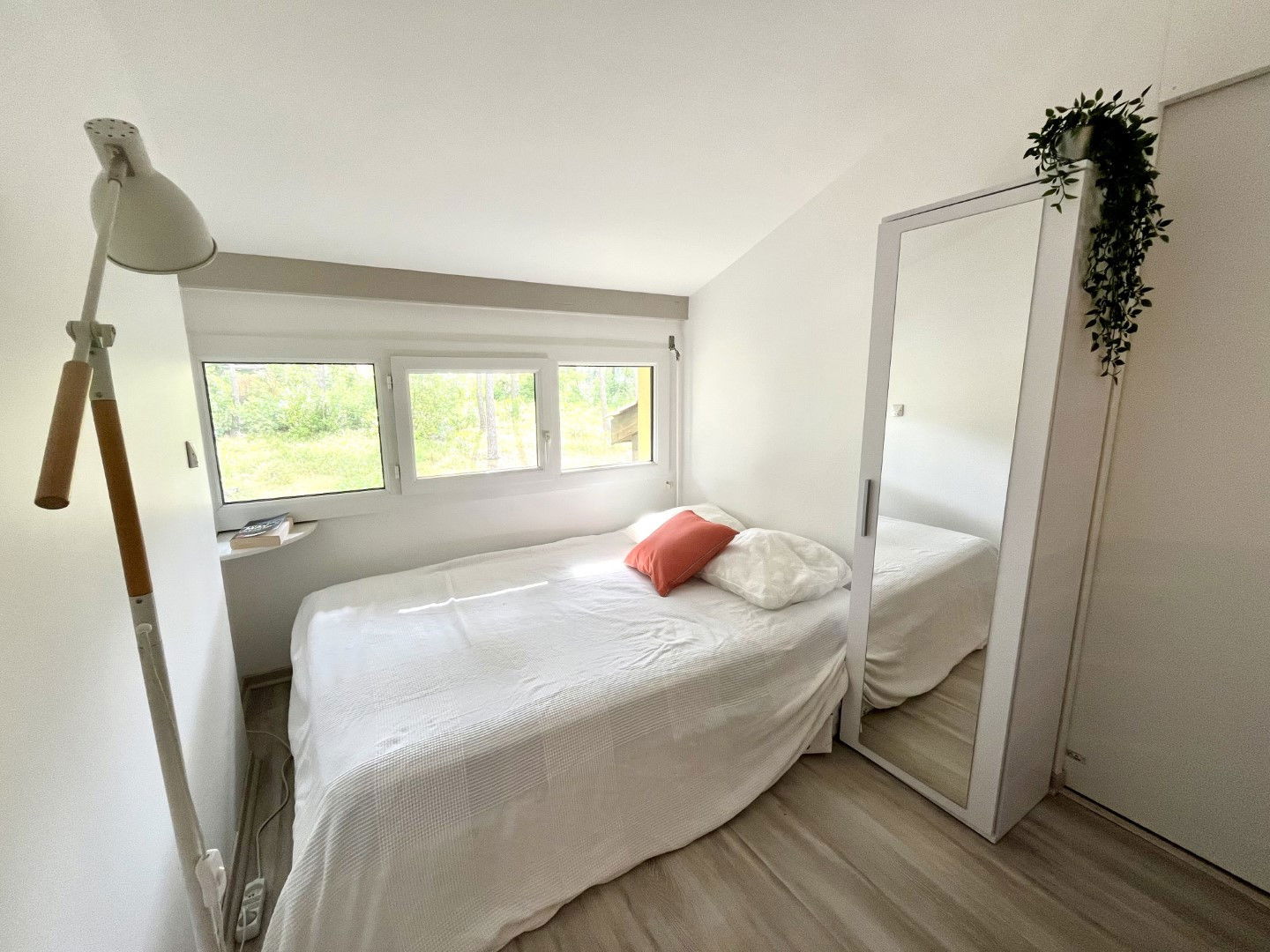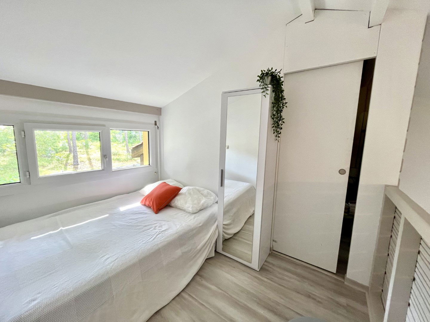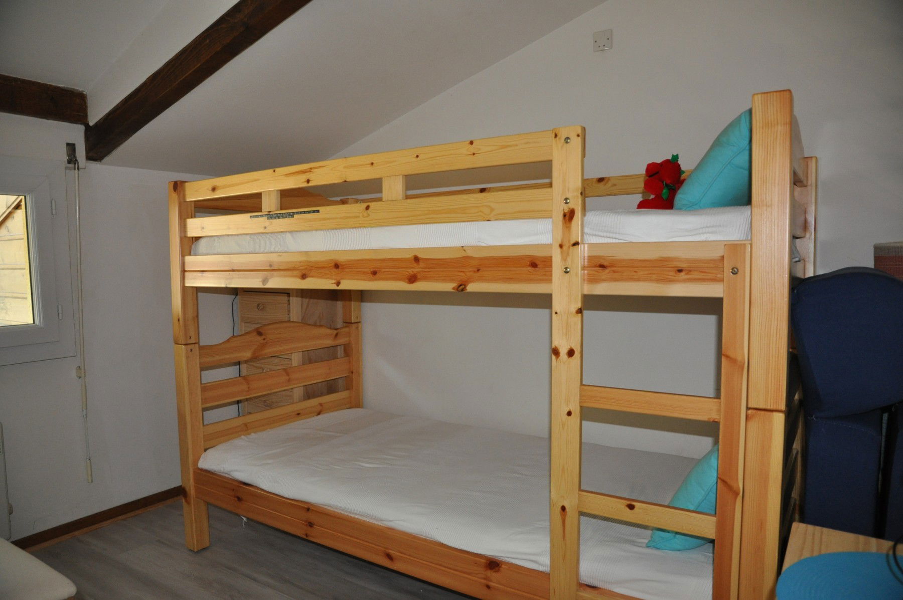 À l’étage, la mezzanine ouverte accueille un lit de 140 cm et des rangements, tandis qu’une partie chambre séparée par une cloison dispose de deux lits superposés de 90 cm, offrant ainsi un espace nuit confortable pour une famille. Un cellier indépendant avec lave-linge est également à votre disposition.