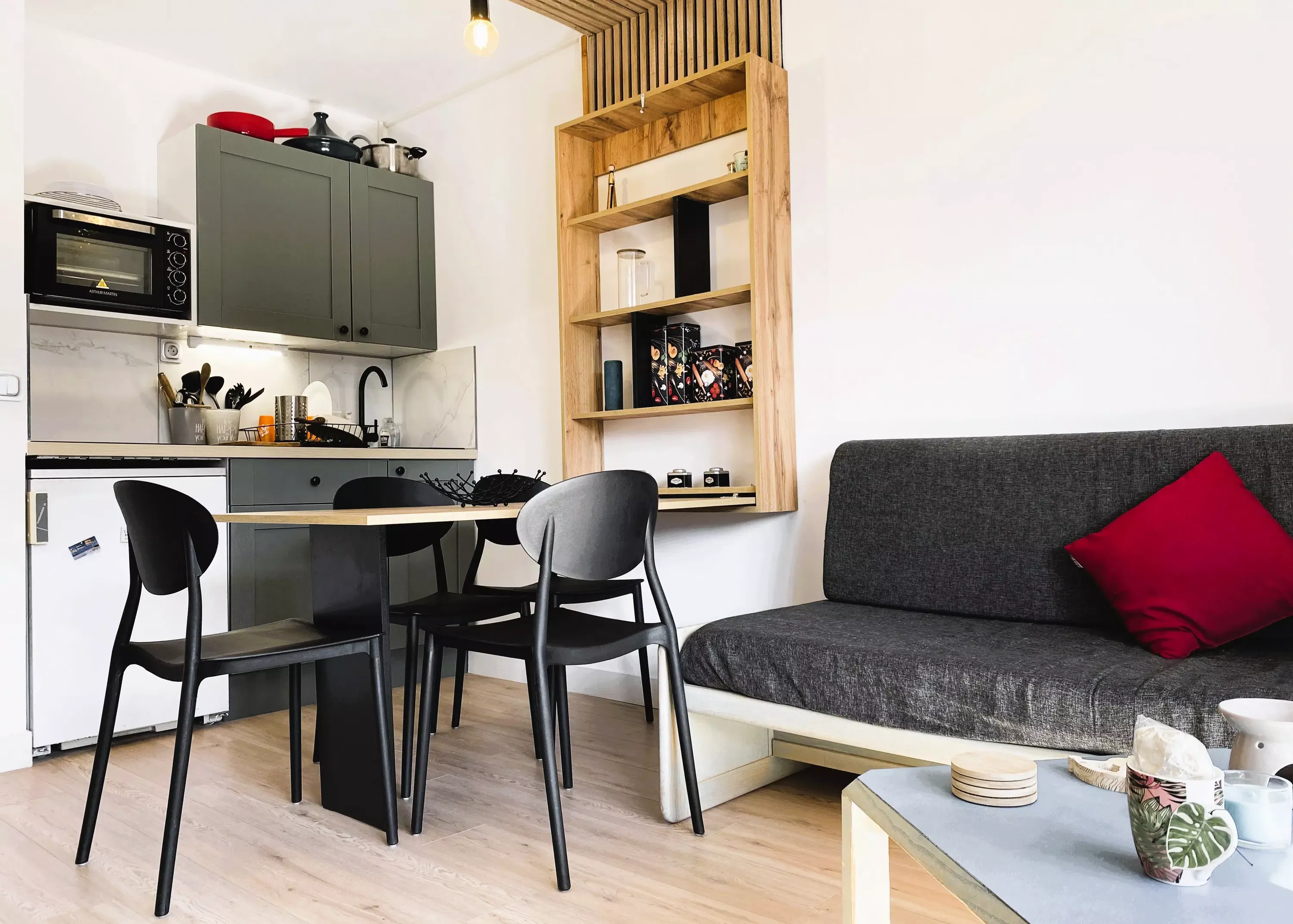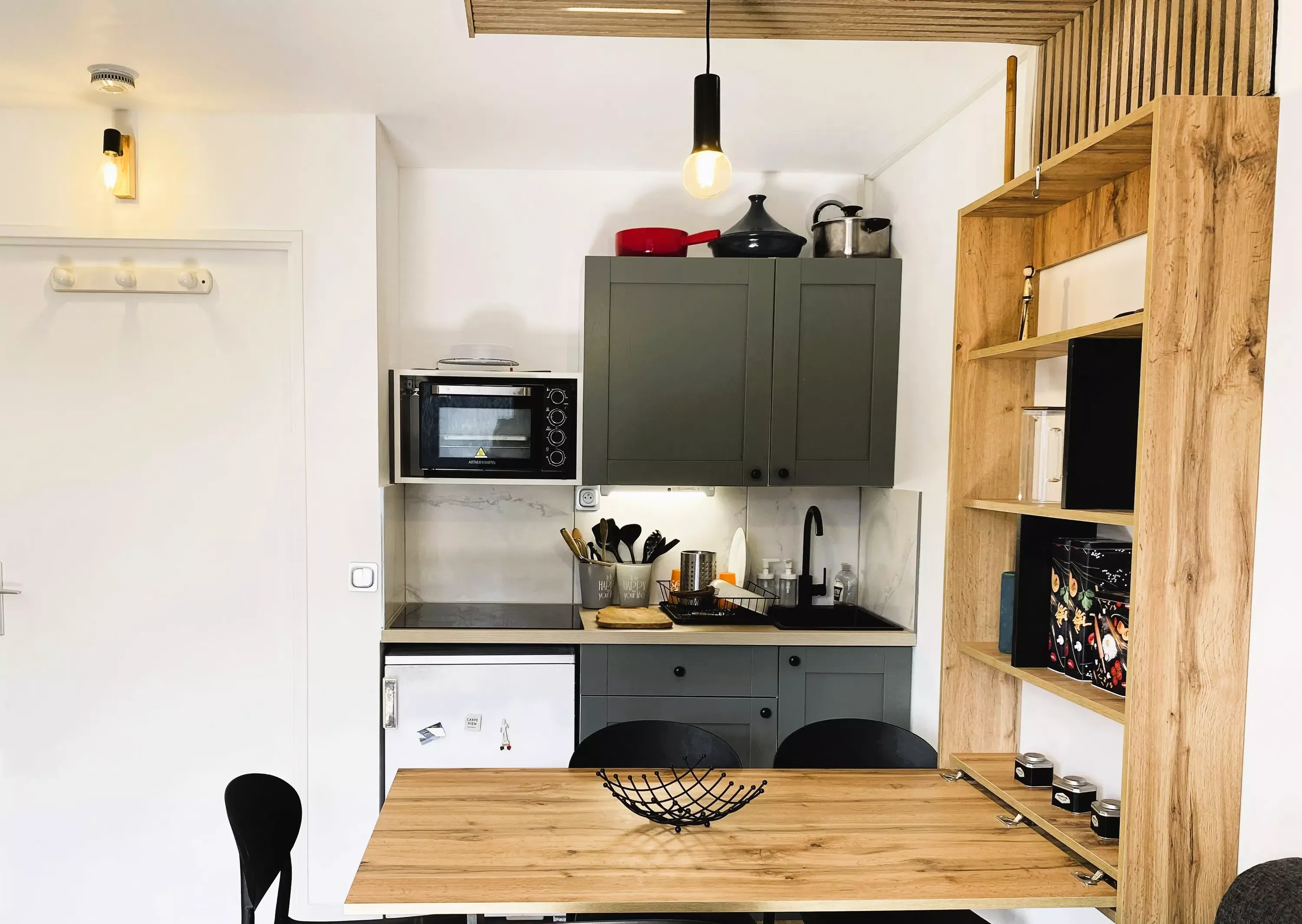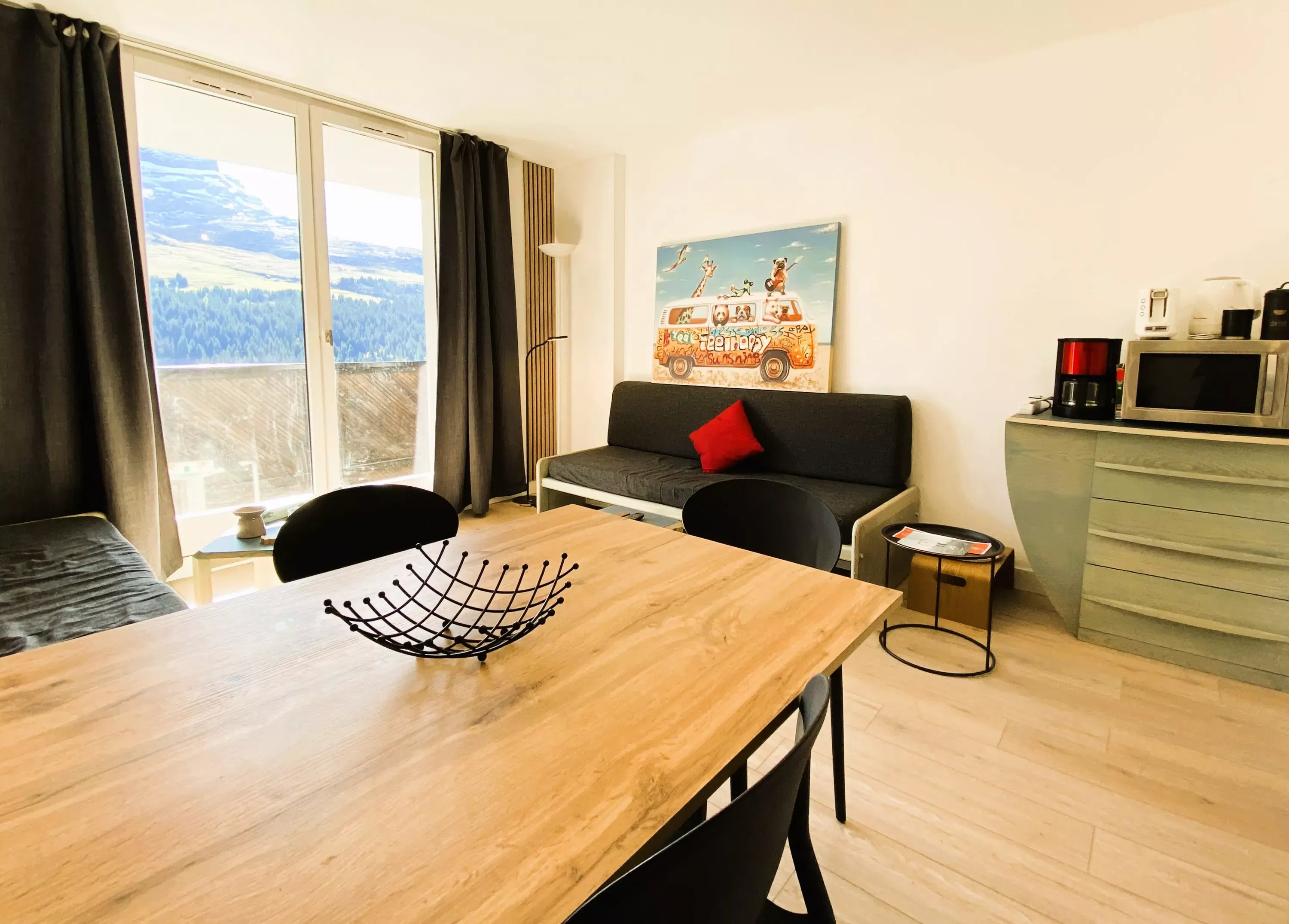 Votre location de vacances comporte : 1 séjour, 1 coin cabine, 1 cuisine, 1 salle de bain, 1 WC séparé et 1 balcon.