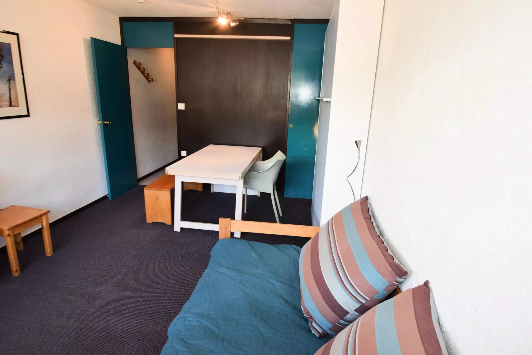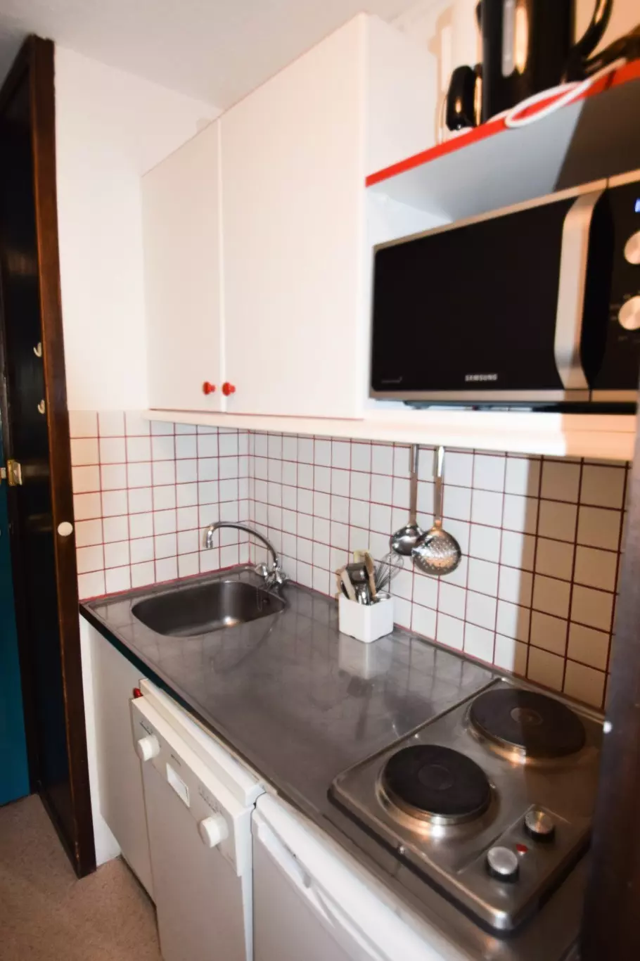 Studio 3/4pers, 22m2, exposé au Sud avec balcon, vue sur les pistes, au 4ème étage avec ascenseur. Cuisine : dans l'entrée, 2 plaques électriques, réfrigérateur, four micro-ondes/grill, lave vaisselle, cafetière électrique - Séjour : coin repas, 1 lit armoire double (150 x200 cm) , 2 lits gigognes 80 cm, TELEVISEUR - Salle de bains : baignoire, WC inclus - Literie : couettes Les sols : moquette, sauf entrée/Cuis/ Sdb : plastique - Studio avec belle vue dégagée sur les pistes, très clair, idéal pour 2 adultes et 2 enfants. Menuiseries neuves 2024. casier à skis n°440 au RDC côté UCPA - La Résidence : située au pied des pistes, reliée aux commerces par galerie couverte - Parking extérieur à proximité de la résidence.