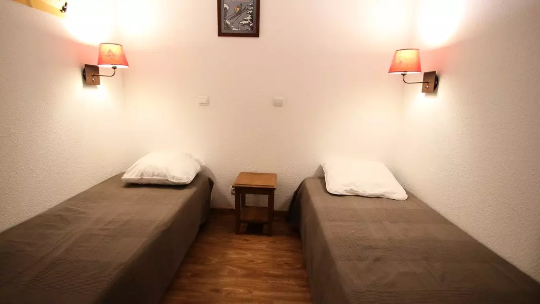 - Couchages : une chambre avec lit double (140x190) et une chambre cabine avec deux lits simples (80x190) et étagères de rangement. Lits équipés de couettes et oreillers 60x60.
