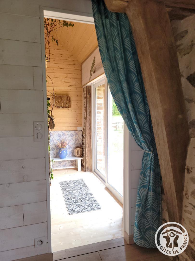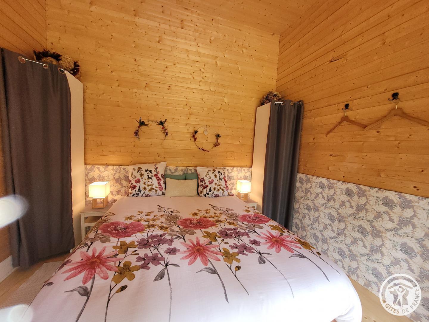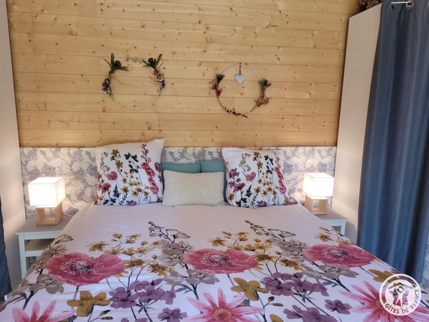 A l'étage : 1 salon avec canapé d'angle, livres, jeux de société,wifi fibre,enceinte connectée/salle à manger/cuisine plaque 4 feux à gaz, un micro-ondes, 2 cafetières, 1 bouilloire, un grille-pain, un service à raclette... , 1 salle d'eau, 1 WC indépendant avec lave main , une marche descendante une jolie chambre avec lit de 160x200 avec un accès direct à la terrasse.