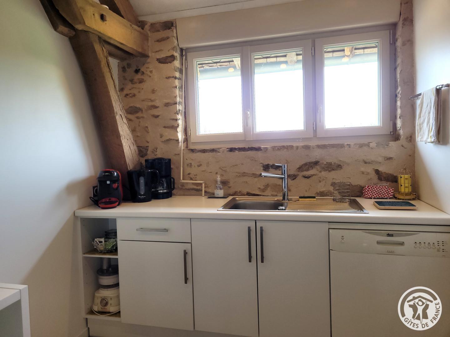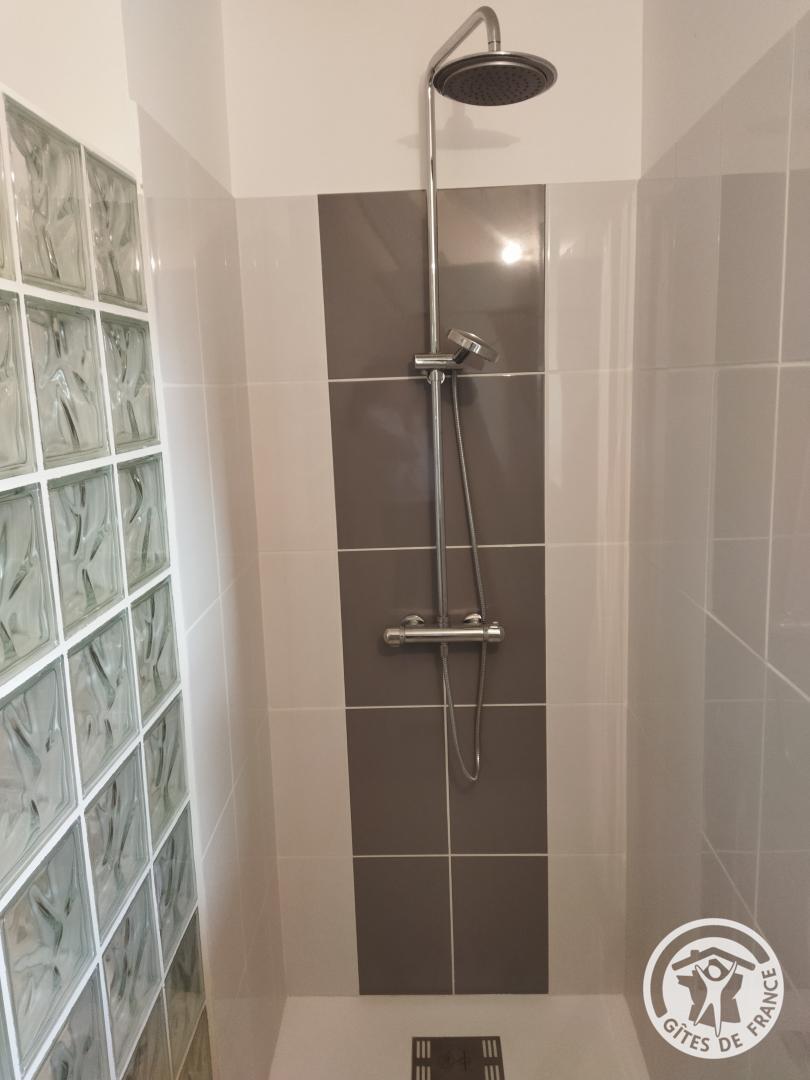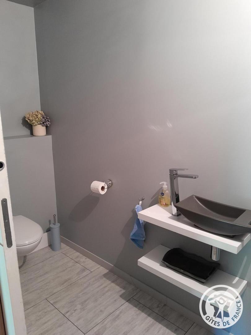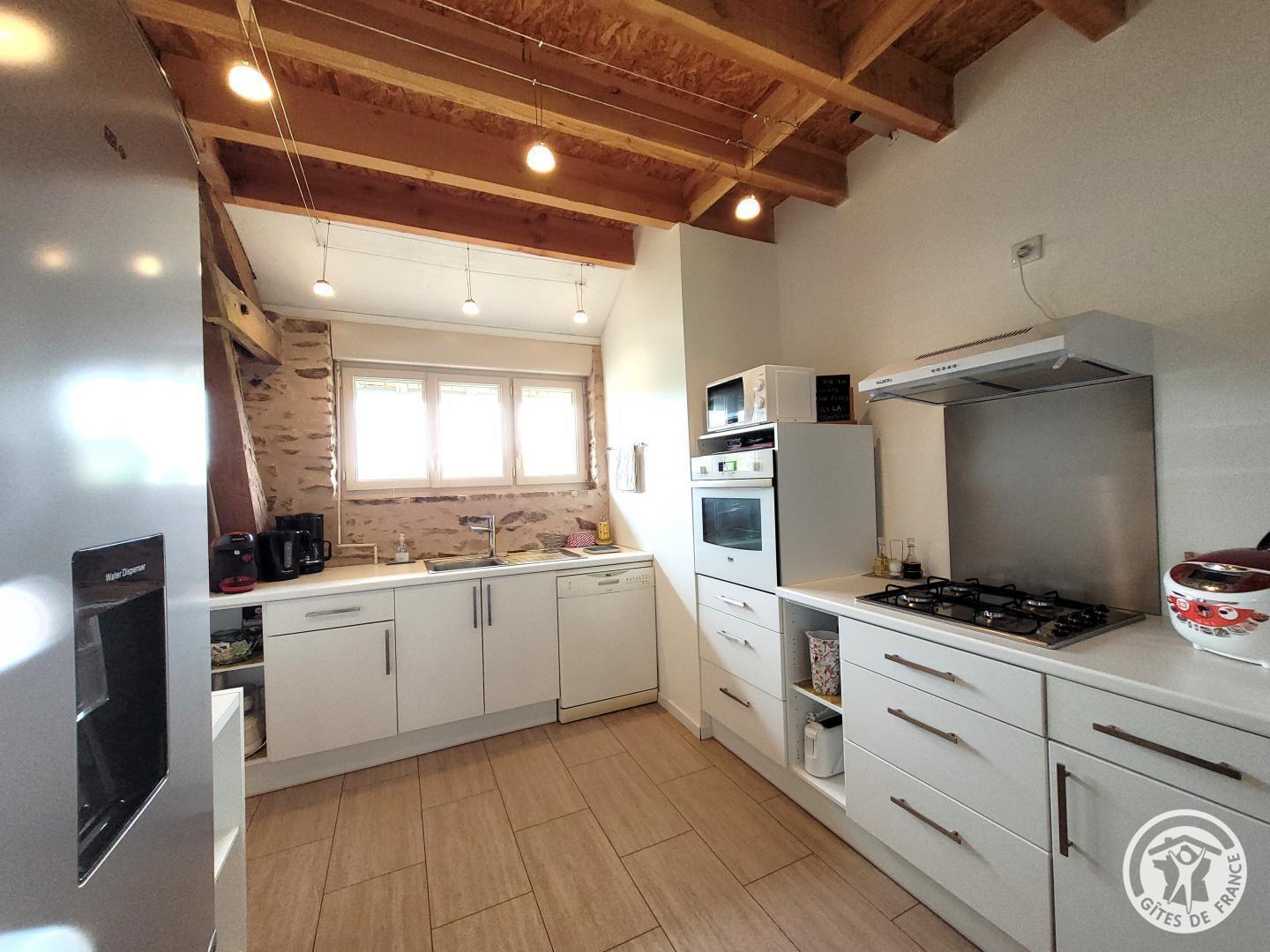 A l'étage : 1 salon avec canapé d'angle, livres, jeux de société,wifi fibre,enceinte connectée/salle à manger/cuisine plaque 4 feux à gaz, un micro-ondes, 2 cafetières, 1 bouilloire, un grille-pain, un service à raclette... , 1 salle d'eau, 1 WC indépendant avec lave main , une marche descendante une jolie chambre avec lit de 160x200 avec un accès direct à la terrasse.